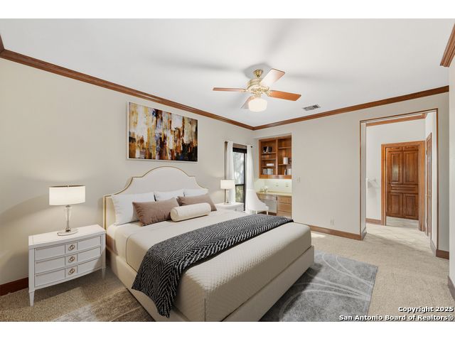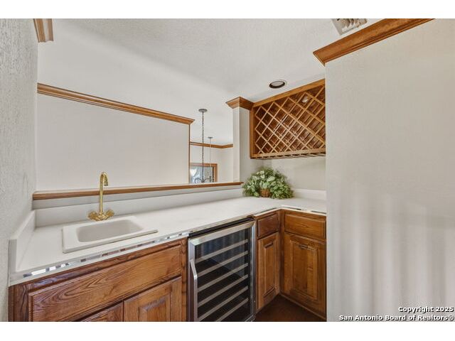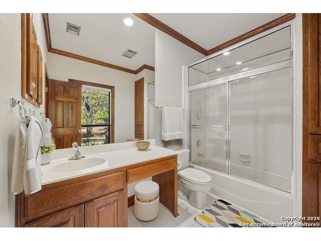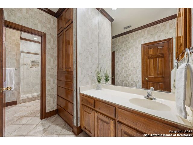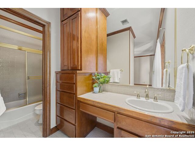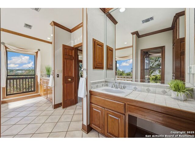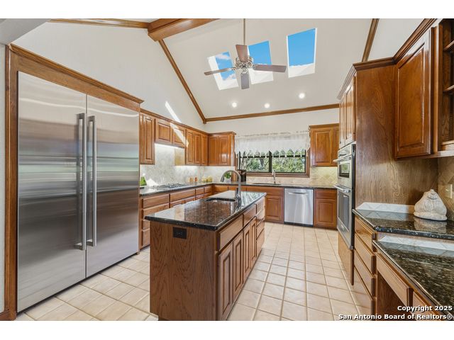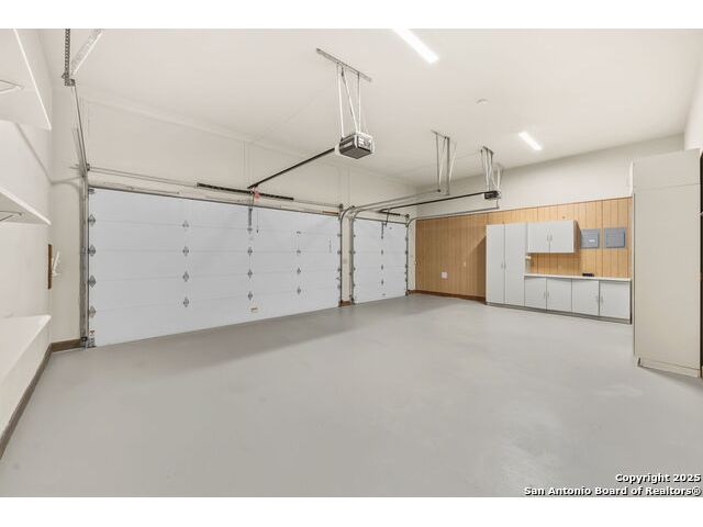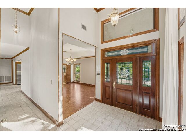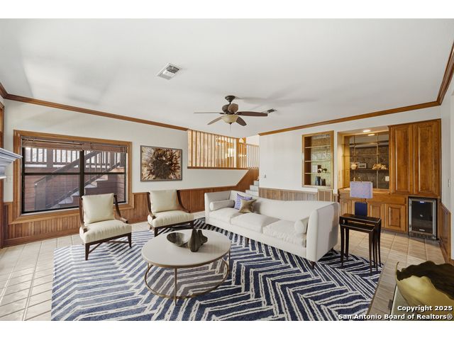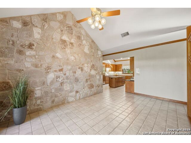 Picture arriving at this Texas Hill Country home tucked into a beautifully treed setting, with an inviting outdoor oasis waiting quietly behind the house. A separate detached studio or flex space adds versatility to the property. Easy guest suite with an additional of a bathroom. The sparkling, geometric-shaped pool glistens in the sunlight, bordered by stone hardscaping and natural landscaping that create a peaceful sense of retreat. Multiple seating areas invite you to imagine long afternoons by the raised spa or gatherings with friends on the generous decking. Tiered planters, mature greenery, and stone retaining walls blend seamlessly with the Hill Country scenery. Following the stone pathway toward the covered front entry, you reach a beautifully detailed front door with sidelights-an elegant welcome that hints at the craftsmanship throughout the home. Crossing the threshold, you enter a foyer filled with natural light leading you toward the upper level, where the first living room becomes the heart of the home. Up a short set of wide wood steps, this dramatic gathering space opens under a vaulted tongue-and-groove ceiling with exposed beams. A floor-to-ceiling stone fireplace anchors the room, while large windows frame the surrounding treetops. Double glass doors lead to an elevated deck with sweeping Hill Country vistas-an ideal spot for morning coffee or unwinding in the evening. Just off this room, the wood-paneled study offers a quiet retreat, featuring extensive built-ins, shelving, cabinetry, and desk areas. The top level continues into the primary suite, a peaceful bedroom framed by a vaulted ceiling and a wall of windows. Double doors open to a balcony. In the en-suite bath, two large picture windows bring the scenery indoors, with dual vanities, a separate glass-block shower, a soaking tub, and a large walk-in closet with built-ins. Descending back to the main level, you will discover the kitchen. A center island anchors the room, skylights brighten the workspace, and granite countertops pair with travertine backsplashes. Stainless steel appliances, including a gas cooktop, and abundant cabinetry support everyday cooking. Just beyond, the breakfast area-with its floor-to-ceiling windows-creates an inviting spot for casual dining or stepping onto the deck for fresh air. To the right of the foyer, the formal dining room features warm wood flooring, a chandelier, and a full wall of glass-front cabinetry, ideal for hosting and offering direct access to the kitchen. Still on this level, you'll find a private secondary bedroom with its own en-suite bath. Nearby, the laundry room offers a sink, plenty of storage, and workspace, and from here, you enter the oversized garage, where the finished floor and built-in cabinetry make staying organized easy. From the kitchen, step down to the lower level where you will find the second living room that centers around a full stone fireplace with an extended mantel, along with built-in cabinetry, a wet bar, and durable tile flooring. You will also enjoy direct access to the pool area, blending indoor comfort with outdoor enjoyment. Beyond this living area, a hallway leads to three secondary bedrooms. Two share an updated Jack-and-Jill bath with separate vanities and a shared walk-in shower. The third bedroom has its own private en-suite bath, and each bedroom includes ceiling fans and large windows with natural light and views. Finally, the setting of this home enhances the experience further. Though close to every service and amenity San Antonio provides, its rural character offers wildlife, serenity, and the freedom of no HOA-giving you the rare opportunity to enjoy both convenience and nature.