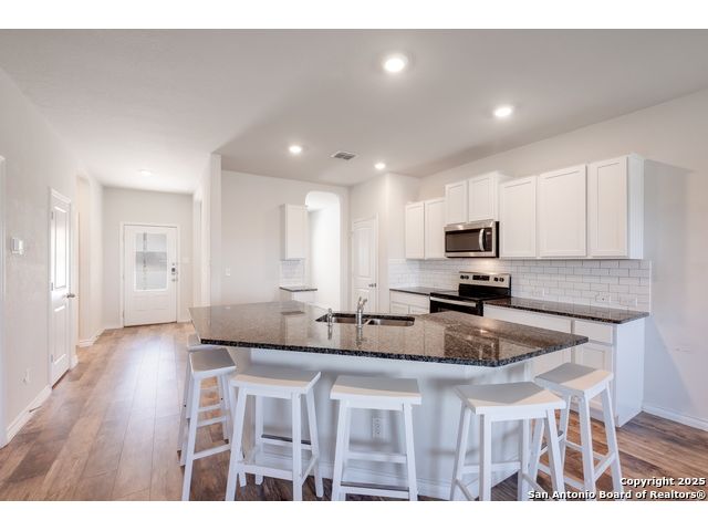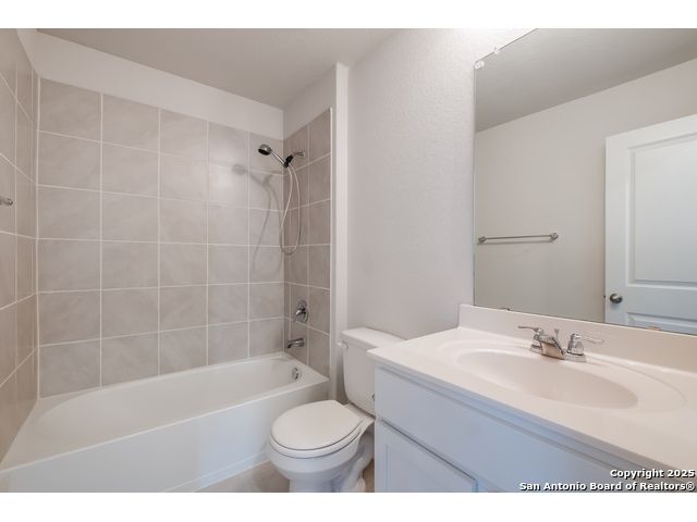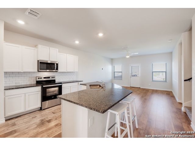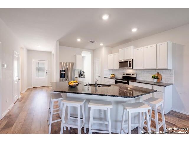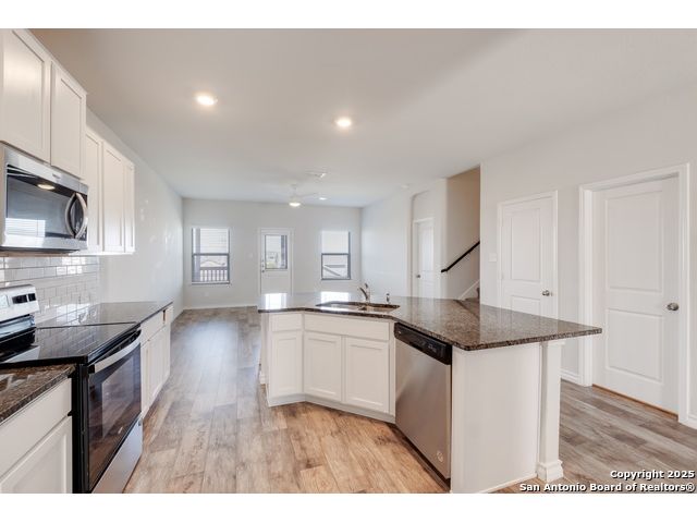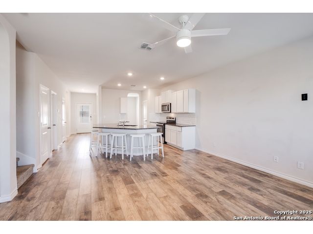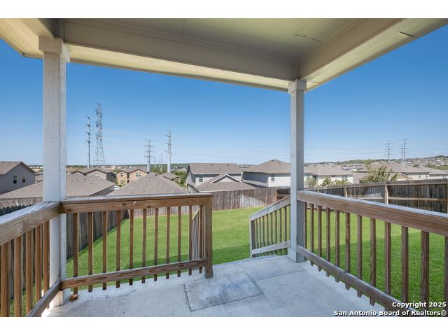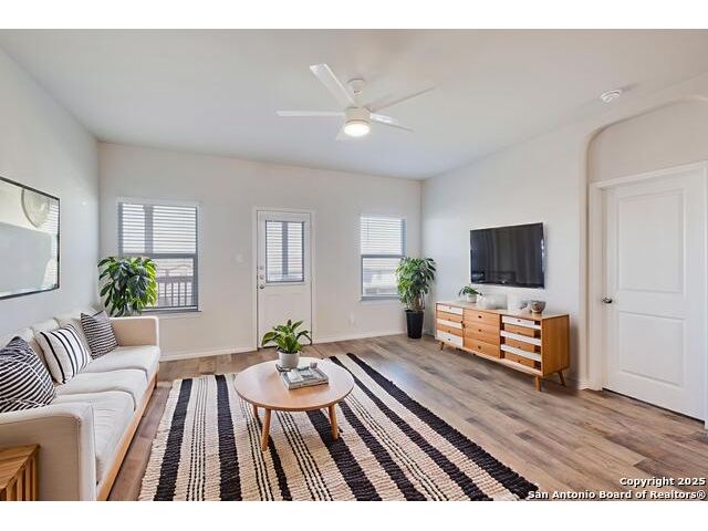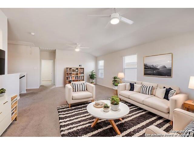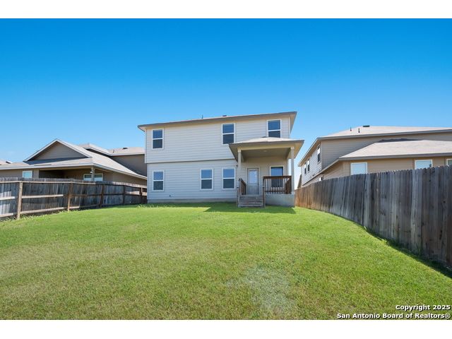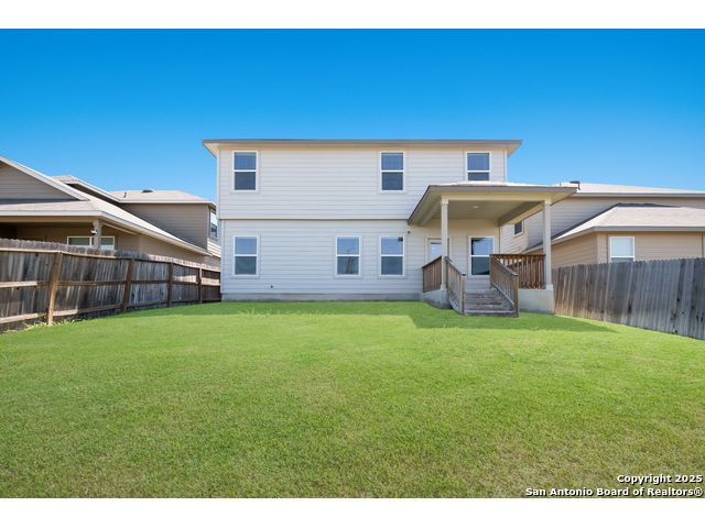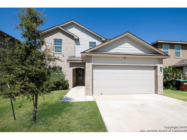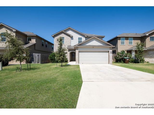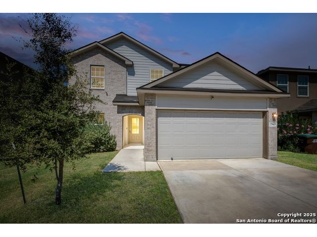 Welcome to this nearly new home, just minutes from Loop 1604 and Lackland AFB. From the curb, the brick exterior and established yard set a welcoming tone. Step inside to find a low-maintenance interior with vinyl plank flooring that carries through the main living areas. The entry opens to a flexible dining space that could also serve as a home office. Continue into the island kitchen, complete with a breakfast bar and open sightlines into the living area-perfect for everyday living and entertaining. From here, step outside to the covered patio and privacy-fenced yard for an easy extension of your living space. The primary suite is tucked downstairs, offering a spacious walk-in closet and a full bath with dual vanities, a soaking tub, and a separate shower. Upstairs, a large living area anchors four additional bedrooms, giving you plenty of room to spread out, work, or play. Additional features include a two-car garage with opener, arched doorways, faux wood blinds and more. This home combines modern convenience with room to grow-ready for its next chapter with a new owner. Same day showings available!
