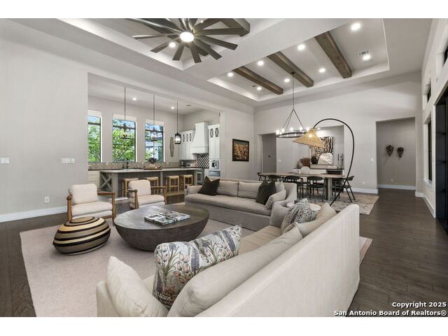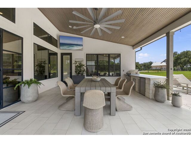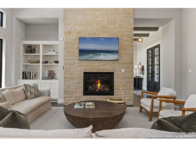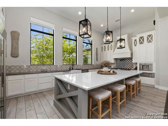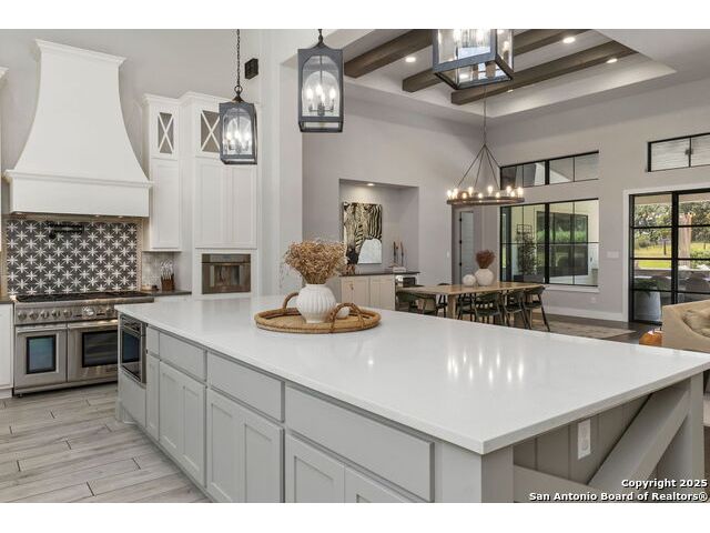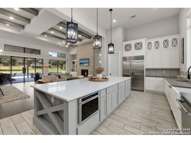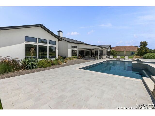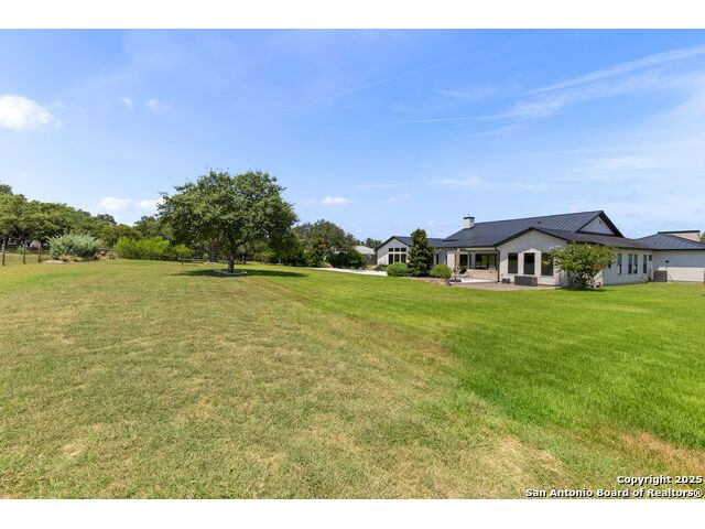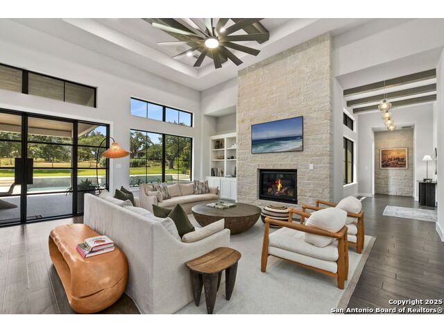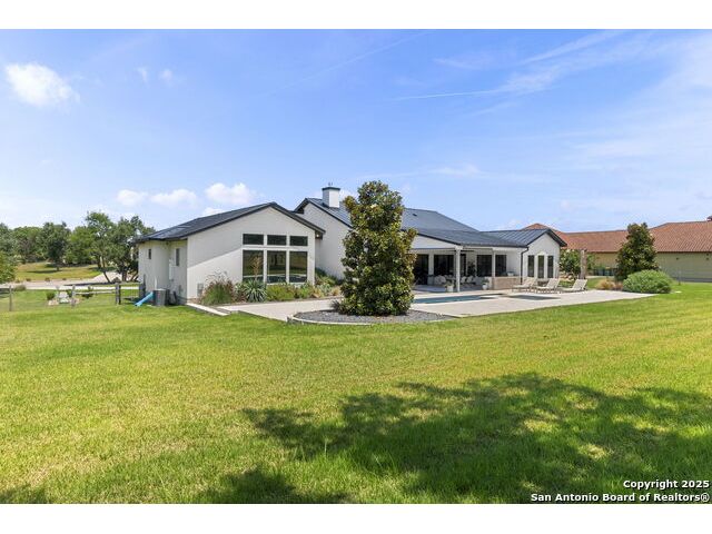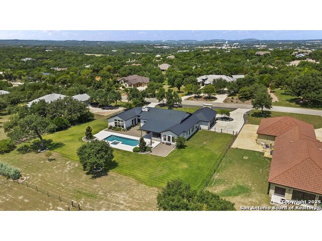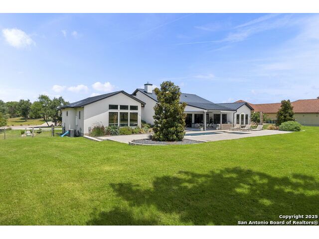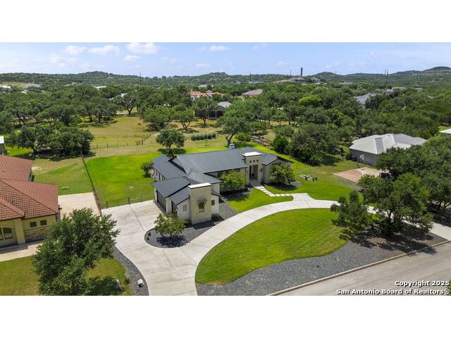 Experience refined Texas Hill Country living in this stunning single-story modern farmhouse perched on a picturesque acre in The Bristow of Upper Balcones. Sunlit spaces, soaring ceilings, and natural textures create a warm yet sophisticated retreat for those seeking a harmonious blend of elegance and comfort. At the heart of this welcoming residence is an open-concept living space, beautifully anchored by a striking floor-to-ceiling stone fireplace. The gourmet kitchen is a delight, showcasing an oversized quartz-topped island, top-tier Thermador and Sub-Zero appliances, and designer finishes that elevate everyday dining. Multiple dining areas provide versatility for entertaining, including a newly built, well-appointed covered outdoor kitchen and dining space that invites alfresco gatherings. Enjoy picturesque views of the sparkling pool, spa, and sprawling lawn visible from both the living room and kitchen, enhancing the seamless connection between indoor and outdoor living. The flexible layout features a private primary suite and guest quarters on one side-ideal for visitors or as a potential office space-while two additional bedrooms, a stylish den, and a cozy study occupy the opposite wing. The side-entry three-car garage offers discreet access and ample storage, adding to the home's smart design. With its remarkable curb appeal and meticulous attention to detail, this property is a true gem. Conveniently located just minutes from the I-10 corridor, you can easily access the vibrant city of San Antonio or explore the enchanting Texas Hill Country.