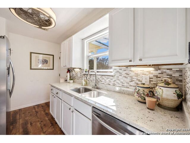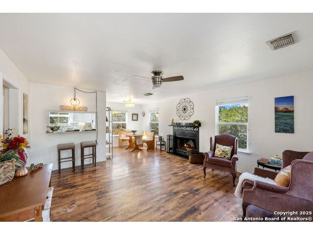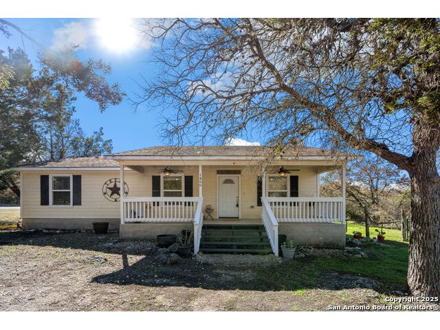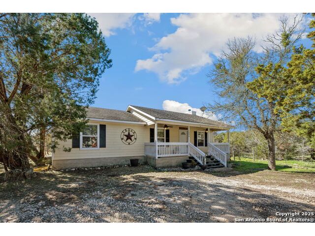 Welcome to your Texas hill-country cottage in Cypress Cove! This move-in ready 3-bed, 2-bath home is situated on a beautiful spacious corner lot with mature oaks and cedar trees, with a relaxing covered front porch inviting you in! Brand new HVAC unit!! Upon entry, the open floor plan greets you along with a cozy wood-burning fireplace, perfect for Texas winters! This home has been partially updated, including granite countertops and stone backsplash tile in kitchen and both bathrooms, new hardware and lighting fixtures, and stainless steel appliances! Interior walls have been freshly painted and the entire exterior of home freshly washed. Washer, dryer and refrigerator are all available to stay with the home if the buyer wants them. Water softener is a nice extra feature, a must-have in the hill country! Through the kitchen is the entrance to the back deck where you can either relax with your morning coffee or just enjoy family gatherings with plenty of space and privacy! The property is fenced on all but one side, but may be enclosed to create more privacy! Dog door built into back door, an added convenience for your pet. This home has all you need to enjoy the full benefits of hill country living! Convenient nearby access to Boat Ramp 11 (Guadalupe River feeding into Canyon Lake) approximately a mile away! Cypress Cove amenities include a community park, swimming pool, BBQ grilling, basketball and tennis courts, and a fishing pond. Centrally located with ease of access to San Antonio, New Braunfels, Boerne, San Marcos, Austin and the Canyon Lake Hill country area. Contact your agent to schedule your showing today, take a look around, and fall in love with your very own slice of the Texas hill country!!