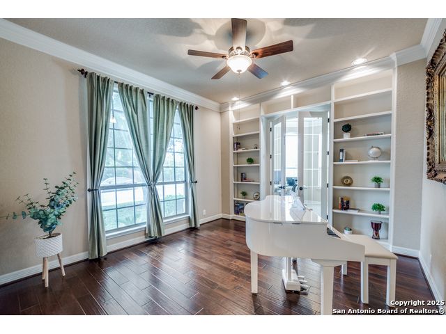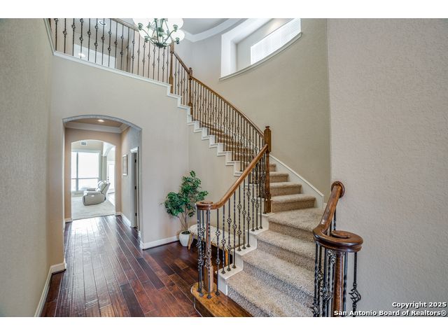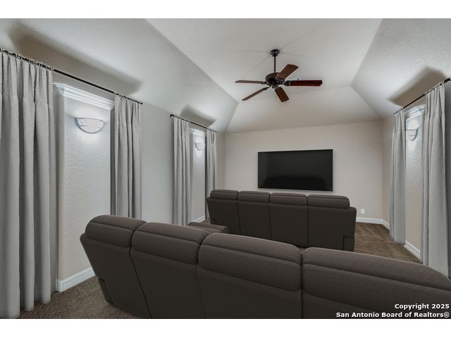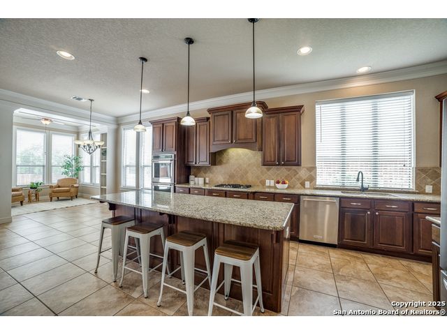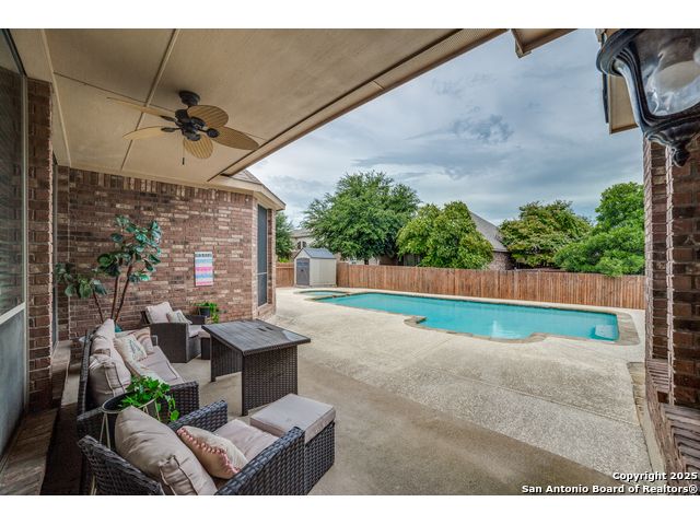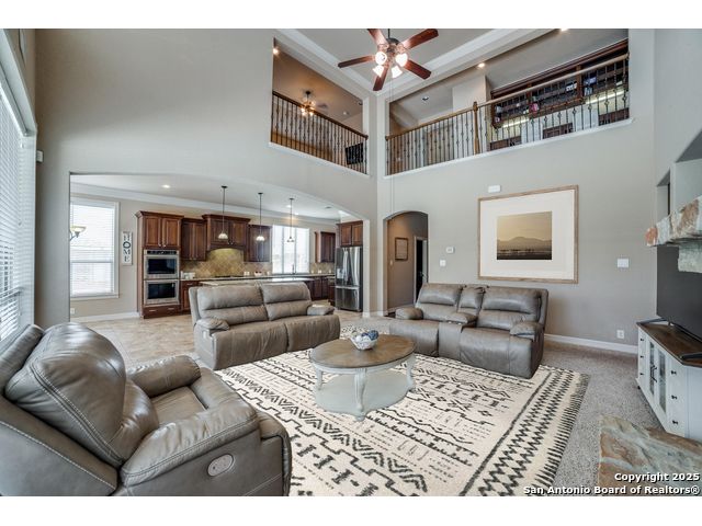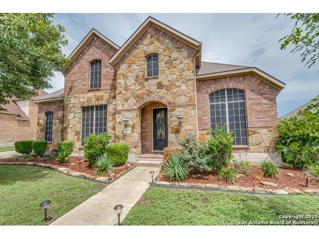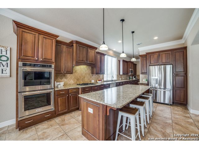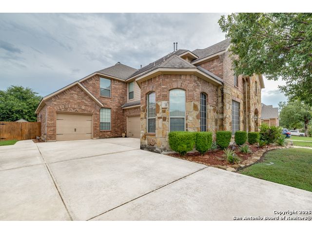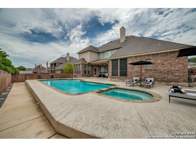 This beautifully designed, two-story home features 5 bedrooms, 4.5 baths, and a 3-car garage in a gated community. As you drive up you will be welcomed by the home's superb curb appeal. Inside, are high ceilings, lots of natural lighting and an expansive open floorplan. The living room features a floor-to-ceiling stone fireplace and unobstructed views of the backyard pool. The kitchen is a chef's dream with a spacious island, bar seating, ample counter and cabinet space, a gas cook-top, double ovens, and a walk-in pantry. Adjacent to the kitchen is a cozy eat-in area with a sitting nook. The primary suite, an additional guest suite, and a home office are located downstairs. The primary bedroom offers a walk-in closet and a luxurious en-suite bathroom with a large dual vanity, glass walk-in shower, and garden tub. Upstairs you'll find a game room, a theatre room and additional bedrooms provide ample space for relaxation and entertainment. Outside, a covered patio overlooks a large in-ground pool and adjoining spa, perfect for enjoying outdoor living.