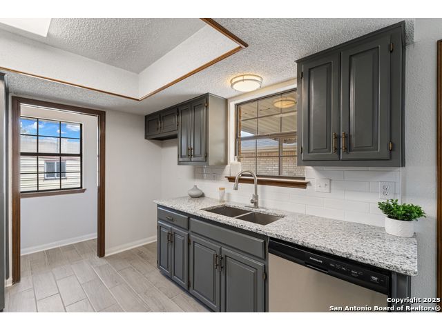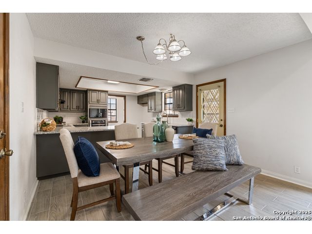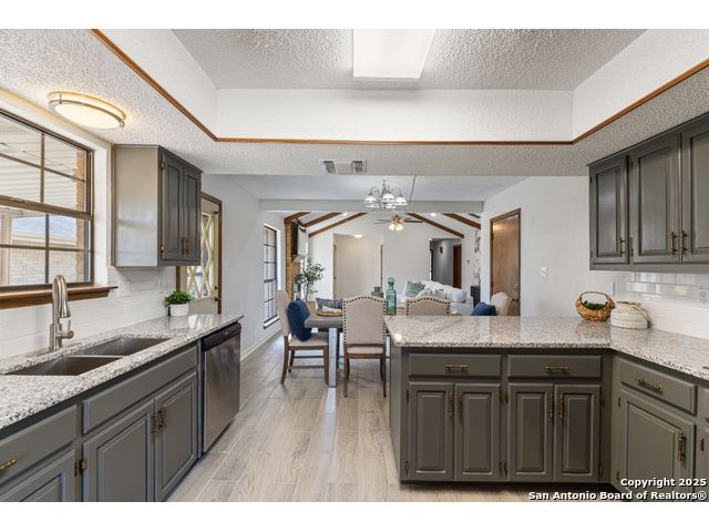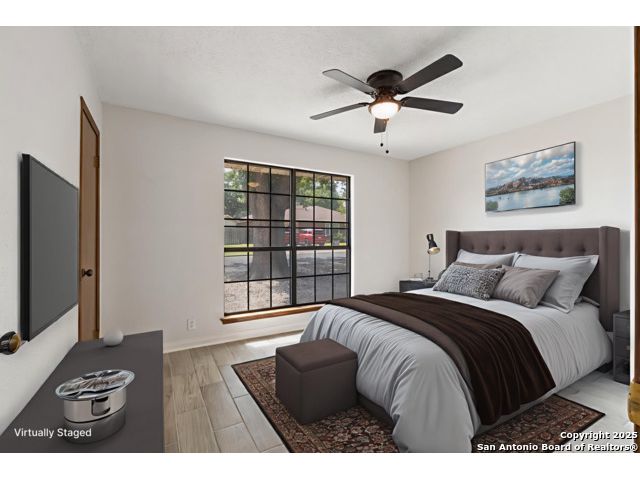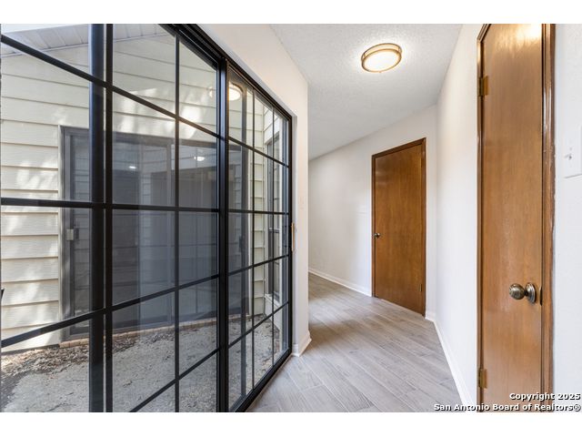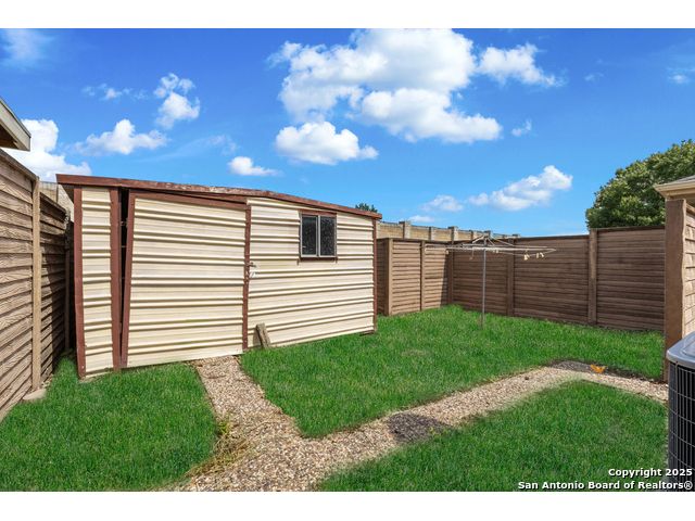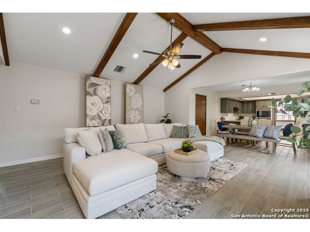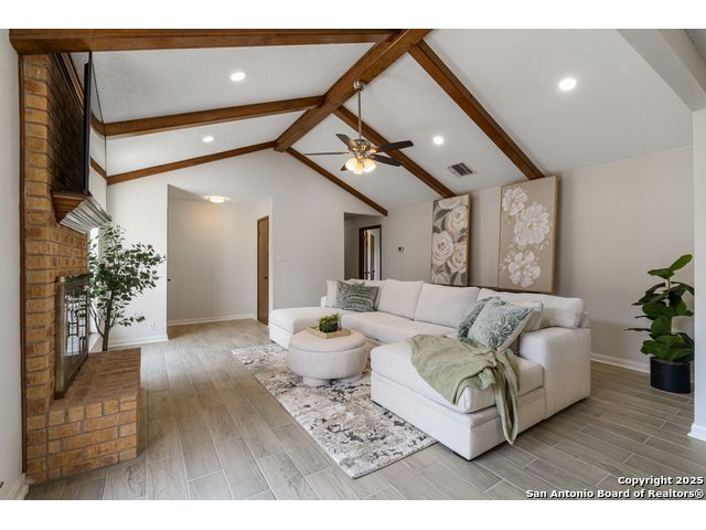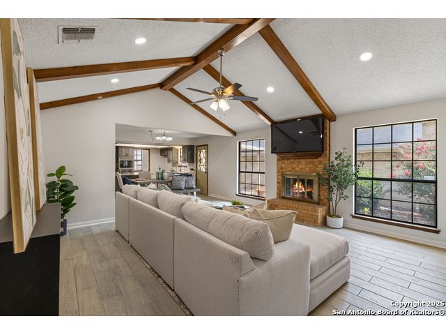 Step into this charming and unique home in the heart of Schertz, offering no carpet and easy-to-maintain landscaping. The open-concept floor plan features ceramic tile flooring throughout, creating a clean and cohesive look. Enjoy soaring ceilings with rustic wood beams and a cozy wood-burning fireplace that anchors the spacious living area. The primary suite includes a skylight and a private atrium-an ideal space to unwind with a good book or morning coffee. Located just minutes from I-35, Randolph AFB, and local shopping, this home is nestled in a quiet, established community with no HOA-a rare find in such a convenient location.
