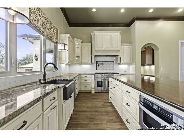 Welcome to your dream retreat, a stunning 4,400 square foot TA French Custom home nestled in the exclusive gated Provence Section of Vintage Oaks. As you step through the elegant iron double doors, a grand foyer welcomes you into a world of luxury and comfort. The heart of this magnificent residence is the expansive Family/Living Room, featuring a cozy fireplace and direct access to a private patio. Here, you can unwind by a tranquil water fountain, sipping your morning coffee or enjoying an evening glass of wine. An entertainer's paradise awaits in the open Chef's Kitchen, equipped with top-of-the-line Thermador appliances, including a 6-burner gas stove, dual ovens, and a convenient pot filler. Two grand islands provide ample space for meal preparation and casual dining, while cornered lighted curio cabinets add a touch of elegance. The kitchen is complete with two charming copper sinks and a spacious walk-in pantry. The adjacent dining room is perfect for hosting gatherings, accommodating even the largest of tables and surrounded by windows that flood the space with natural light. For relaxation or entertainment, slide open the barn doors from the Family/Living Room to reveal a versatile Mancave or Game room. This additional living space boasts a full bar with a wine fridge and ice maker, plus another inviting fireplace. The Owner's Suite is a sanctuary of luxury, featuring French doors that lead to an opulent primary bath. Indulge in the copper tub beneath a walk-around domed ceiling shower, enjoy double vanities, and revel in the convenience of two primary closets. The three additional bedrooms at the front of the home are all en suite, with one adaptable as an office if desired. Outside, your backyard oasis awaits. Dive into the inviting pool with its breathtaking rock waterfall, gather around the cozy fire pit, or relax on the spacious covered patio with yet another fireplace. This home offers ample parking with an oversized 3-car garage and extended driveway space. It's also designed for energy efficiency with two tankless water heaters and foam insulation. As part of this vibrant community, residents enjoy resort-style amenities including a Tuscan-inspired clubhouse, sparkling pools, a lazy river, fitness center, sports courts, scenic trails, and an array of community events. Experience unparalleled luxury and elegance in this remarkable home that perfectly blends functionality with exquisite design.