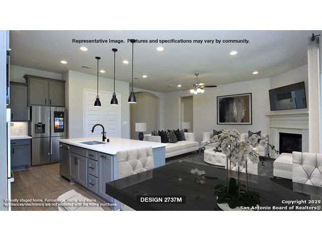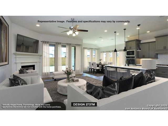 Generous front porch opens to entry with 12-foot ceilings. Home office frames the entry with French doors. Game room with French doors. Kitchen features an island with built-in seating space, two wall ovens, and a 5-burner gas cooktop. Spacious family room features a wood mantel fireplace and wall of windows. Private primary suite features three large windows. Primary bath features dual vanities, a garden tub, a separate glass-enclosed shower and a large walk-in closet. Guest suite with a full bath and a walk-in closet. Extended covered backyard patio. Two-car garage.