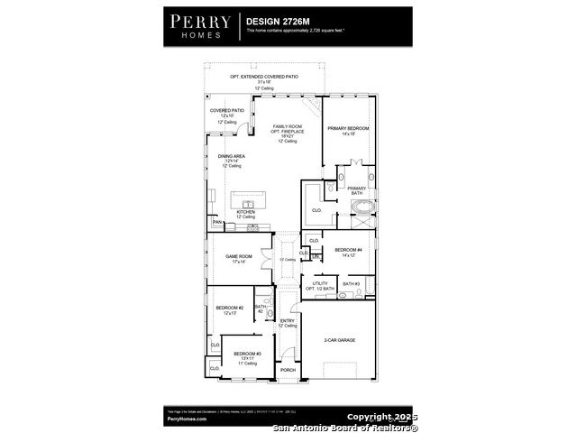 Entry welcomes with 12-foot ceiling. Hardwood floors throughout living areas. Game room off extended entry with 13-foot coffered ceiling. Spacious family room with a wood mantel fireplace and wall of windows opens to kitchen and dining area. Kitchen offers corner walk-in pantry, two wall ovens, 5-burner gas cooktop and island with built-in seating space. Primary suite includes bedroom with wall of windows. Double doors lead to primary bath with dual vanities, freestanding tub, separate glass-enclosed shower and walk-in closet. A guest suite with private bath adds to this four-bedroom design. Extended covered backyard patio. Two-car garage.