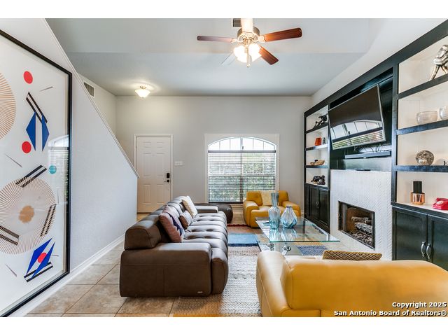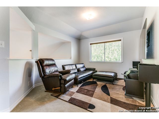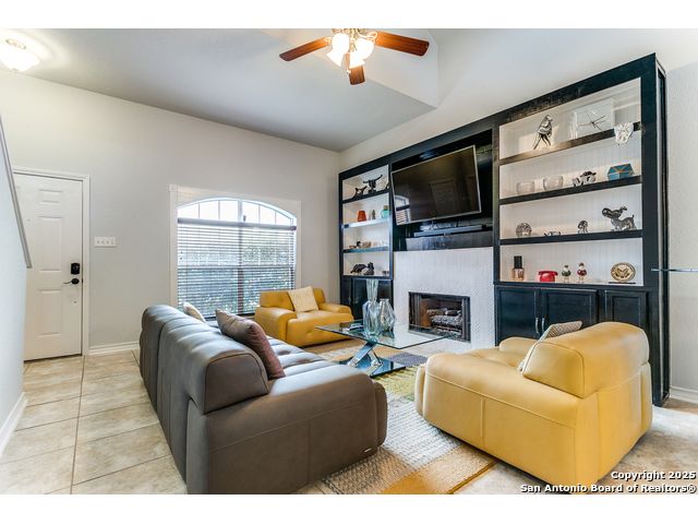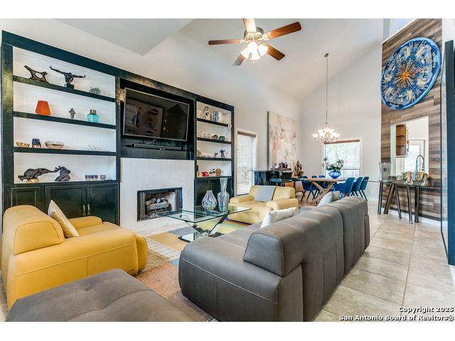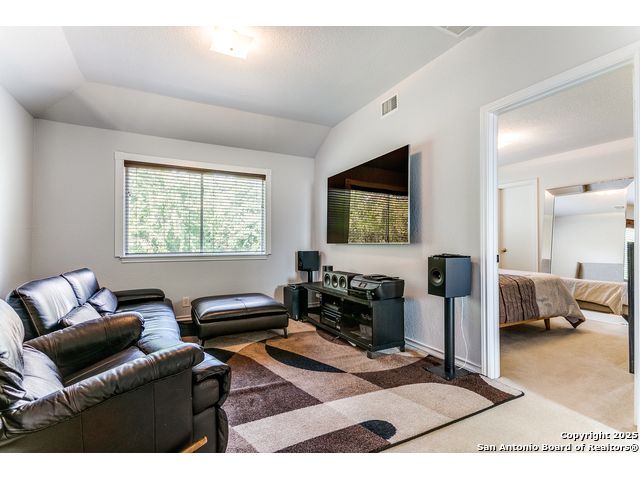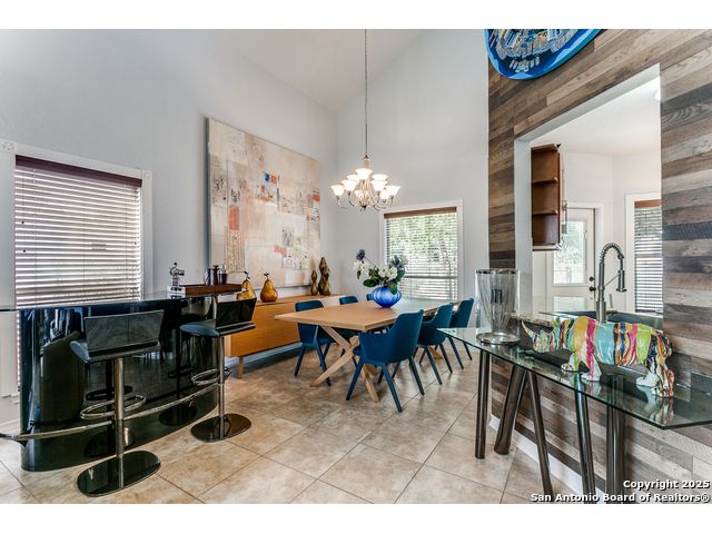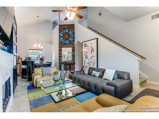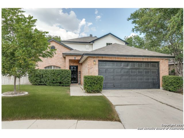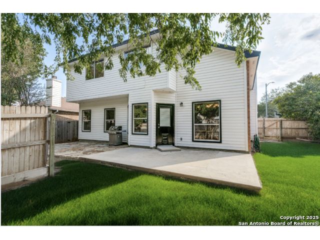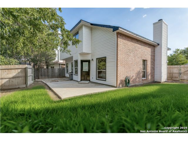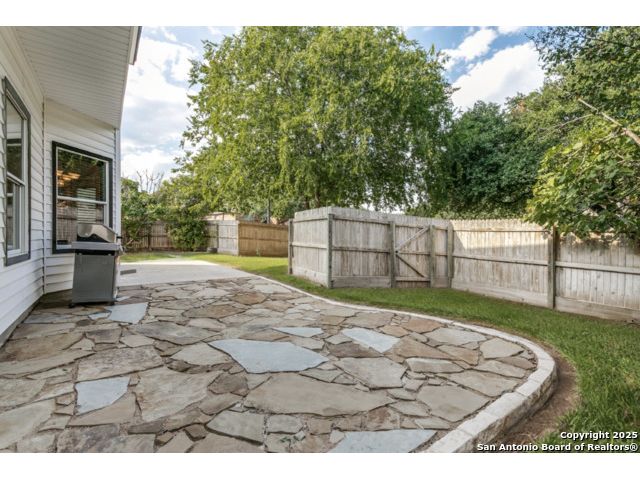 Fantastic location near Wurzbach Parkway, Hwy 281, the airport, library, and HEB! Just steps away from your private entrance to McAllister Park, where you can enjoy bike trails, playgrounds, soccer fields, and a dog park. This truly well-maintained home sits on a desirable 0.15-acre corner lot in a gated community with controlled access, offering both curb appeal and peace of mind. Inside, you'll be greeted by soaring 20-ft vaulted ceilings and a custom shiplap feature wall that fills the living and dining areas with natural light. The large eat-in kitchen is perfect for gatherings, offering granite countertops, pantry, stainless steel farmhouse sink, and a double-oven stove range. A convenient powder bath is located just across the kitchen. The owner's suite on the main level provides privacy and style with a spacious layout and a wainscoting accent wall. The luxurious bath features a double granite vanity, garden tub, and walk-in shower. Upstairs, a flexible loft offers room for a second living space, home office, or playroom. The secondary bedrooms are generously sized, and the guest bath enjoys natural light from a tempered glass window. Step outside to a large backyard retreat with a flagstone patio, extended slab, and a variety of fruit trees including pecan, peach, and fig. Best of all, fully paid-off solar panels, giving you immediate savings on your electric bills and eco-friendly living without the burden of a loan or lease. Come see this unique home and fall in love with the perfect balance of comfort, efficiency, and location!