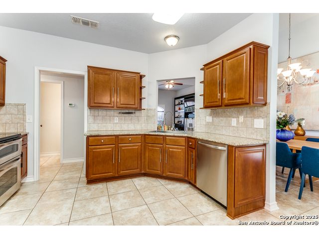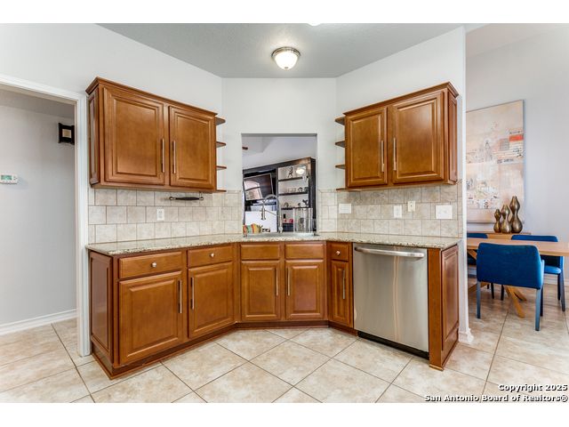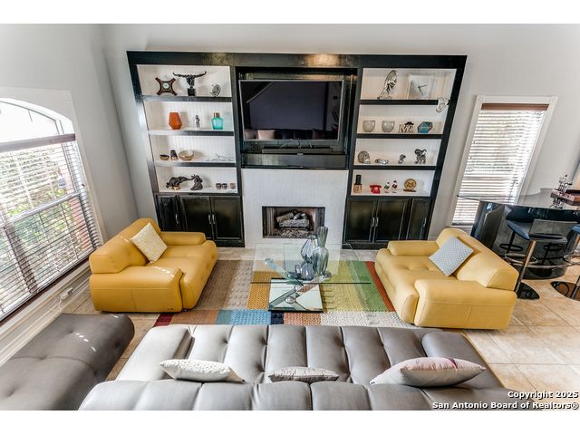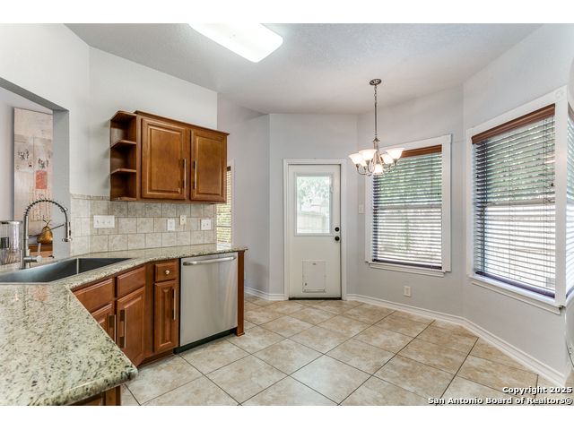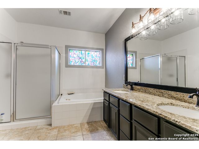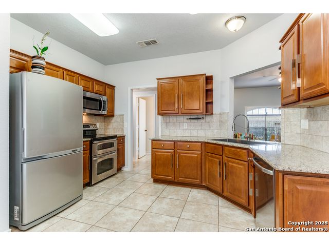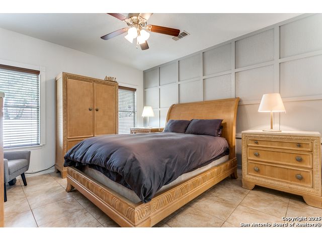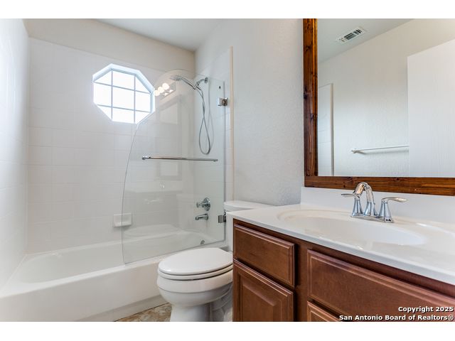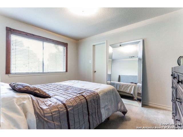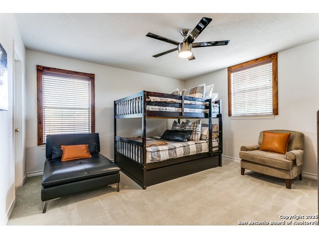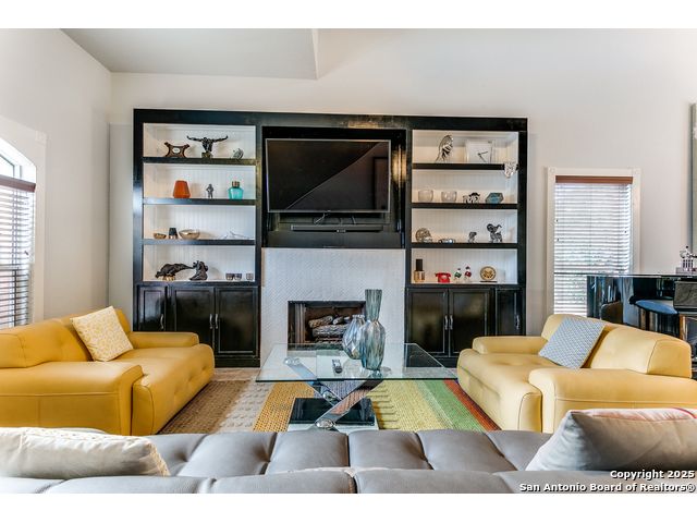Fantastic location near Wurzbach Parkway, Hwy 281, the airport, library, and HEB! Just steps away from your private entrance to McAllister Park, where you can enjoy bike trails, playgrounds, soccer fields, and a dog park. This truly well-maintained home sits on a desirable 0.15-acre corner lot in a gated community with controlled access, offering both curb appeal and peace of mind. Inside, you'll be greeted by soaring 20-ft vaulted ceilings and a custom shiplap feature wall that fills the living and dining areas with natural light. The large eat-in kitchen is perfect for gatherings, offering granite countertops, pantry, stainless steel farmhouse sink, and a double-oven stove range. A convenient powder bath is located just across the kitchen. The owner's suite on the main level provides privacy and style with a spacious layout and a wainscoting accent wall. The luxurious bath features a double granite vanity, garden tub, and walk-in shower. Upstairs, a flexible loft offers room for a second living space, home office, or playroom. The secondary bedrooms are generously sized, and the guest bath enjoys natural light from a tempered glass window. Step outside to a large backyard retreat with a flagstone patio, extended slab, and a variety of fruit trees including pecan, peach, and fig. Best of all, fully paid-off solar panels, giving you immediate savings on your electric bills and eco-friendly living without the burden of a loan or lease. Come see this unique home and fall in love with the perfect balance of comfort, efficiency, and location!
