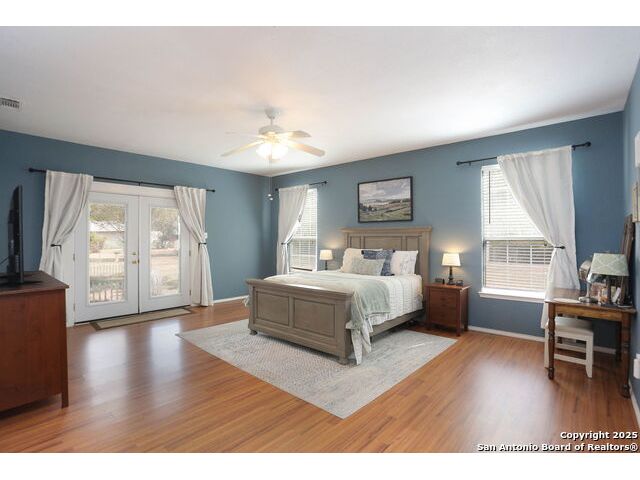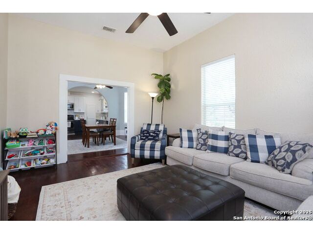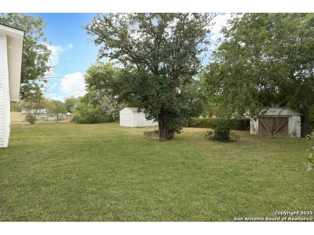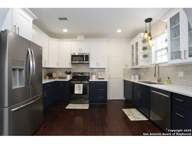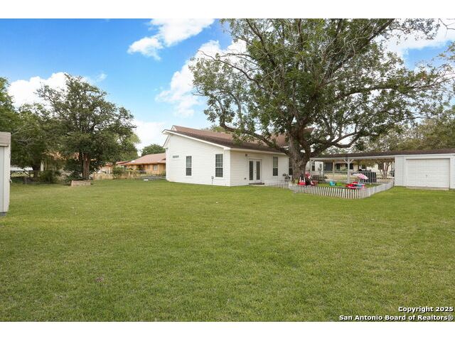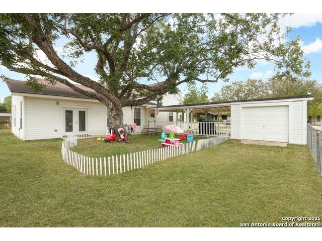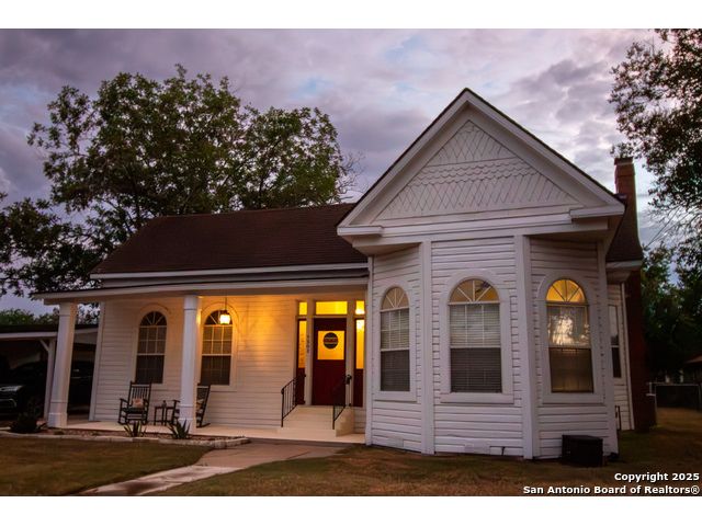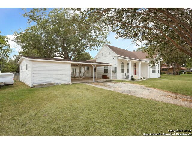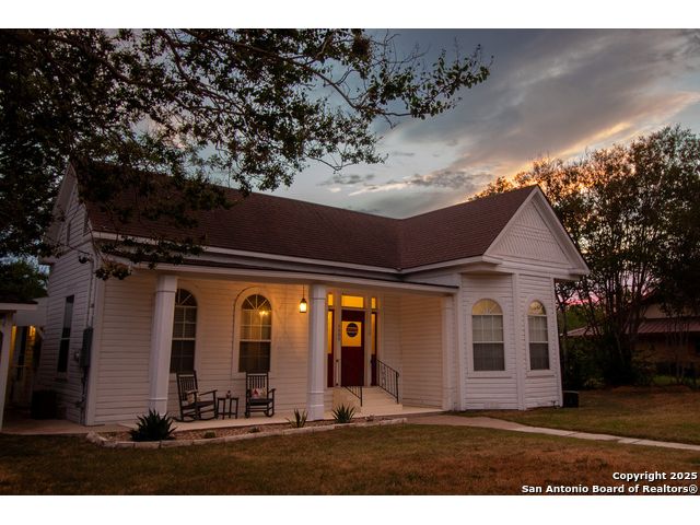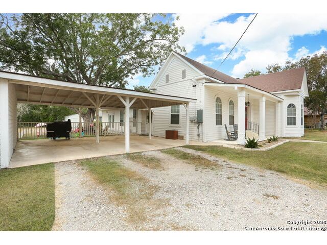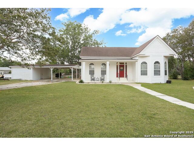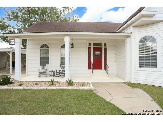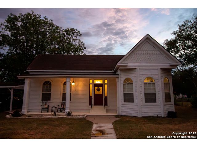 Welcome home to this Victorian charmer, complete with refinished, original hardwood floors, graceful high ceilings, light-enhancing transom windows, curved & squared room transitions, and stunning updates in the kitchen and primary bedroom & bath. The stately front porch beckons visitors to "sit a spell" and the original front door and side lights welcome one and all. The light-filled living and dining areas are ideal for large gatherings or intimate settings, and the tasteful kitchen remodel in 2021 yielded generous storage and countertop space. Glass-front cupboards, recessed lighting, dual color cabinets and modern appliances compliment the vintage feel of the early 1900s. The primary bedroom offers an expansive, updated walk-in shower, dual walk-in closets, and exterior access to the backyard. The neutral palette is enhanced by the white ceilings and accented period colours in two of the bedrooms; the various floor and ceiling mouldings speak to the history and beauty of a bygone era. The two-car carport connects the home to the one-car garage (currently used for storage, but easily re-converted to parking, if desired) and the approximate .6 acre lot hosts mature pecan & native shade trees, with plenty of open space for gardening, backyard entertaining or a future detached dwelling. Additional seller updates not pictured include spray foam insulation under the original hardwood floors, updated electrical grounding, and complete replacement of both interior and exterior electrical panels. Nearby attractions include the 2.5 mile paved El Camino Trail and Historic Downtown Floresville with its annual Peanut Festival, local restaurants and shopping district. Schedule your showing today!