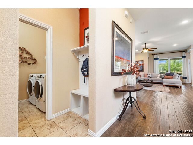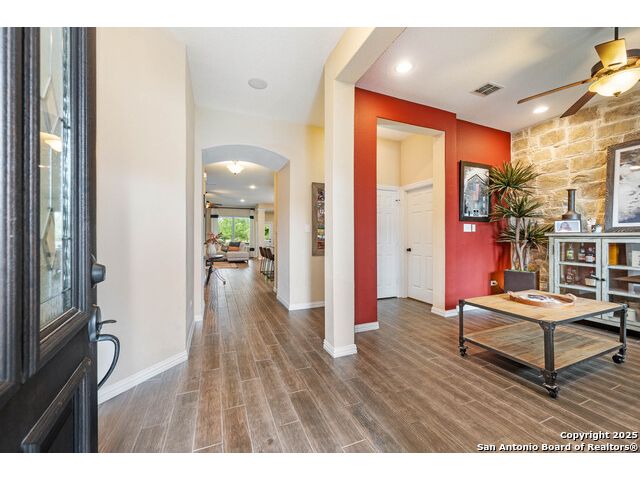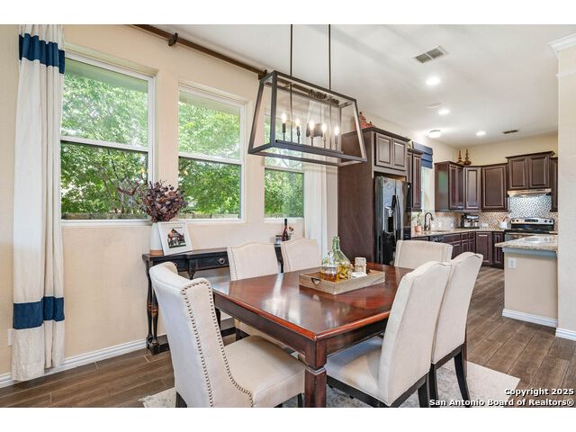 QUALIFYING VA ASSUMPTION: 2.75 rate! Welcome to this stunning former David Weekley model home in the sought-after community of The Crossvine, just minutes from Randolph Air Force Base. This thoughtfully designed 1.5-story residence features 3 spacious bedrooms, 2 full baths, and 2 half baths, with an abundance of builder upgrades and versatile living spaces throughout. The heart of the home is the large island kitchen, offering expansive counter space, abundant cabinetry, and storage that makes both cooking and entertaining a breeze. The open-concept layout flows seamlessly into multiple living and dining areas, while a loft-style second living space provides the perfect spot for a media room, playroom, or home office. Model-home upgrades include surround sound throughout, upgraded finishes, and smart design elements that enhance both style and function. Outdoor living is just as inviting with a covered patio, front and back sprinkler systems, and plenty of room to relax or entertain. Located in one of the area's premier master-planned communities, residents of The Crossvine enjoy a vibrant neighborhood lifestyle with parks, walking trails, and gathering spaces, all while being close to schools, shopping, and major commuter routes. This rare former model blends thoughtful design, modern upgrades, and community living-ready for your next home.
