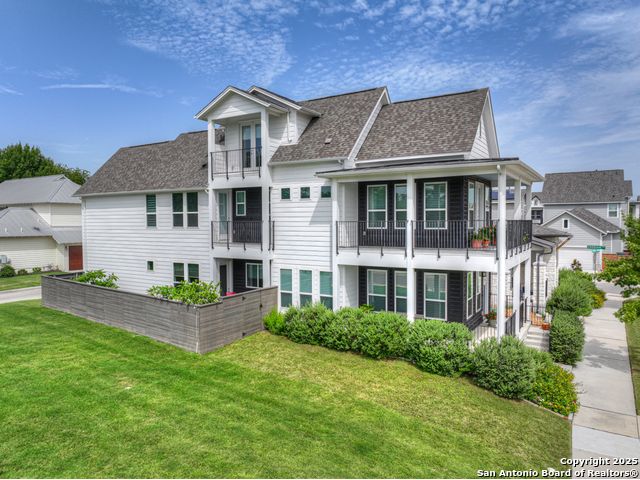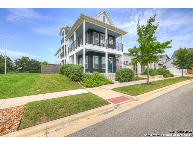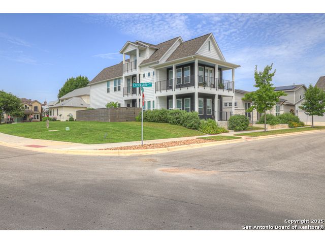 Welcome to this very stylish home in the highly desired Town Creek SD, just a short walk to historic downtown New Braunfels. This home offers 2 living areas PLUS a first floor office/study and a third floor loft/studio with balcony open to numerous possibilities! The wrap around porch offers a peaceful view of Comal Creek. The interior features engineered wood floors, custom blinds, dimmer switches, designer tiled baths and art lighting throughout. The designer kitchen offers Kitchenaid appliances ( ref stays) large Kohler sink, huge walk in pantry, under cabinet lighting and lower cabinet draws. First floor full bath is ADA accessible, if desired. The oversized garage features overhead storage rack, built in cabinet storage system, tool rack , tankless water heater and water softener. The first floor study offers access to a private yard with covered porch. Enjoy more beautiful creek views, the Landmark towers, St. Peter and Paul church steeple and Guenter St. bridge from your master balcony. which is also tiled and covered In addition, the second floor enjoys another living area with a balcony, the second and third BRs and laundry. The sideyard is adjoined by a green space with beautiful trees and creek just across the street. Don't miss these views from this beautiful and unique location within Town Creek.