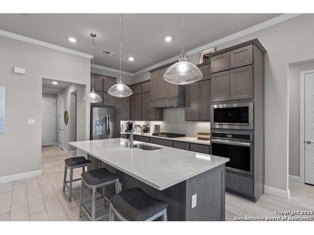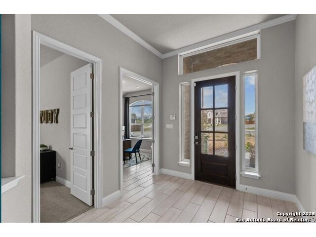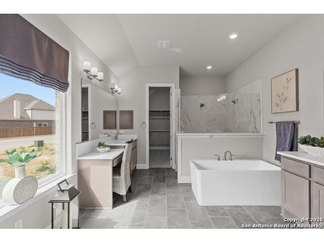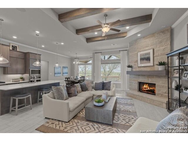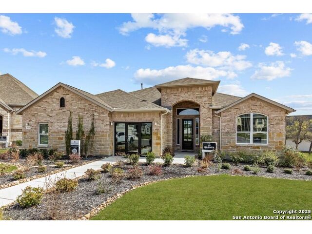 The Garner's covered entry and impressive foyer with soaring 12' ceiling flow into the expansive family room, with a view of the sought-after covered outdoor living beyond. The kitchen overlooks the dining area and the family room, which features a corner fireplace. A center island highlights the kitchen along with plenty of cabinet space, and a sizable walk-in pantry. The beautiful primary suite is complete with a tray ceiling, a large walk-in closet, a spacious bathroom with separate vanities, soaking tub, luxe glass-enclosed shower, and a private water closet. Secondary bedrooms feature walk-in closets, two with a shared full hall bath, one with a private full bath. Additional highlights include a versatile flex room, a game room, a powder bath, mudroom, and additional storage throughout!
