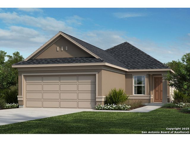This beautiful and inviting former model home features a charming Monterey-style entry door and Kwikset Polo interior hardware. The open floor plan offers 9-ft. ceilings and ceramic tile flooring throughout the bedrooms, kitchen, and great room. The stylish kitchen includes Woodmont Cody 42-in. upper cabinets, an Emser CatchTM glossy tile backsplash, Whirlpool stainless steel appliances, and a sleek Moen faucet. The primary bath features upgraded cabinets and a 42-in. garden tub/shower combo with Daltile tile surround. A wireless security system adds peace of mind, while the covered back patio provides the perfect space for relaxing or entertaining.