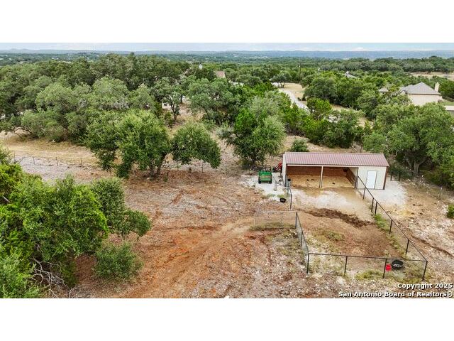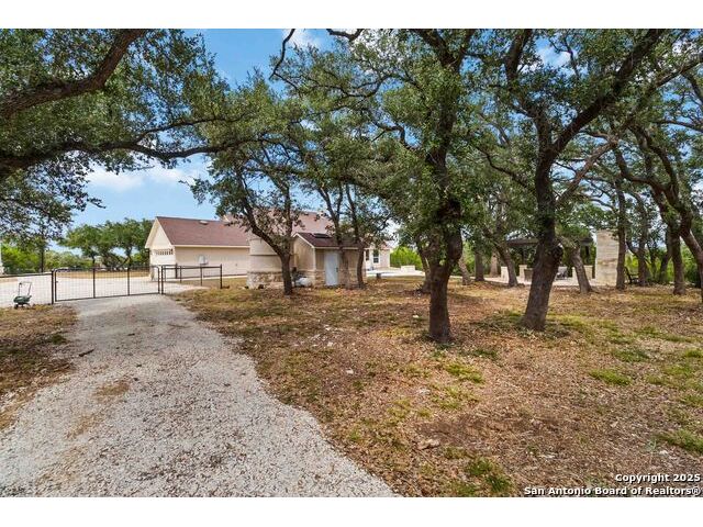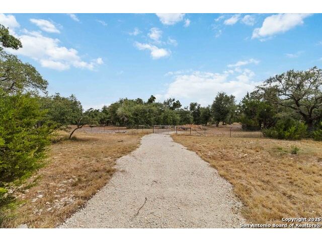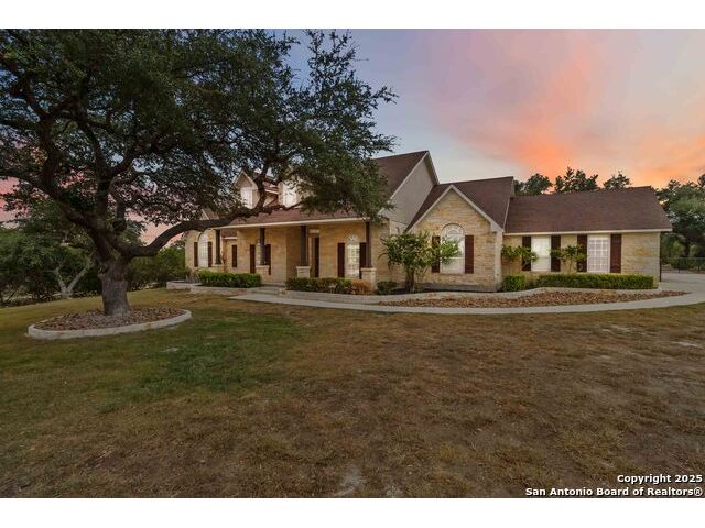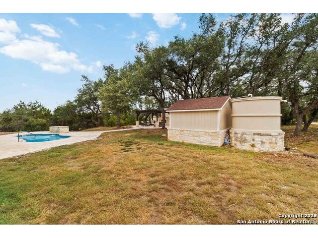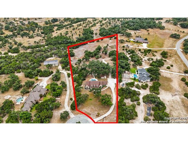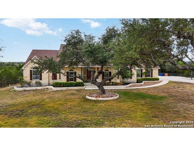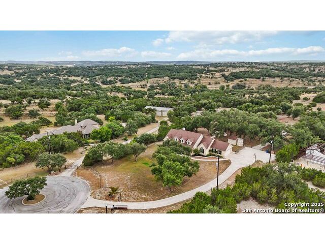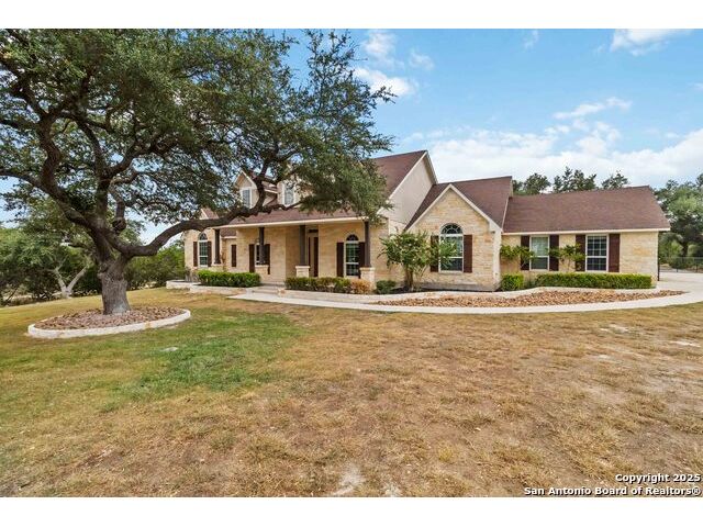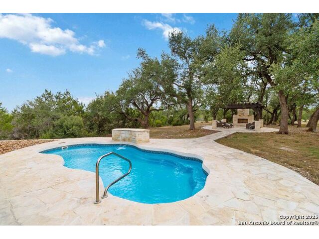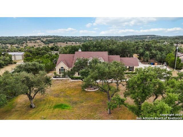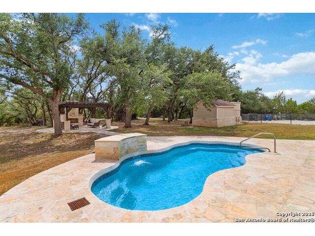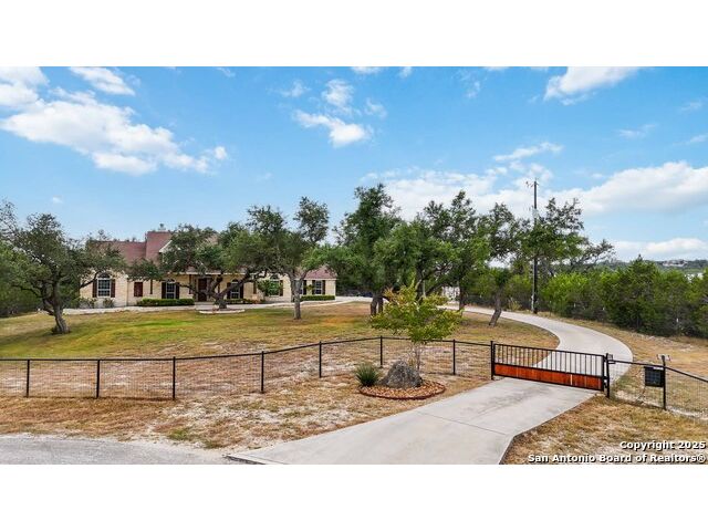 Nestled in the rolling hills of the Texas Hill Country, this 5.15-acre majestic oak tree studded estate is the desirable gated community of Rebecca Creek offering the perfect blend of country charm and refined living-all just under an hour from downtown San Antonio. As you enter through the electric gates and fully fenced grounds, you're welcomed into a private oasis designed for both equestrian enthusiasts and those who love to entertain. Horse lovers will appreciate the two-stall barn with tack room, corrals, and wide-open, cleared acreage for roaming. The backyard retreat is nothing short of extraordinary. A sparkling in-ground pool with a cascading waterfall sets a serene tone, while the expansive arbor and all-stone outdoor fireplace create a magical space for evenings under the stars. The stone-accented Hill Country-style residence greets you with a covered front porch spanning the length of the home. Inside, an open-concept design flows seamlessly across designer tile flooring, creating a bright and inviting atmosphere. The spacious living room, anchored by a cozy fireplace and built-in shelving, transitions effortlessly into the chef's kitchen featuring 42" cabinetry, stainless steel appliances, a breakfast bar, and walk-in pantry. The primary suite is a true retreat, offering a spa-like bath with a soaking tub and walk-in shower. Additional accommodations include a private guest suite with full bath, plus two secondary bedrooms sharing a Jack-and-Jill bath. A dedicated study, set behind French doors at the entry, provides a quiet space with views of the sprawling front landscape. This Canyon Lake estate offers the rare opportunity to embrace the best of Hill Country living-space for your horses, a backyard built for gatherings, and a beautifully designed home that balances rustic charm with modern comfort.