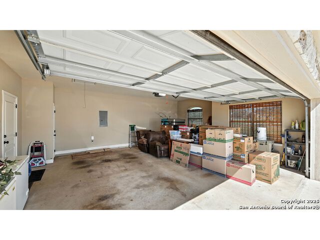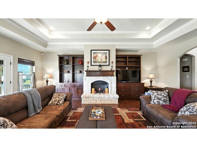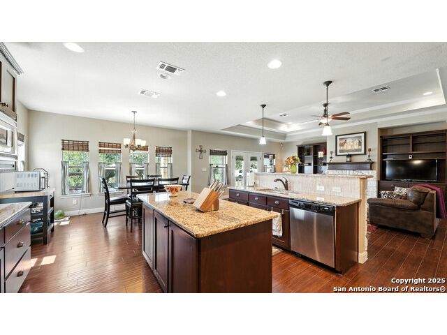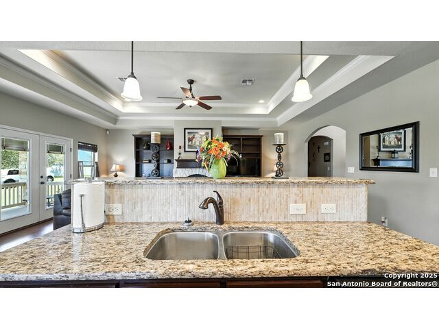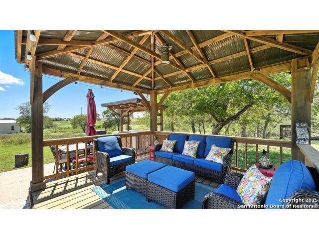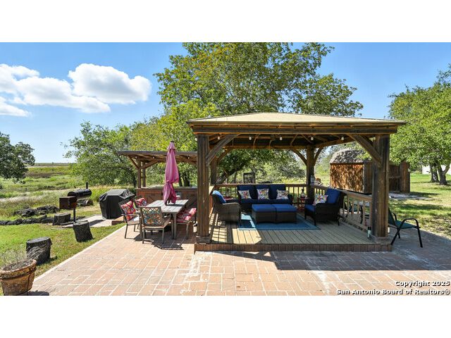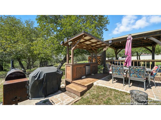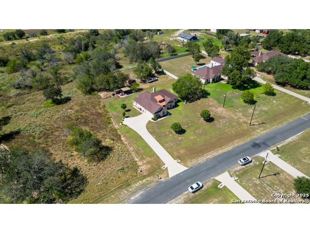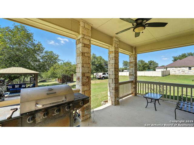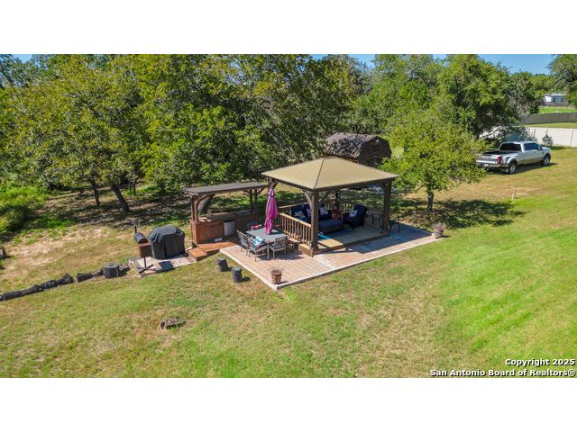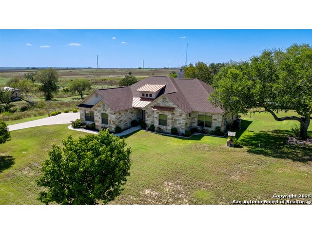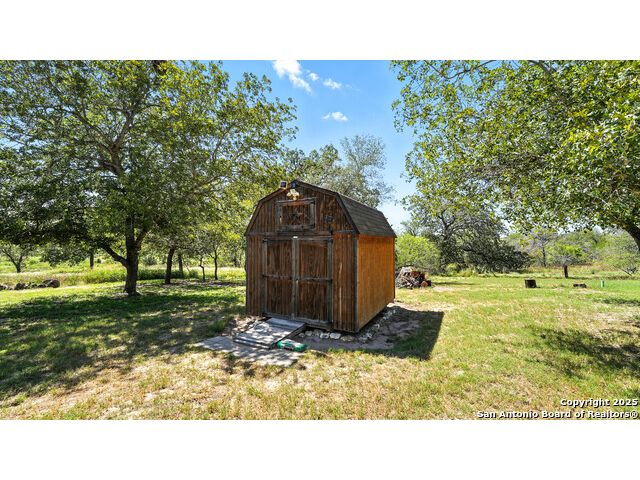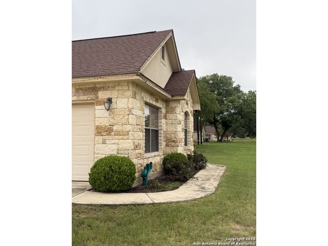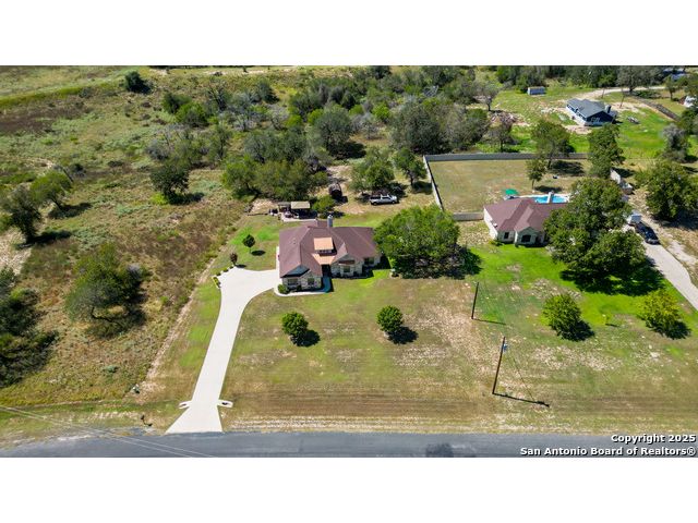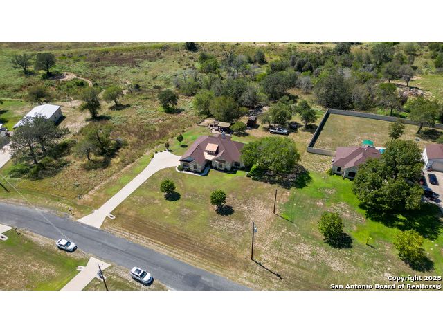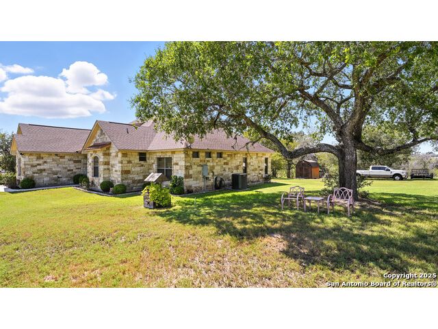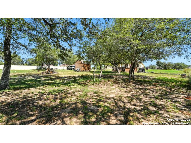 This well-appointed custom home features a spacious backyard shaded by mature oak trees, ideal for outdoor gatherings. A versatile backyard workshop offers potential for use as a "she-shed" or additional workspace. The residence includes three generously sized bedrooms, two full bathrooms, and an oversized two-car garage. The large living area boasts a wood-burning fireplace and seamlessly connects to the dining area and a chef's kitchen equipped with a large pantry and pot filler-perfect for preparing family meals. Additional amenities include a security system, refrigerator, and available generator access for power outages. The property has been meticulously maintained, and some furnishings are available for purchase. PVC lines have been installed and are ready for outdoor kitchen plumbing. No neighbors behind home, and the slab has a French drain to protect your slab foundation!