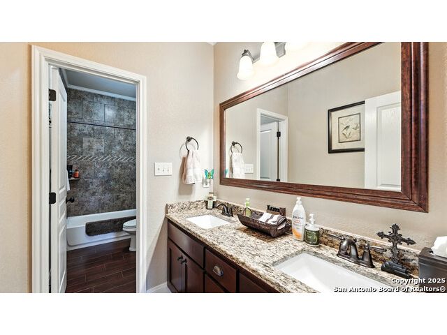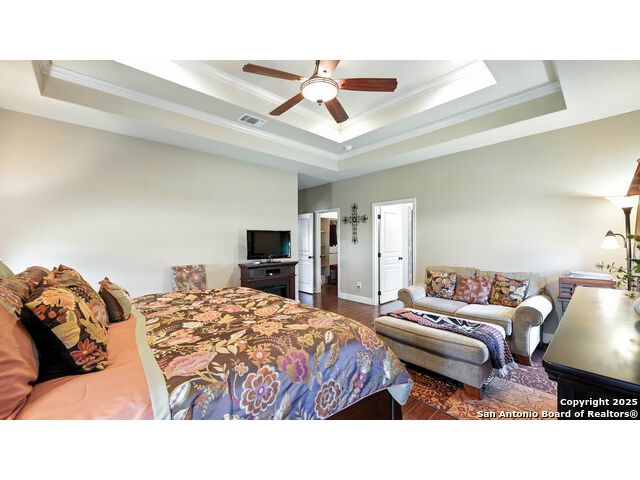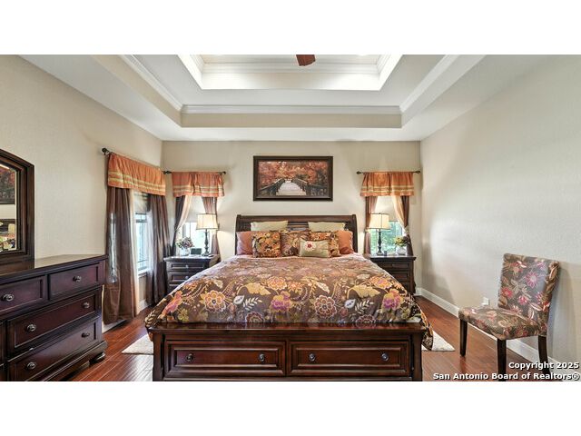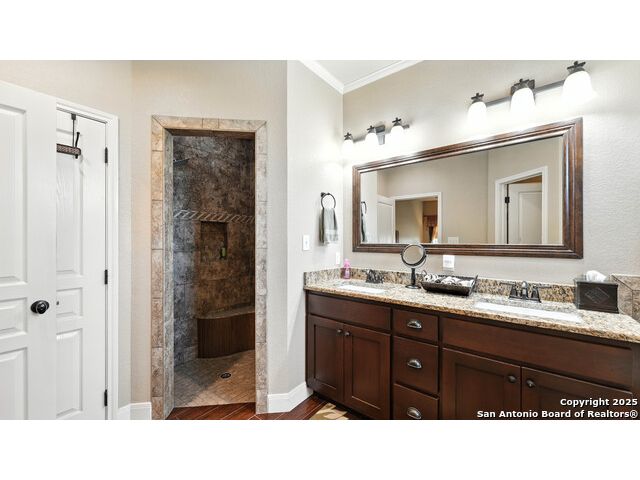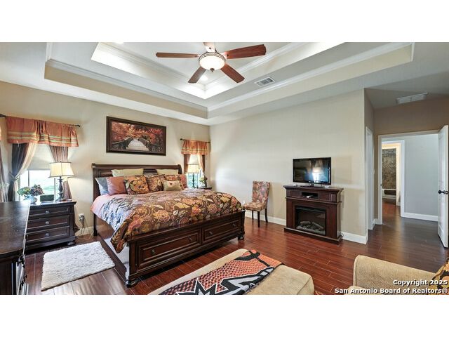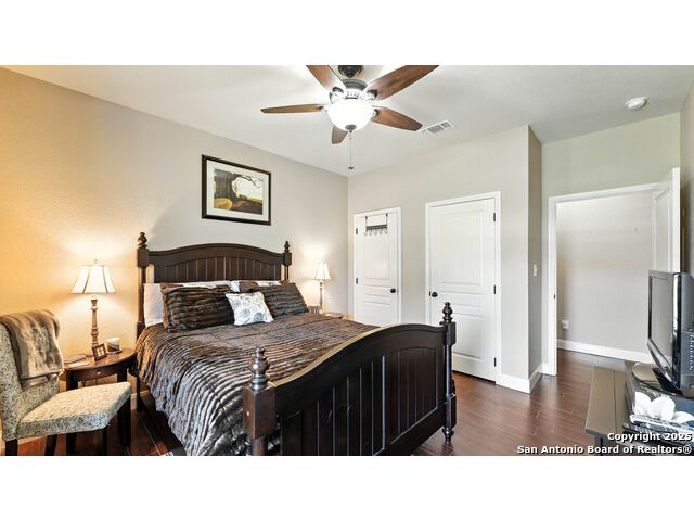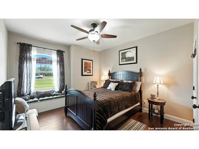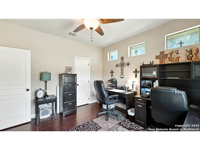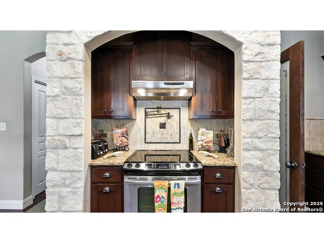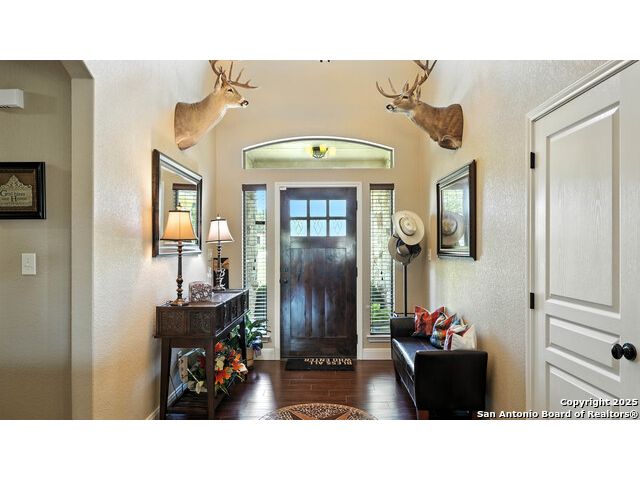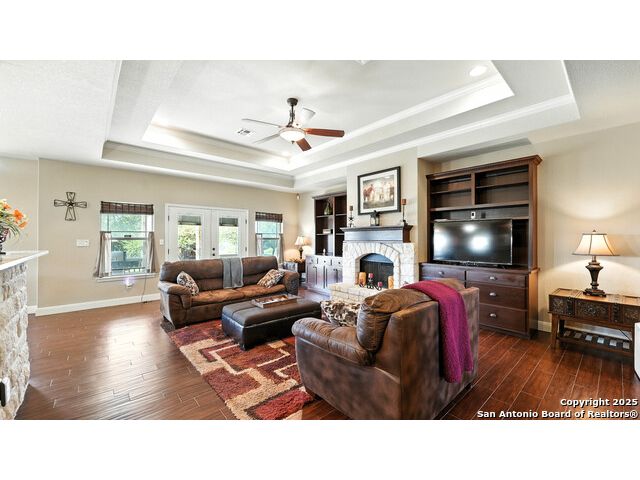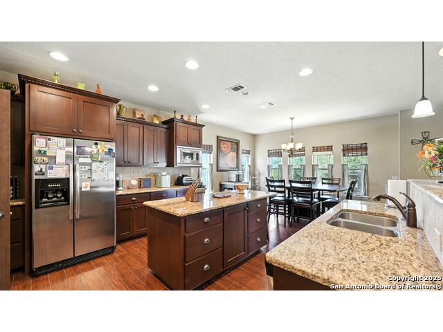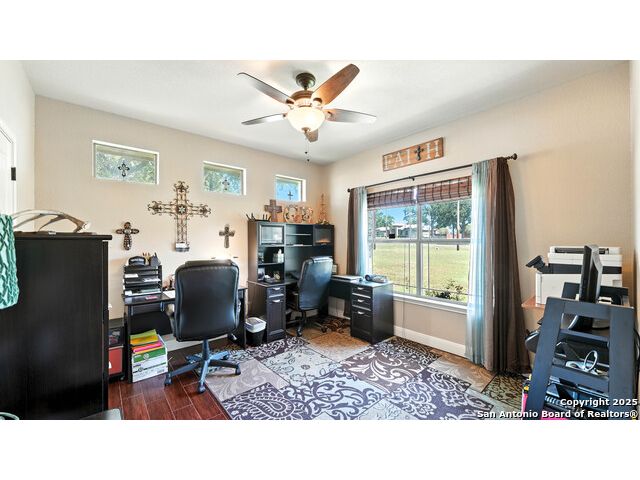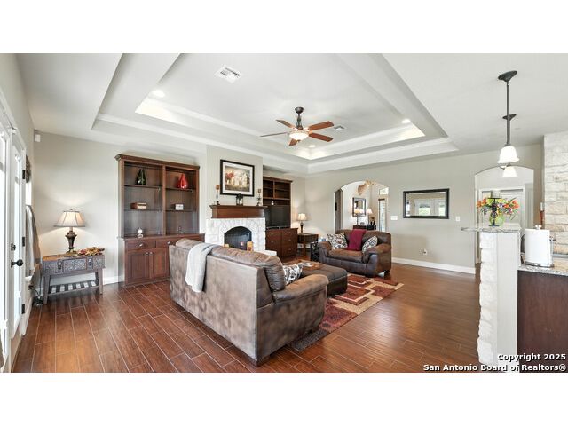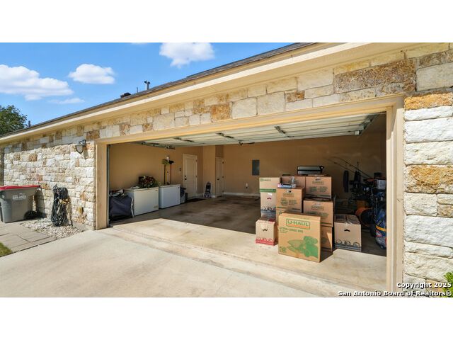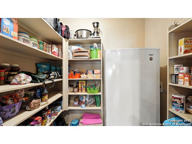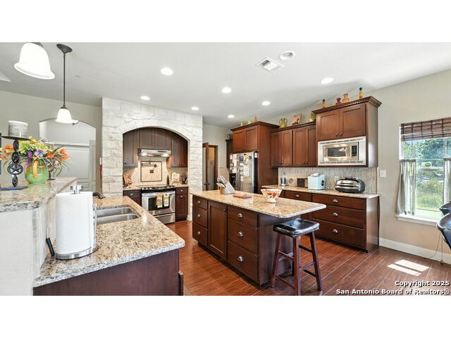 This well-appointed custom home features a spacious backyard shaded by mature oak trees, ideal for outdoor gatherings. A versatile backyard workshop offers potential for use as a "she-shed" or additional workspace. The residence includes three generously sized bedrooms, two full bathrooms, and an oversized two-car garage. The large living area boasts a wood-burning fireplace and seamlessly connects to the dining area and a chef's kitchen equipped with a large pantry and pot filler-perfect for preparing family meals. Additional amenities include a security system, refrigerator, and available generator access for power outages. The property has been meticulously maintained, and some furnishings are available for purchase. PVC lines have been installed and are ready for outdoor kitchen plumbing. No neighbors behind home, and the slab has a French drain to protect your slab foundation!