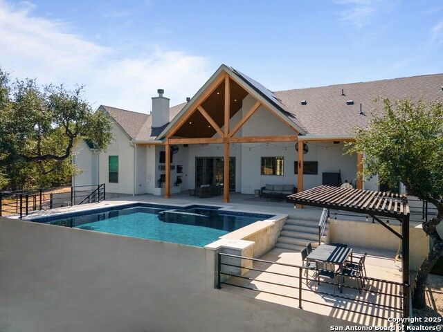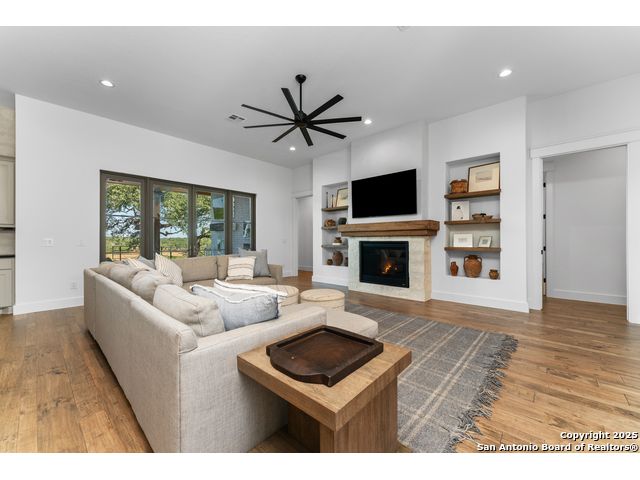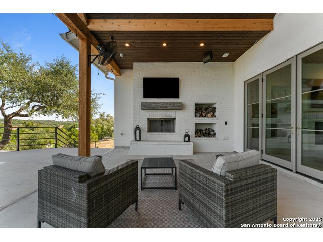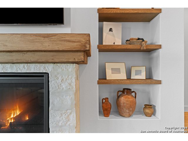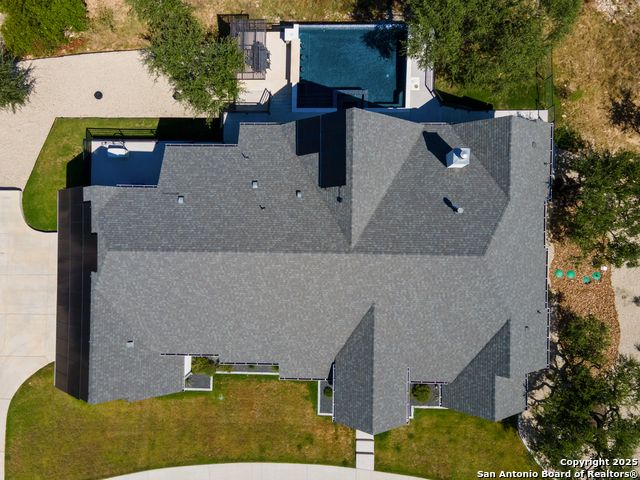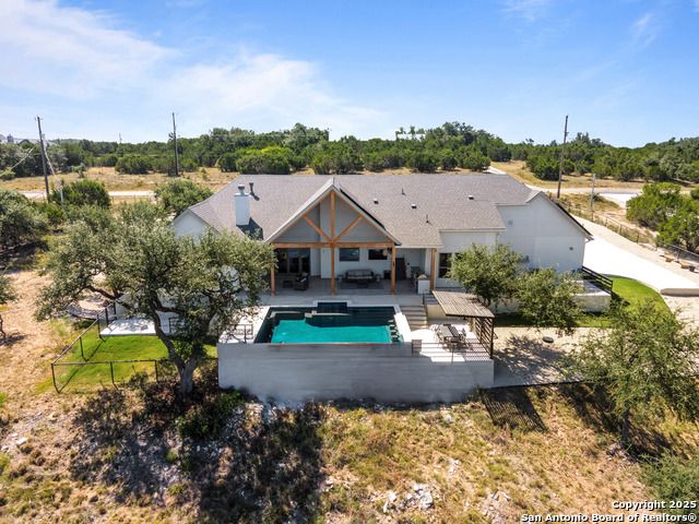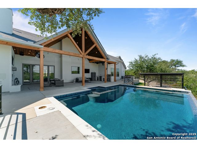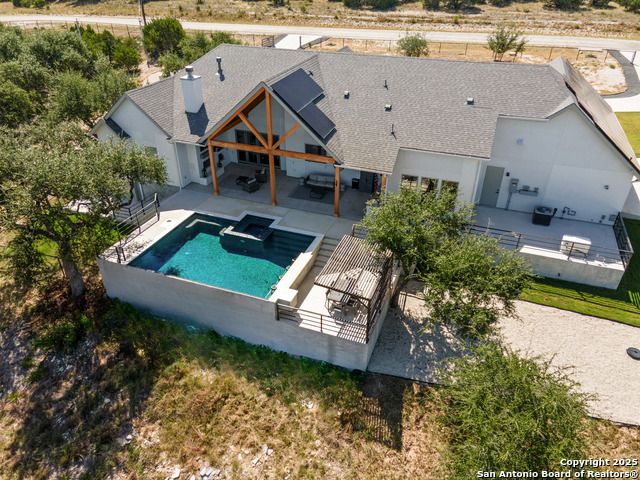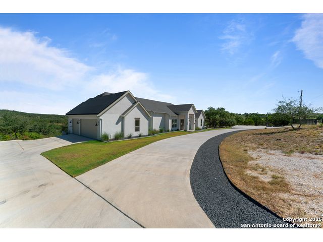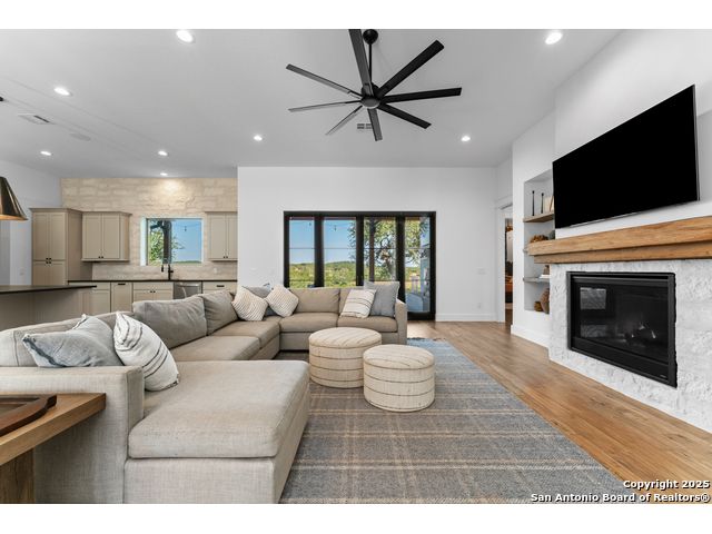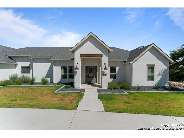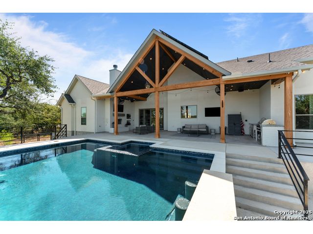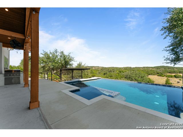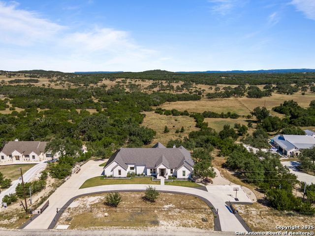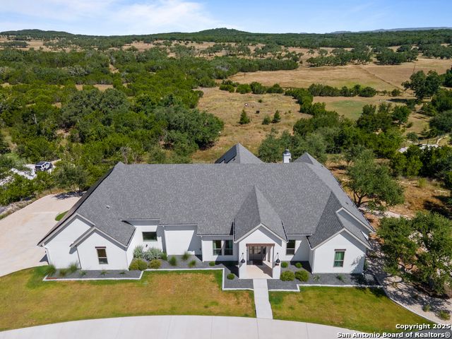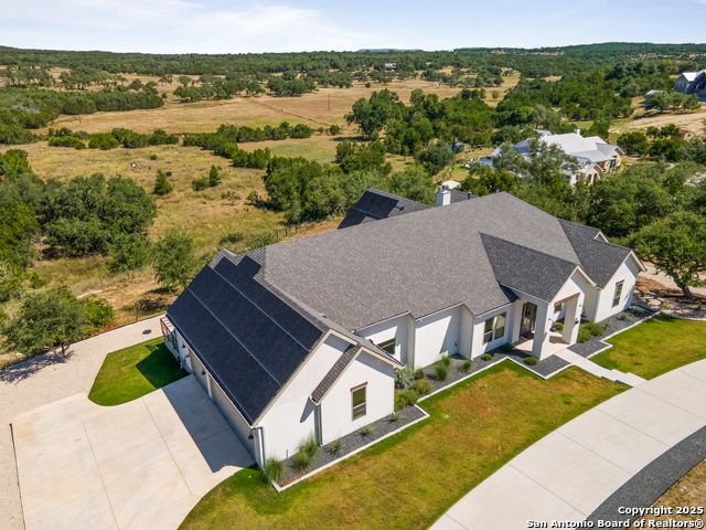 Welcome to refined Hill Country living in the coveted Mystic Shores North community. This stunning residence captures the beauty and serenity of the Texas Hill Country with an open, light-filled floor plan and expansive windows framing panoramic views of the surrounding landscape. Highlights include three inviting fireplaces, a chef's kitchen with a generous walk-in pantry, a spacious laundry room, and seamless indoor-outdoor living. Step outside to enjoy a heated pool and spa, outdoor kitchen, and thoughtfully designed entertaining spaces. Sustainability and comfort are built in with a 14.8 kW solar electrical system, a 26 kW Generac automatic standby generator, dual 500-gallon buried propane tanks, and energy-efficient spray foam insulation. This home blends elegance, function, and self-sufficiency-an ideal retreat ready to welcome its next owner. Come experience the peace, comfort, and charm of this extraordinary property for yourself.