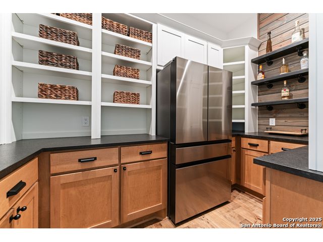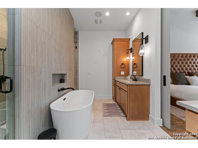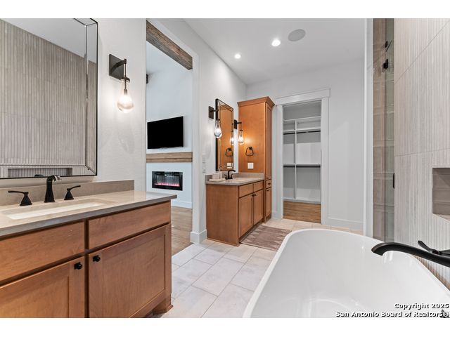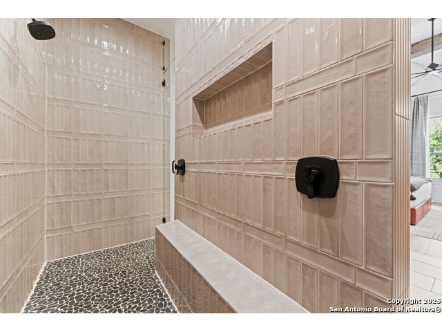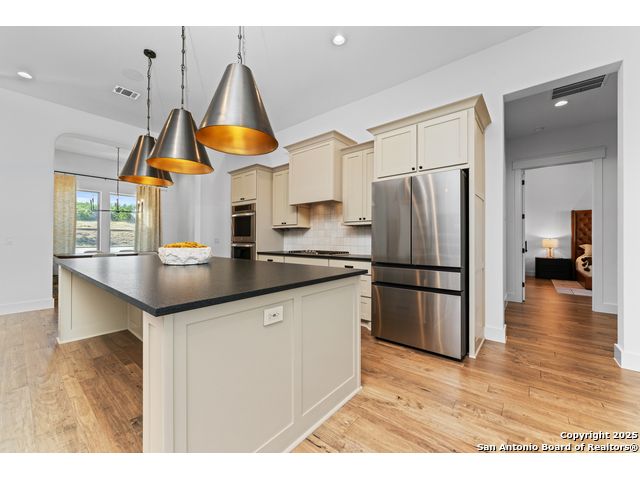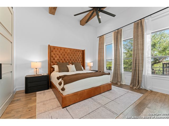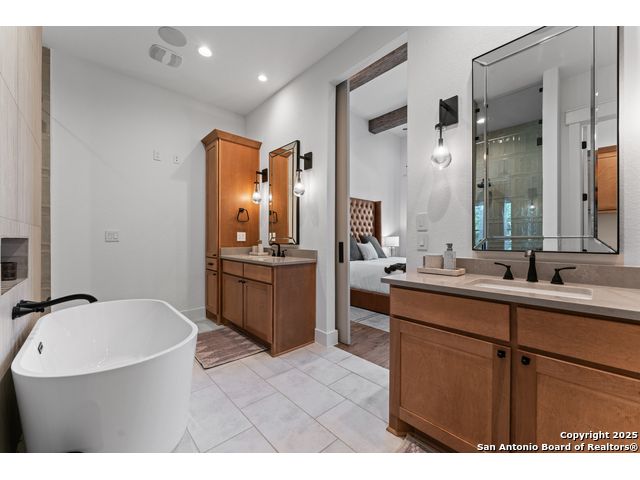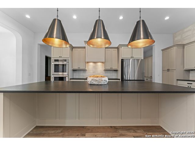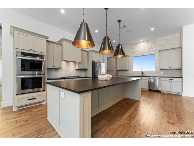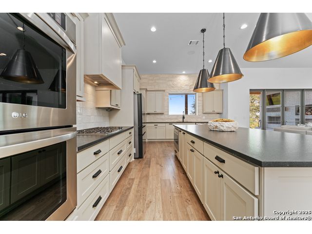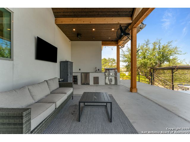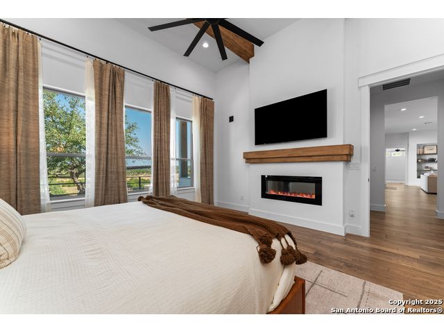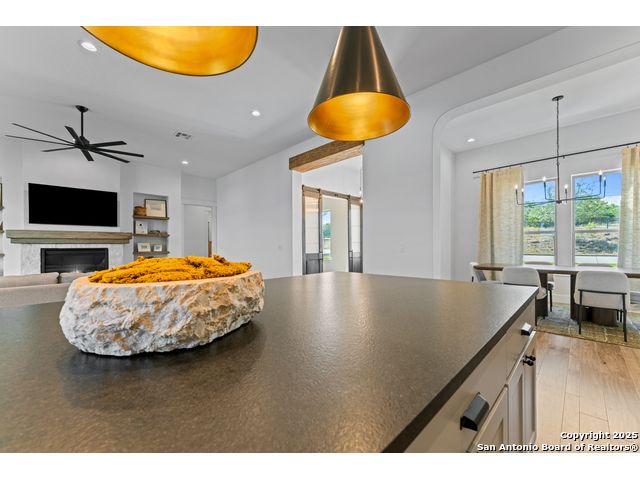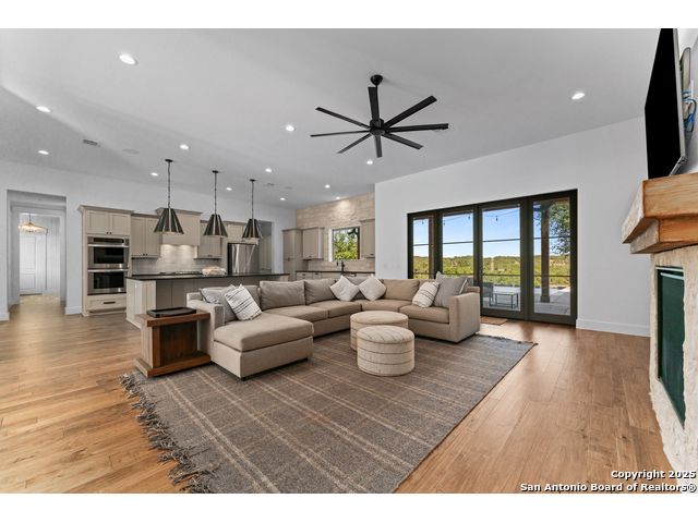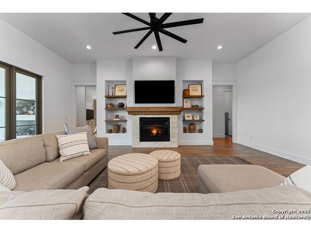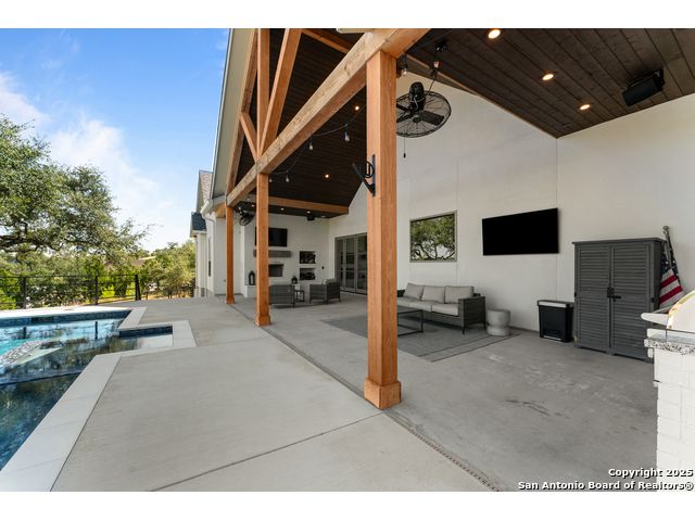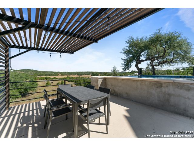 Welcome to refined Hill Country living in the coveted Mystic Shores North community. This stunning residence captures the beauty and serenity of the Texas Hill Country with an open, light-filled floor plan and expansive windows framing panoramic views of the surrounding landscape. Highlights include three inviting fireplaces, a chef's kitchen with a generous walk-in pantry, a spacious laundry room, and seamless indoor-outdoor living. Step outside to enjoy a heated pool and spa, outdoor kitchen, and thoughtfully designed entertaining spaces. Sustainability and comfort are built in with a 14.8 kW solar electrical system, a 26 kW Generac automatic standby generator, dual 500-gallon buried propane tanks, and energy-efficient spray foam insulation. This home blends elegance, function, and self-sufficiency-an ideal retreat ready to welcome its next owner. Come experience the peace, comfort, and charm of this extraordinary property for yourself.
