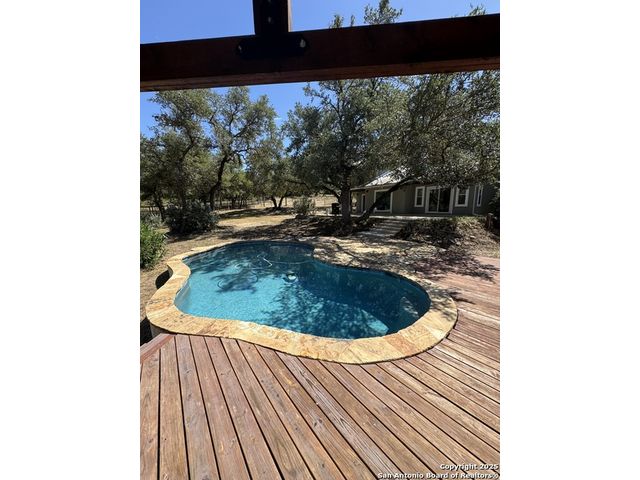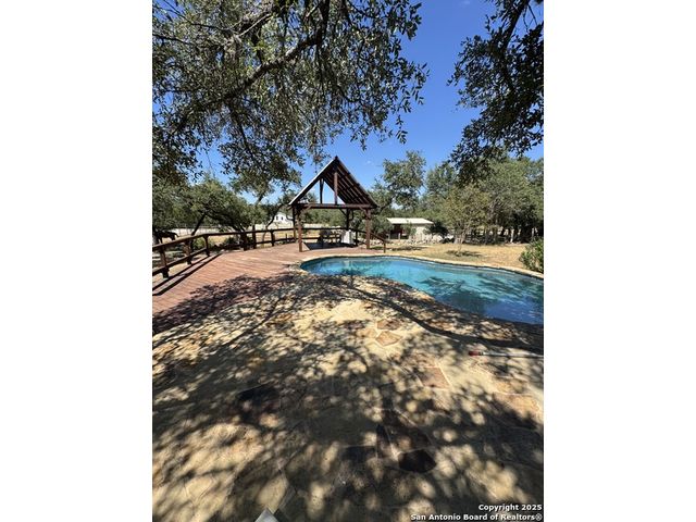 Your dream Hill Country ranchette awaits! Situated on just over 5 private acres, this charming stone and stucco home offers the perfect blend of country living and modern comfort. Surrounded by mature oak trees, the property is fenced and cross-fenced, making it ideal for horses, livestock, and outdoor living. The home features approximately 1,972 sq. ft. of thoughtfully designed living space with 3 bedrooms and 2.5 baths. Inside, you'll find soaring ceilings, a striking rock fireplace, and abundant natural light. Skylights brighten three rooms, while the open concept floor plan provides a spacious and inviting atmosphere. Upstairs, a loft serves as a versatile area for an office or sitting room. Recent upgrades include new flooring, carpet, all New high grade windows, updated fixtures, and fresh paint throughout ensuring a move-in-ready experience. Step outside and enjoy your very own backyard retreat with a sparkling swimming pool with a deck and pavilion that sets the stage for endless entertaining and relaxation. The expansive 40' x 20' partially covered back porch offers the perfect spot to unwind and take in the views of the Hill Country landscape. Equestrian enthusiasts will appreciate the well-equipped facilities, including an arena, 3-stall horse barn, tack room, and hay storage. Conveniently located with easy access to Highway 281 and only 20 minutes north of San Antonio, this property combines the tranquility of ranch living with the convenience of being close to city amenities.