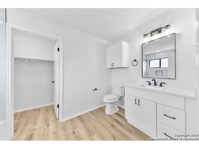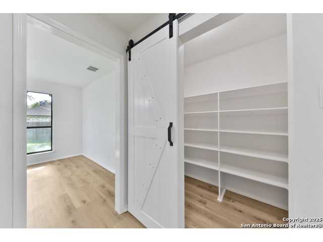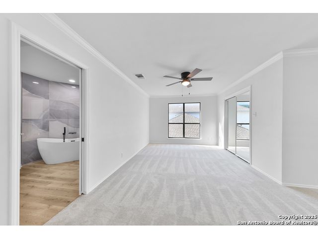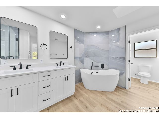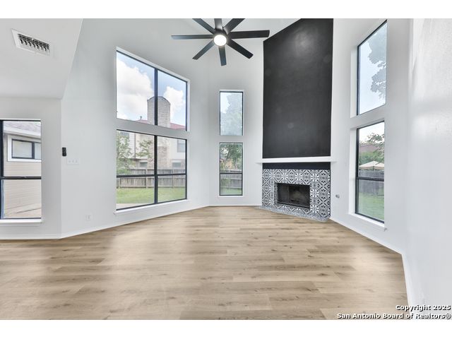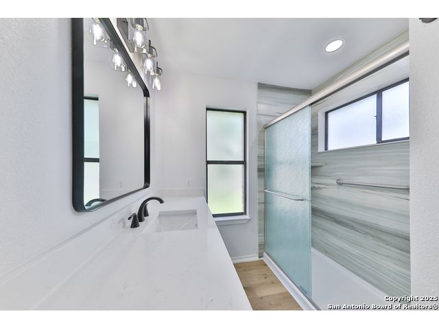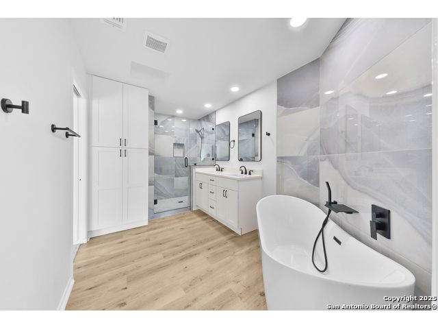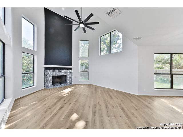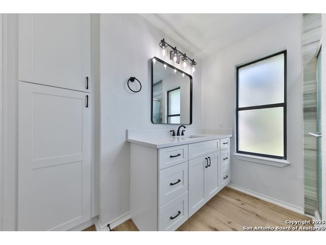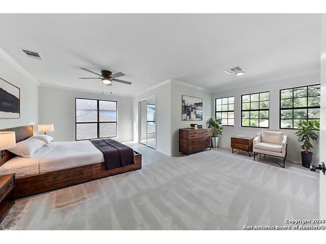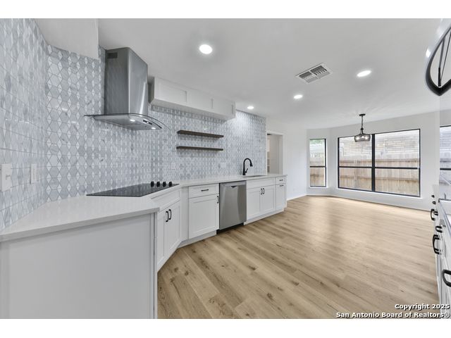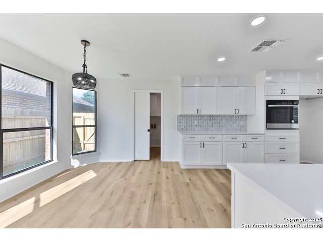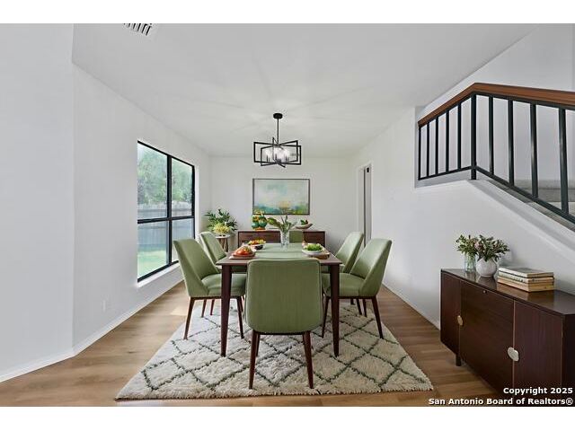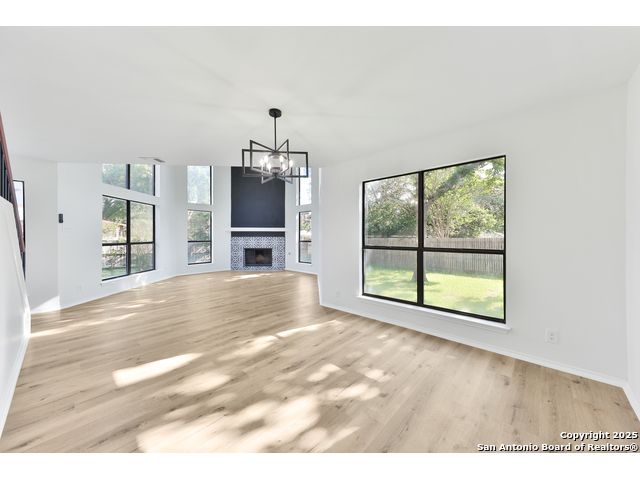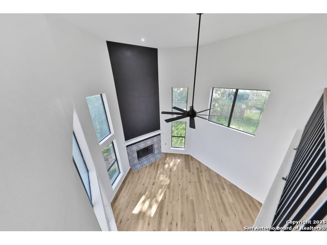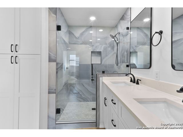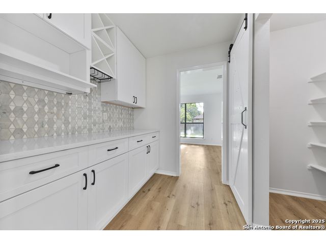 Seller preferred lender is offering a 2/1 interest rate buy-down - see flyer in additional docs for details. Gorgeously updated 3-bedroom, 3-bath Sitterle home with a 2-car garage and a smart, functional layout-featuring one bedroom downstairs and two upstairs, each with its own private bath. This one-owner home has been meticulously cared for, showcasing high-quality upgrades throughout. The entire downstairs features durable 20 mil luxury vinyl plank flooring, paired with fresh interior and exterior paint and new carpet upstairs and in two bedrooms for added comfort and style. Tastefully redesigned with solid maple soft-close cabinetry, quartz countertops, and modern, cohesive finishes that flow beautifully from the kitchen to the bathrooms. The kitchen is a true showstopper with its marble backsplash, floating shelves, built-in trash cabinet, new appliances, cozy eat-in dining area, butler's pantry, and a walk-in pantry hidden behind a charming barn door-combining style with functionality. The living room boasts soaring ceilings and large windows that flood the space with natural light. A bold black accent wall frames the gas and wood-burning fireplace with custom tile surround, adding a designer touch and a warm focal point. Upstairs, the spacious primary suite offers a private sitting area, large walk-in closet, and a luxurious bathroom with a freestanding soaking tub, oversized glass walk-in shower with large-format tile, double vanity with quartz counters, soft-close cabinetry, matte black fixtures, and sleek framed mirrors.Additional highlights include an oversized laundry room with built-in cabinetry and room for a second fridge or freezer-perfect for staying organized and adding everyday convenience. Outside, enjoy a fenced yard with a covered porch and patio-ideal for relaxing or entertaining. Located in the highly rated North East ISD, with quick access to 1604, I-35, H-E-B, and local dining, this home is move-in ready and full of thoughtful upgrades throughout.