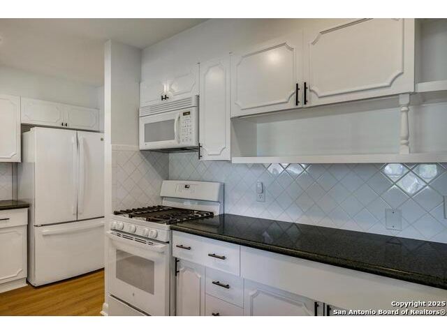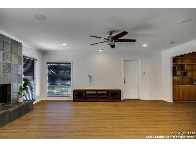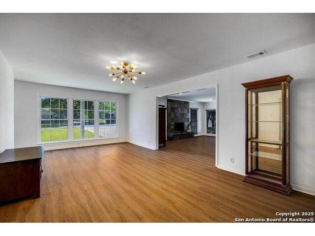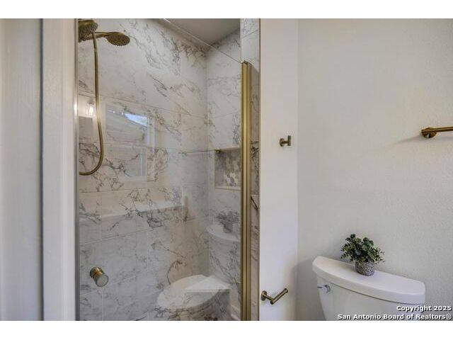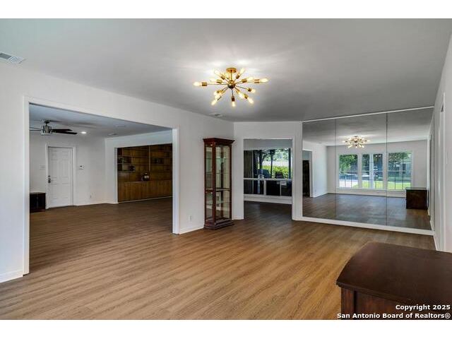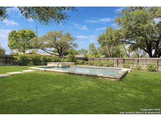 UPDATED AND REMODELED! Beautiful Ranch style one story home is situated on a .34 acre lot in the coveted Alamo Heights ISD has been updated throughout! New Luxury Waterproof Vinyl flooring has been added and the interior has been painted in Sherwin Williams Alabaster. A spectacular living/family room is spacious and wired for the ultimate surround sound experience! A stunning gas fireplace rounds out this lovely space and flows into the den area and large dining room. Newer vinyl windows with energy efficient wood blinds provide ample natural light throughout. The galley kitchen features Silestone counters, GE gas stove (2024), newer deep sink and a Bosch dishwasher. Kitchen cabinets have been repainted and new hardware placed and a new faucet installed. All bedrooms have been painted and showcase new flooring. Both bathrooms have been transformed into gorgeous spaces with full remodels featuring new vanities and sinks, faucets, towel racks and gold tone cabinet hardware as well as new windows! Many light fixtures are also new. Gorgeous tile was installed in both showers, along with new shower glass. The Keith Zars sparkling pool and fabulous 8x8' hot tub in the expansive backyard, offer the ultimate in outdoor fun and entertainment. The amazing backyard features approx 23'x16' covered patio that overlooks a lush lawn and huge mature oak tree, all surrounded in privacy by the newer wood fence. Outside speakers and TV convey, along with patio furniture! The one car garage offers so much more with a back workshop attached, extra garage storage, an insulated highly rated garage door and it is pre-wired for electric car or RV! Garage is also plumbed for refrigerator. Interior utility room. Easy access to Broadway and Loop 410, as well as all the fabulous shopping and restaurants that Alamo Heights has to offer!