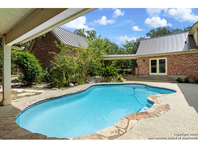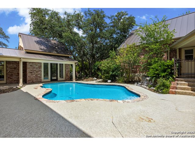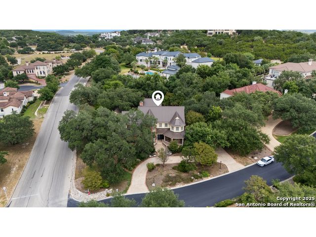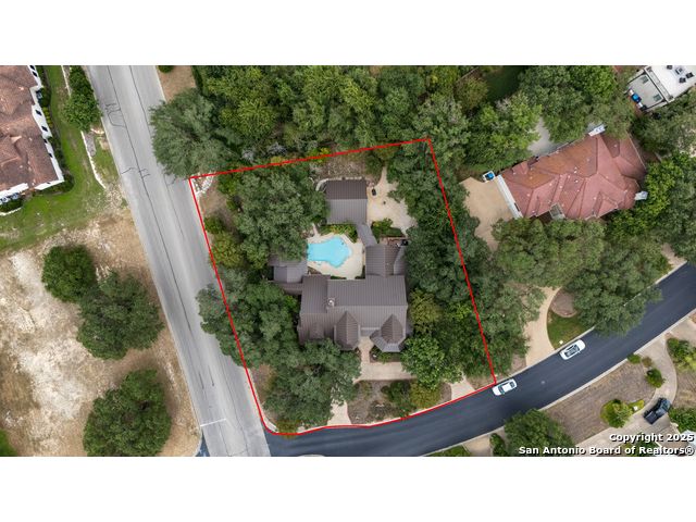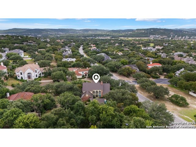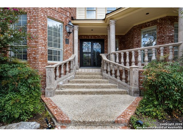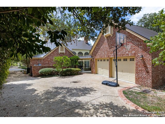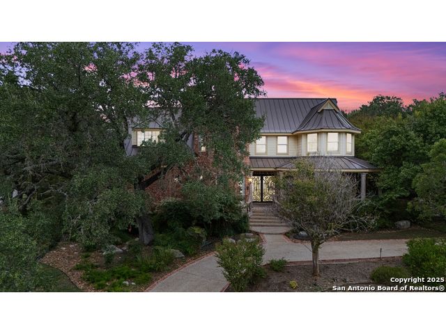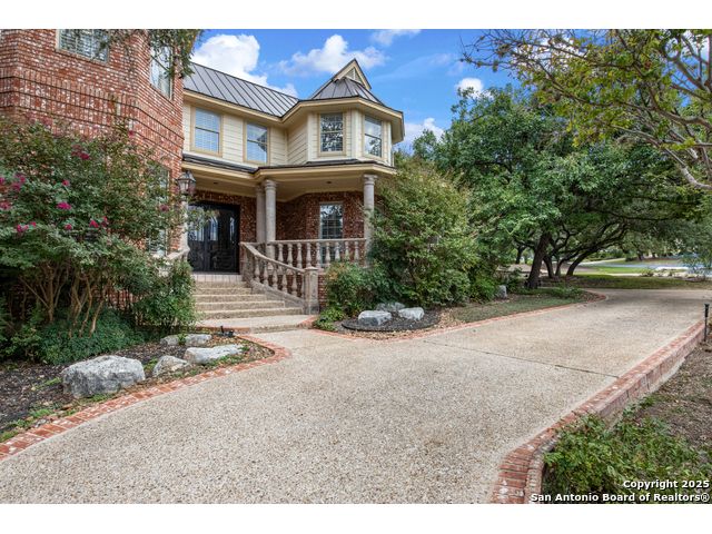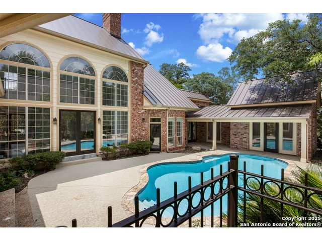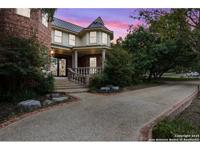 Experience timeless elegance and modern comfort in this stunning estate located in the prestigious Dominion. Nestled on 0.6 acres of beautifully landscaped grounds, this home offers serene walking paths, lush greenery, and a private backyard oasis with a sparkling pool. The stately brick exterior and circular drive welcome you to a residence designed for grand entertaining and everyday luxury. Inside, soaring ceilings and dramatic windows fill the living spaces with natural light, highlighting breathtaking views of the pool and gardens. The gourmet kitchen is a chef's dream with custom cabinetry, granite counters, and professional-grade appliances, seamlessly flowing into the breakfast and family areas. The expansive primary suite offers private outdoor access, a spa-inspired bath, and generous closet space. Multiple living areas, a game room, and a wet bar ensure ample room for relaxation and gatherings. Outdoors, mature landscaping, shaded sitting areas, and tranquil pathways create the perfect setting for entertaining or quiet retreat. With its blend of refined architecture, resort-style amenities, and an exclusive Dominion address, this extraordinary property is a rare opportunity to own one of San Antonio's finest homes.