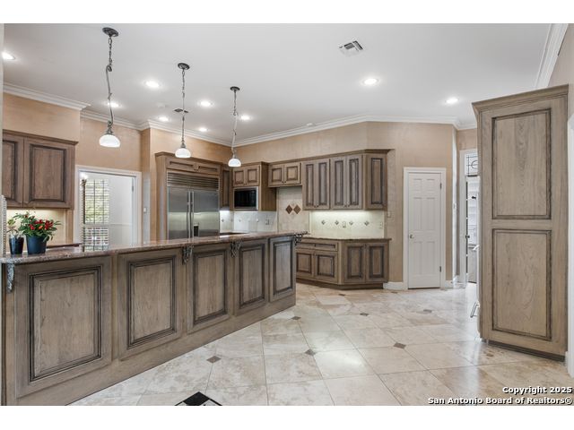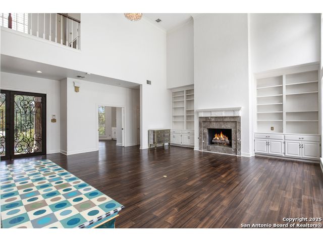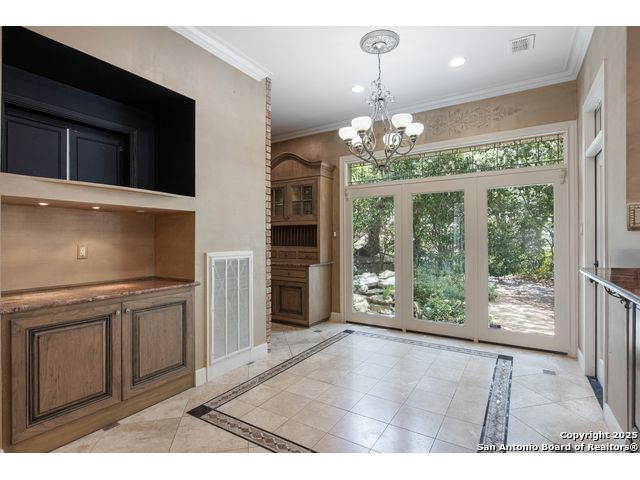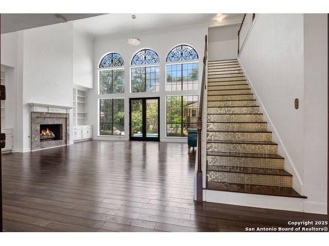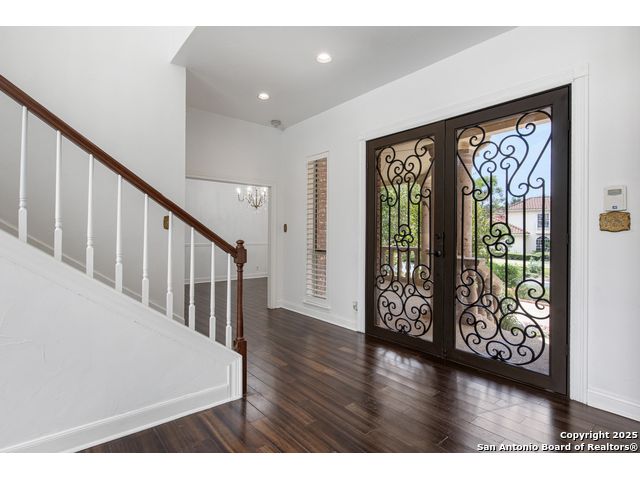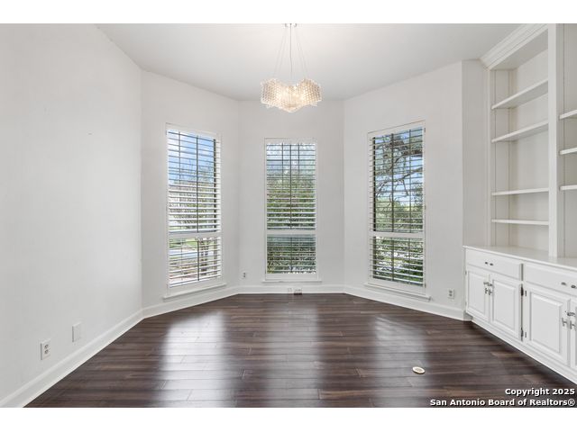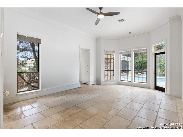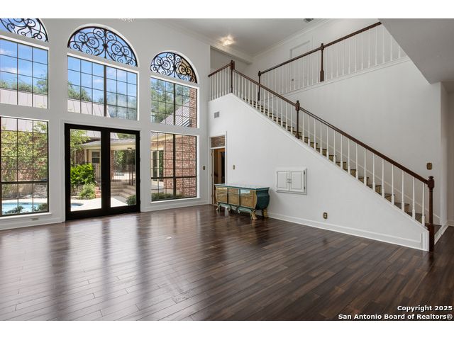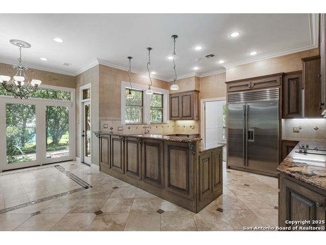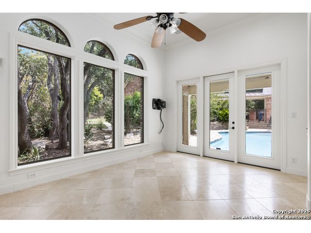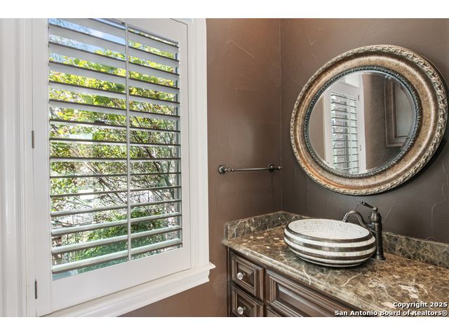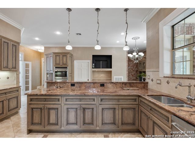Experience timeless elegance and modern comfort in this stunning estate located in the prestigious Dominion. Nestled on 0.6 acres of beautifully landscaped grounds, this home offers serene walking paths, lush greenery, and a private backyard oasis with a sparkling pool. The stately brick exterior and circular drive welcome you to a residence designed for grand entertaining and everyday luxury. Inside, soaring ceilings and dramatic windows fill the living spaces with natural light, highlighting breathtaking views of the pool and gardens. The gourmet kitchen is a chef's dream with custom cabinetry, granite counters, and professional-grade appliances, seamlessly flowing into the breakfast and family areas. The expansive primary suite offers private outdoor access, a spa-inspired bath, and generous closet space. Multiple living areas, a game room, and a wet bar ensure ample room for relaxation and gatherings. Outdoors, mature landscaping, shaded sitting areas, and tranquil pathways create the perfect setting for entertaining or quiet retreat. With its blend of refined architecture, resort-style amenities, and an exclusive Dominion address, this extraordinary property is a rare opportunity to own one of San Antonio's finest homes.