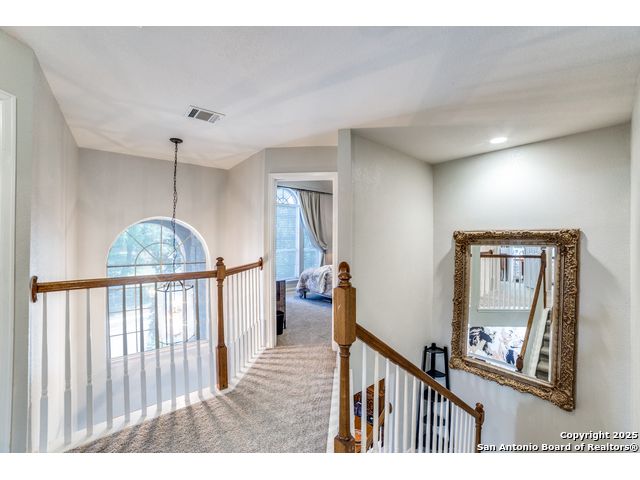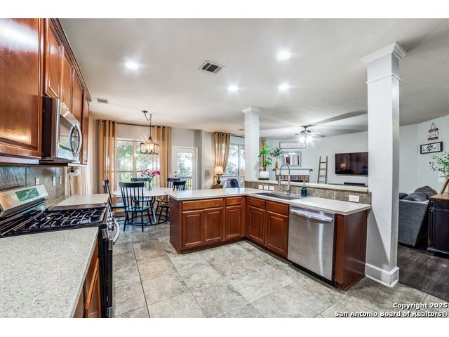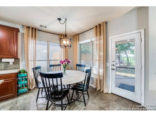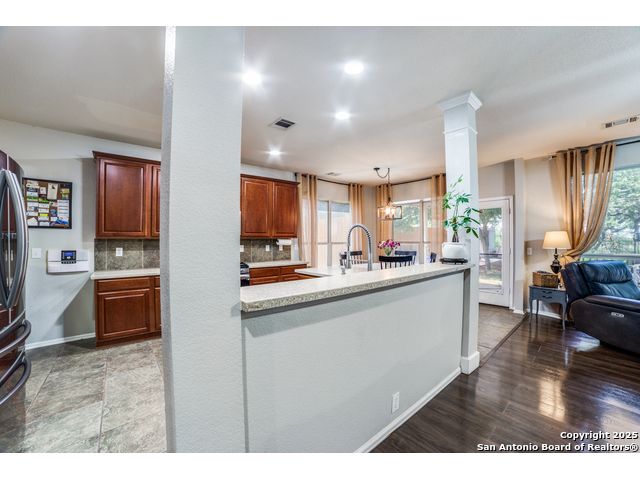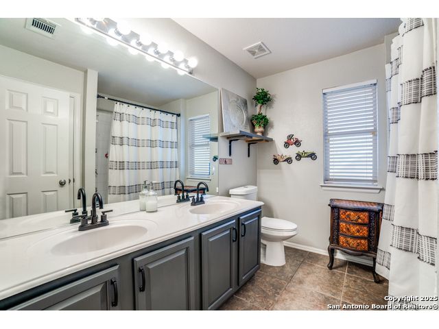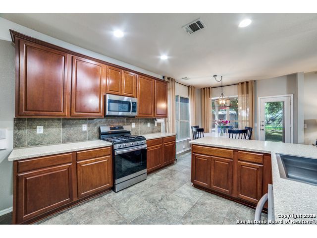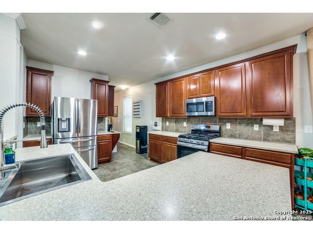 Discover your dream home in this stunning 5-bedroom, 3-bath residence, overflowing with premium upgrades and modern amenities! Nestled in a prestigious gated community, you'll enjoy access to fantastic facilities, including a luxurious pool, tennis and basketball courts, a dedicated dog park, and a fun playground for the little ones. Perched on a hill and backing up to a serene green belt, this property offers spectacular sunset views that create a perfect backdrop for relaxation. The beautifully landscaped yard features ample patio space, ideal for entertaining family and friends around the sparkling pool. Step inside to find an expansive open floor plan leading to a chef's kitchen designed for culinary enthusiasts. Featuring gas cooking, an inviting coffee bar, and ample counter space, this kitchen is perfect for preparing meals and entertaining guests. The main level also includes a versatile bedroom and bathroom-currently serving as a stylish home office, it's perfectly suited for multi-generational living as well. Upstairs, you'll discover four additional bedrooms, highlighted by an extra-large primary suite, along with a cozy second living room for unwinding. This home is equipped with impressive upgrades, including energy-efficient solar screens, plumbing ready for a water softener, and wiring for a state-of-the-art security alarm system. Don't miss out on this opportunity to own a spectacular home that perfectly blends luxury, comfort, and convenience! Seller willing to contribute towards closing!! Let's make a deal!!