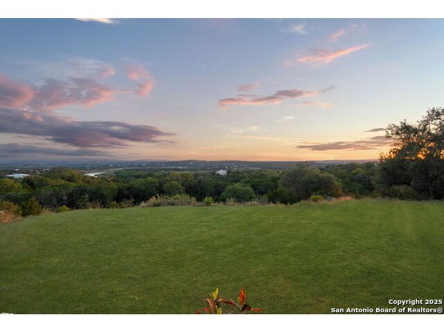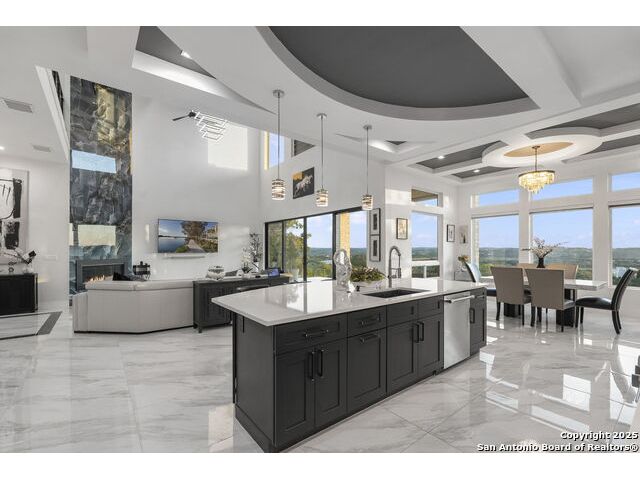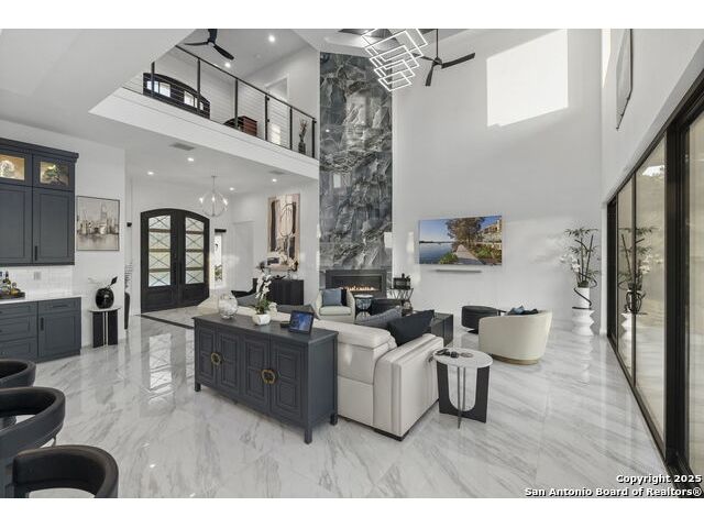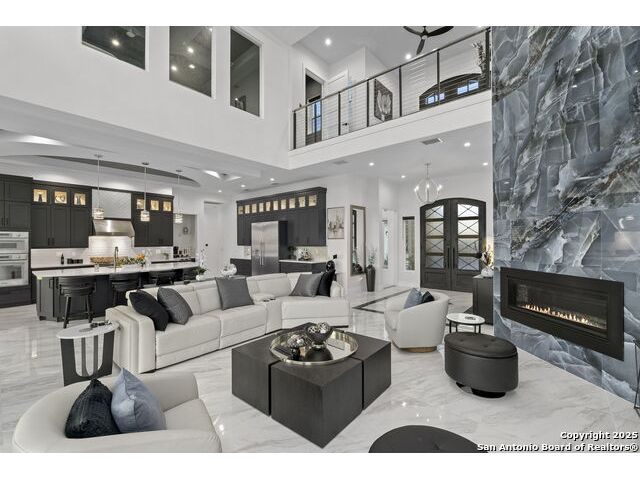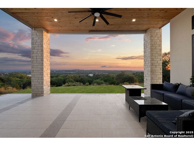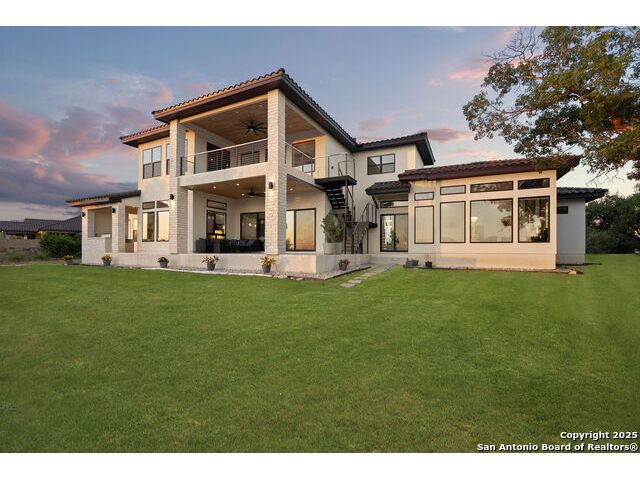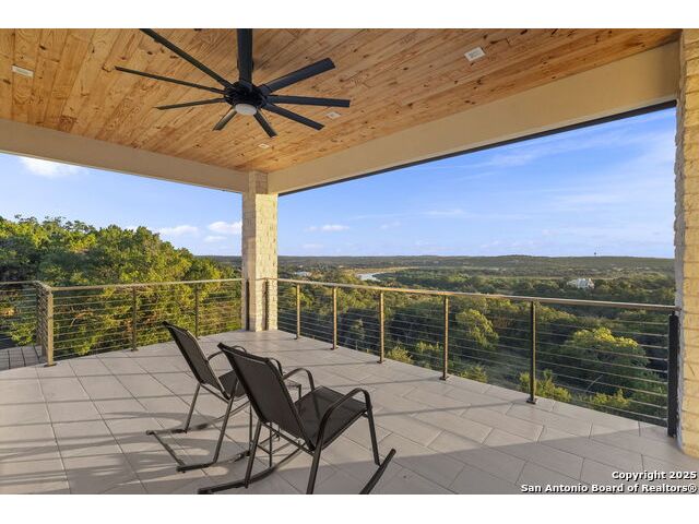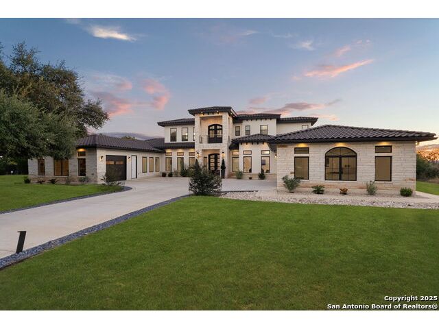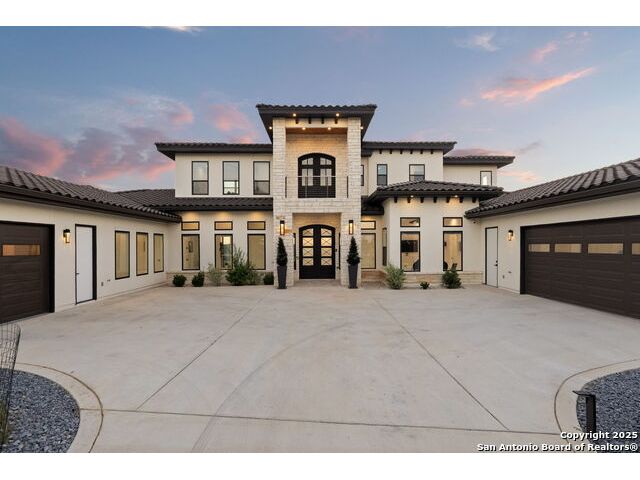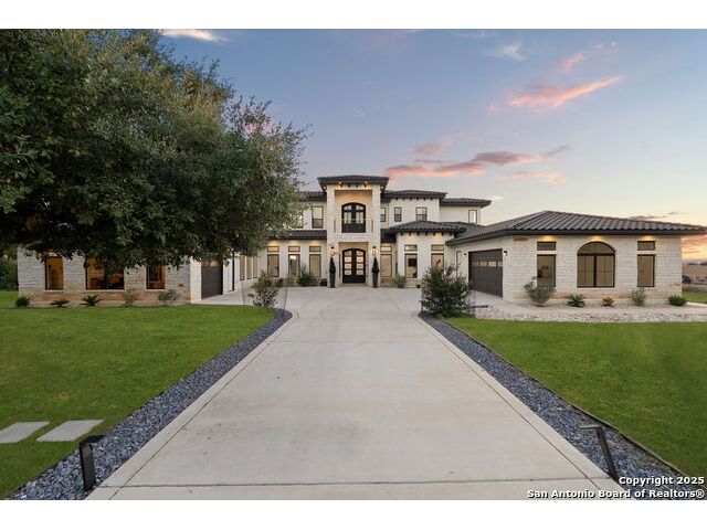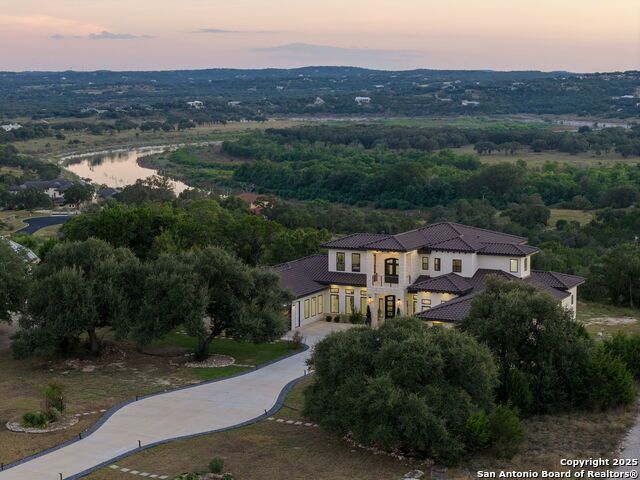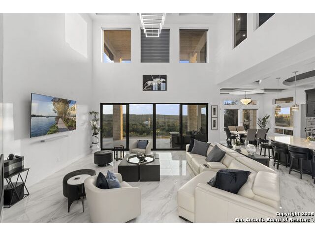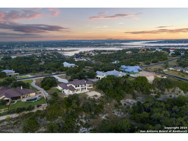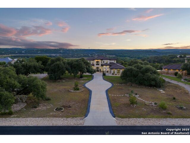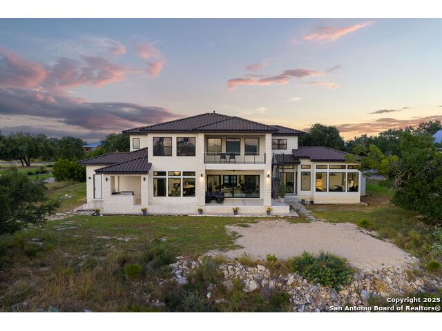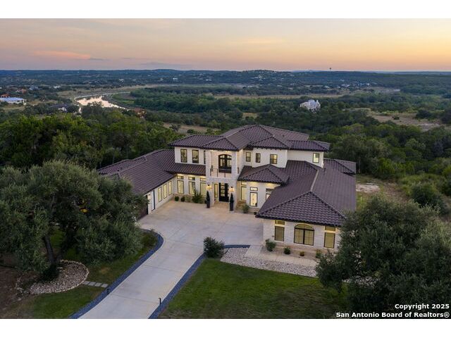 Experience the pinnacle of Hill Country luxury in this breathtaking custom residence, located in the prestigious gated community of The Peninsula at Mystic Shores. Set atop a private 3.62-acre hilltop lot, this immaculate two-story home blends modern elegance with comfort and functionality, offering stunning panoramic views of the Hill Country and Guadalupe River. Step through a grand 9-foot double iron door into an open-concept floor plan designed to impress. Soaring 22-foot ceilings and a massive sliding glass door flood the living space with natural light while showcasing the tranquil scenery outside. The living room features a striking floor-to-ceiling porcelain tile fireplace, adding a sleek and sophisticated focal point to the heart of the home. Custom ceiling designs throughout the home further elevate the architectural detail and aesthetic appeal. Perfect for entertaining, the gourmet kitchen boasts a massive center island, high-end Thermador stainless steel appliances-including a professional gas cooktop and vent hood-custom cabinetry with ample storage, quartz countertops, a large pantry, and an undermount sink. The luxurious primary suite offers oversized picture windows that frame daily sunsets and breathtaking views. The spa-inspired en-suite bathroom features an expansive walk-in shower with dual rain showerheads, 12 body jets, floor-to-ceiling porcelain tile, and a stand-alone soaking tub separated by a tiled pony wall. Dual vanities, a dedicated makeup station, and a generous walk-in closet complete this elegant retreat. Four additional bedrooms each include walk-in closets and private en-suite bathrooms. A dedicated office space opens to the patio via a sleek sliding glass door, while the upstairs loft and media room provide additional room for relaxation or entertainment. Enjoy outdoor living at its finest with both a covered patio and upper balcony offering uninterrupted Hill Country views. The full outdoor kitchen is ideal for al fresco dining and entertaining. Additional features include a spacious 3-car garage, high-end water softener system, a WiFi-controlled irrigation system, and tankless water heater providing endless hot water. Mystic Shores residents enjoy exclusive amenities including a lakeside pool, sports courts, playground, pavilion, and private access to Canyon Lake. With close proximity to Hwy 281, San Antonio, New Braunfels, and Wimberley, this home offers an unmatched combination of luxury, privacy, and convenience.