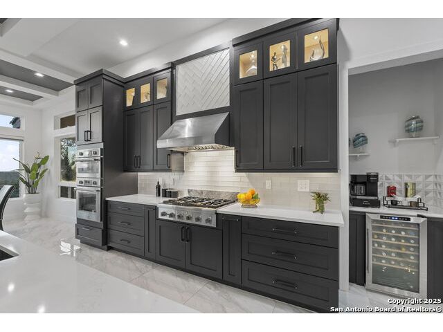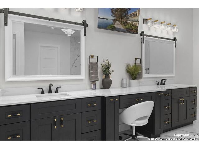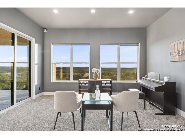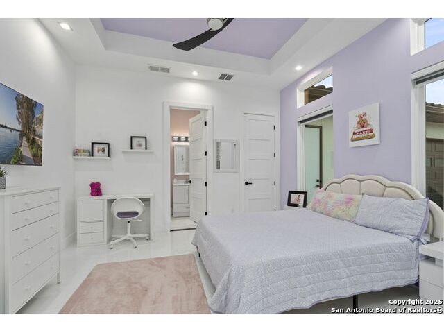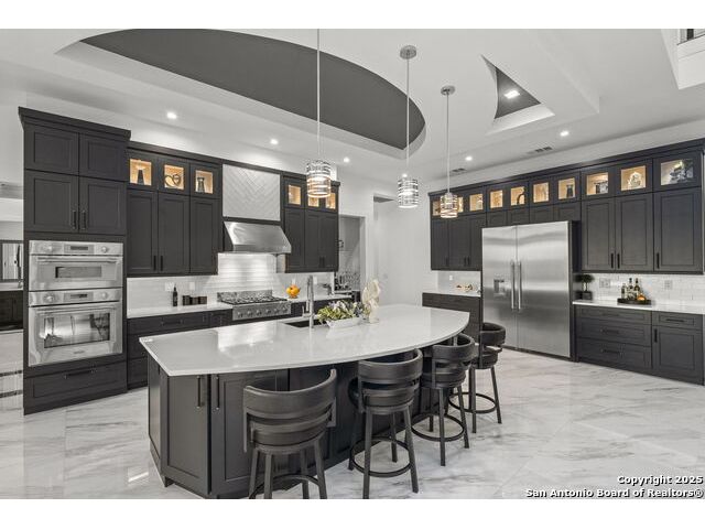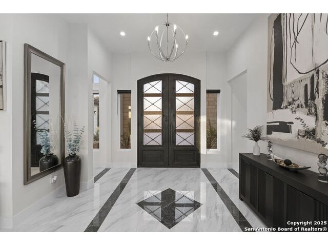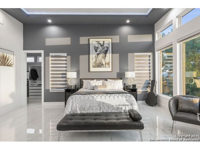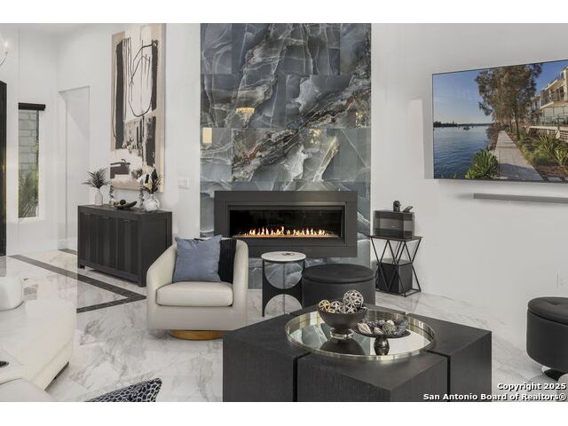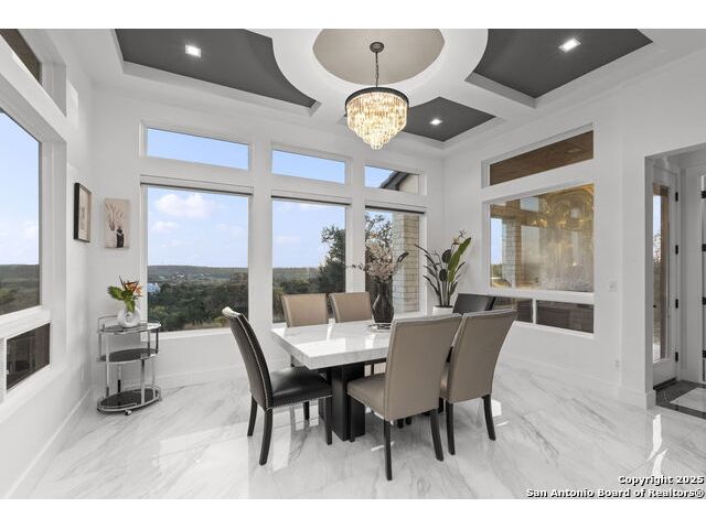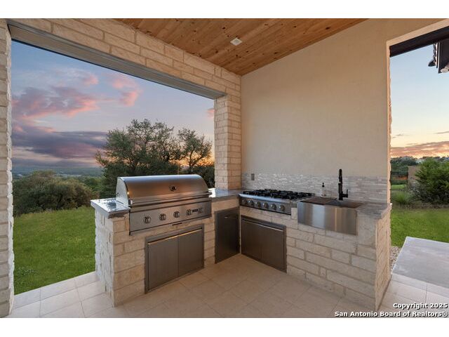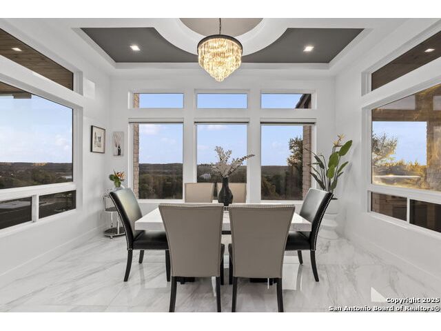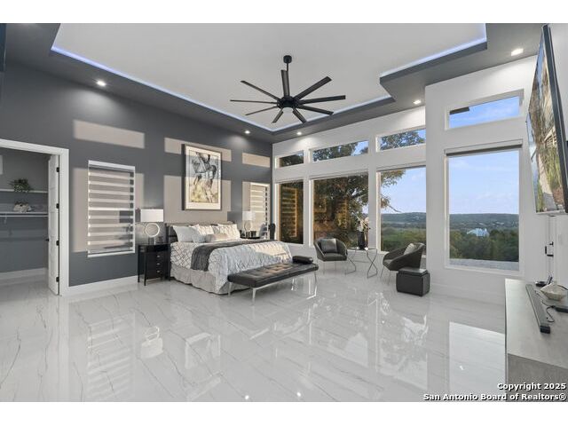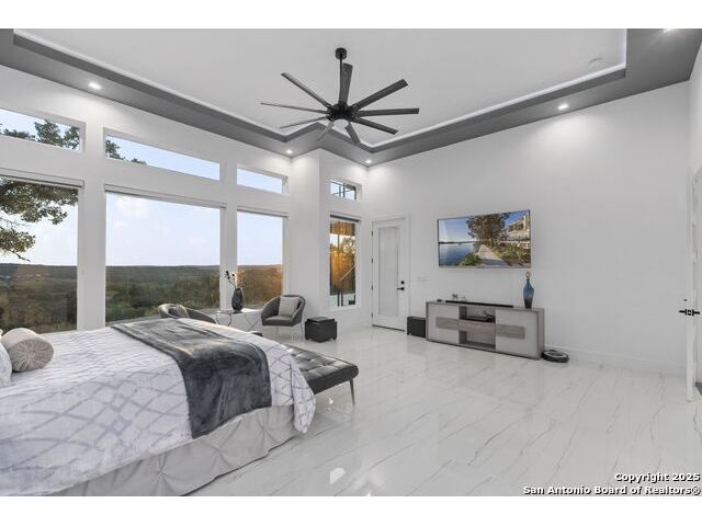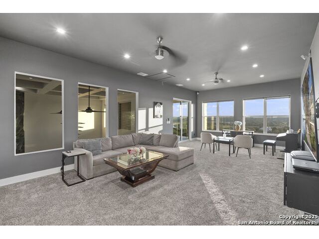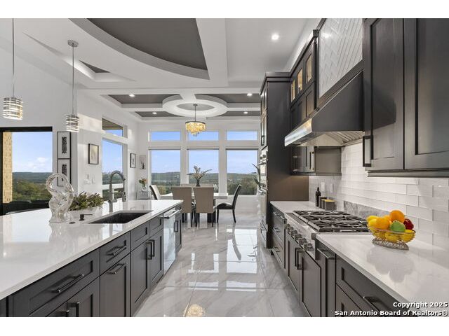 Experience the pinnacle of Hill Country luxury in this breathtaking custom residence, located in the prestigious gated community of The Peninsula at Mystic Shores. Set atop a private 3.62-acre hilltop lot, this immaculate two-story home blends modern elegance with comfort and functionality, offering stunning panoramic views of the Hill Country and Guadalupe River. Step through a grand 9-foot double iron door into an open-concept floor plan designed to impress. Soaring 22-foot ceilings and a massive sliding glass door flood the living space with natural light while showcasing the tranquil scenery outside. The living room features a striking floor-to-ceiling porcelain tile fireplace, adding a sleek and sophisticated focal point to the heart of the home. Custom ceiling designs throughout the home further elevate the architectural detail and aesthetic appeal. Perfect for entertaining, the gourmet kitchen boasts a massive center island, high-end Thermador stainless steel appliances-including a professional gas cooktop and vent hood-custom cabinetry with ample storage, quartz countertops, a large pantry, and an undermount sink. The luxurious primary suite offers oversized picture windows that frame daily sunsets and breathtaking views. The spa-inspired en-suite bathroom features an expansive walk-in shower with dual rain showerheads, 12 body jets, floor-to-ceiling porcelain tile, and a stand-alone soaking tub separated by a tiled pony wall. Dual vanities, a dedicated makeup station, and a generous walk-in closet complete this elegant retreat. Four additional bedrooms each include walk-in closets and private en-suite bathrooms. A dedicated office space opens to the patio via a sleek sliding glass door, while the upstairs loft and media room provide additional room for relaxation or entertainment. Enjoy outdoor living at its finest with both a covered patio and upper balcony offering uninterrupted Hill Country views. The full outdoor kitchen is ideal for al fresco dining and entertaining. Additional features include a spacious 3-car garage, high-end water softener system, a WiFi-controlled irrigation system, and tankless water heater providing endless hot water. Mystic Shores residents enjoy exclusive amenities including a lakeside pool, sports courts, playground, pavilion, and private access to Canyon Lake. With close proximity to Hwy 281, San Antonio, New Braunfels, and Wimberley, this home offers an unmatched combination of luxury, privacy, and convenience.