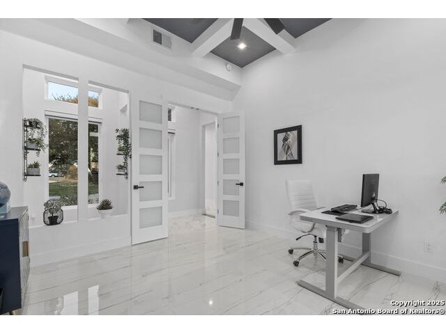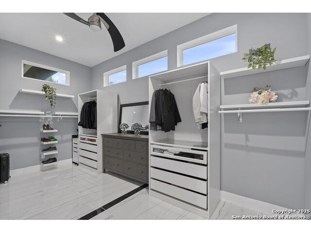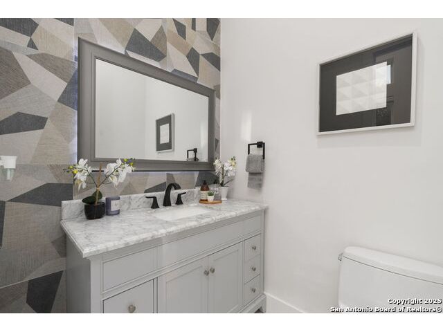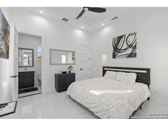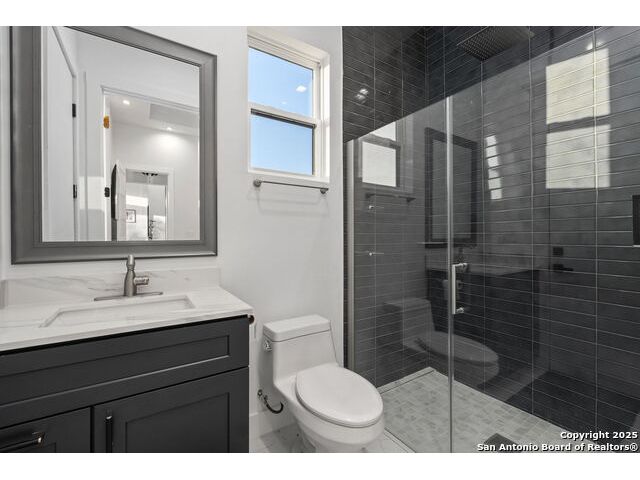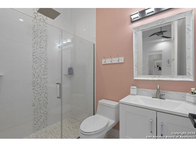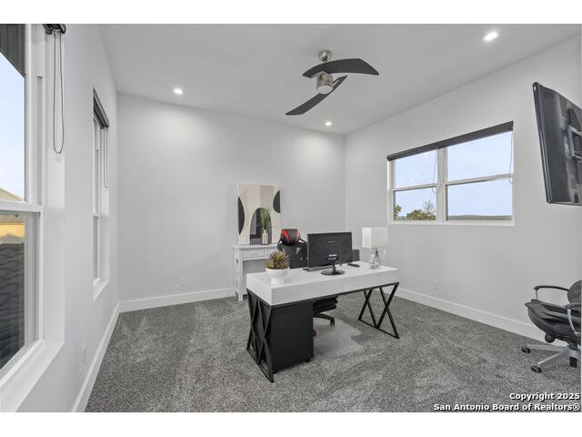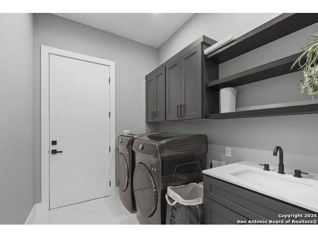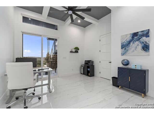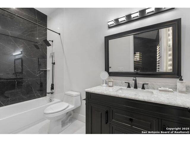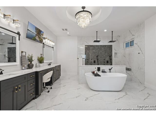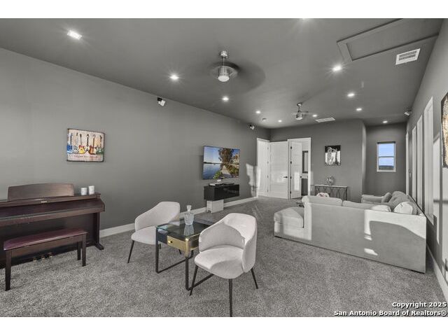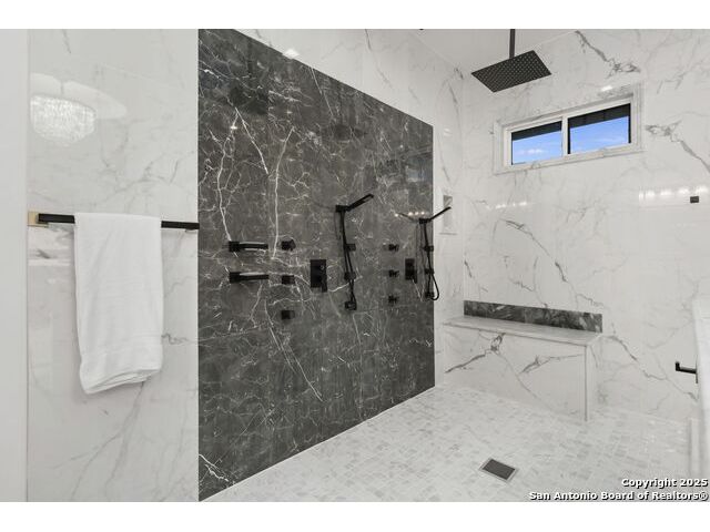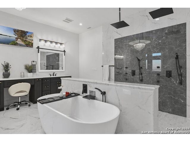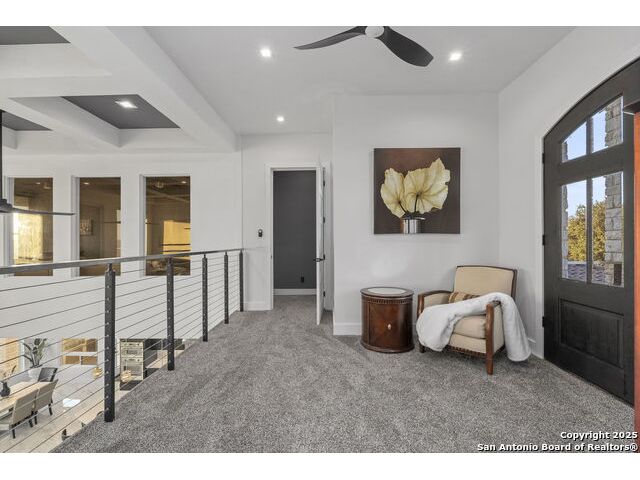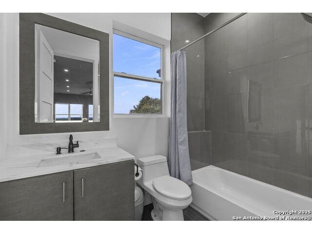 Experience the pinnacle of Hill Country luxury in this breathtaking custom residence, located in the prestigious gated community of The Peninsula at Mystic Shores. Set atop a private 3.62-acre hilltop lot, this immaculate two-story home blends modern elegance with comfort and functionality, offering stunning panoramic views of the Hill Country and Guadalupe River. Step through a grand 9-foot double iron door into an open-concept floor plan designed to impress. Soaring 22-foot ceilings and a massive sliding glass door flood the living space with natural light while showcasing the tranquil scenery outside. The living room features a striking floor-to-ceiling porcelain tile fireplace, adding a sleek and sophisticated focal point to the heart of the home. Custom ceiling designs throughout the home further elevate the architectural detail and aesthetic appeal. Perfect for entertaining, the gourmet kitchen boasts a massive center island, high-end Thermador stainless steel appliances-including a professional gas cooktop and vent hood-custom cabinetry with ample storage, quartz countertops, a large pantry, and an undermount sink. The luxurious primary suite offers oversized picture windows that frame daily sunsets and breathtaking views. The spa-inspired en-suite bathroom features an expansive walk-in shower with dual rain showerheads, 12 body jets, floor-to-ceiling porcelain tile, and a stand-alone soaking tub separated by a tiled pony wall. Dual vanities, a dedicated makeup station, and a generous walk-in closet complete this elegant retreat. Four additional bedrooms each include walk-in closets and private en-suite bathrooms. A dedicated office space opens to the patio via a sleek sliding glass door, while the upstairs loft and media room provide additional room for relaxation or entertainment. Enjoy outdoor living at its finest with both a covered patio and upper balcony offering uninterrupted Hill Country views. The full outdoor kitchen is ideal for al fresco dining and entertaining. Additional features include a spacious 3-car garage, high-end water softener system, a WiFi-controlled irrigation system, and tankless water heater providing endless hot water. Mystic Shores residents enjoy exclusive amenities including a lakeside pool, sports courts, playground, pavilion, and private access to Canyon Lake. With close proximity to Hwy 281, San Antonio, New Braunfels, and Wimberley, this home offers an unmatched combination of luxury, privacy, and convenience.
