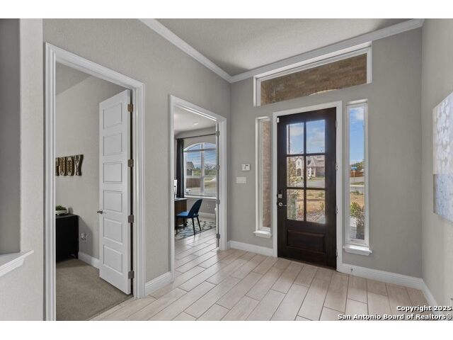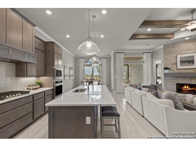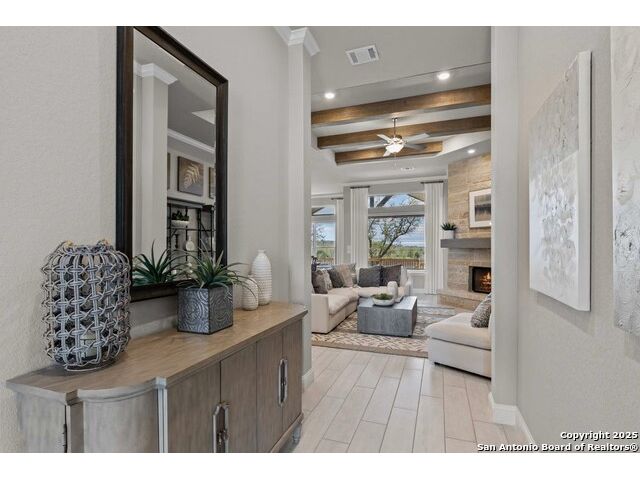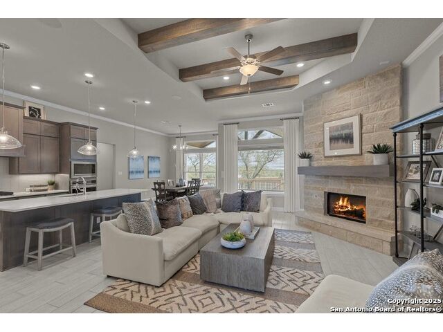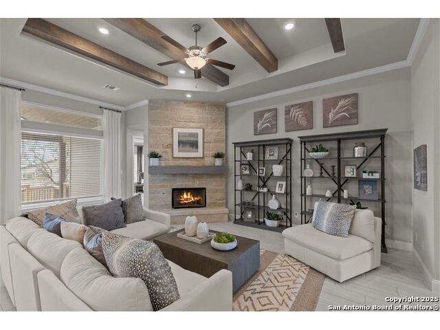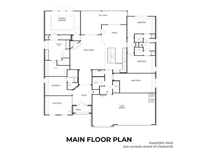 The Garner's covered entry and impressive foyer with soaring 12' ceiling flow into the expansive family room, with a view of the sought-after covered outdoor living beyond. The kitchen overlooks the dining area and the family room, which features a corner fireplace. A center island highlights the kitchen along with plenty of cabinet space, and a sizable walk-in pantry. The beautiful primary suite is complete with a tray ceiling, a large walk-in closet, a spacious bathroom with separate vanities, soaking tub, luxe glass-enclosed shower, and a private water closet. Secondary bedrooms feature walk-in closets, two with a shared full hall bath, one with a private full bath. Additional highlights include a versatile flex room, a game room, a powder bath, mudroom, and additional storage throughout! Make it your own with The Garner's flexible floor plan.