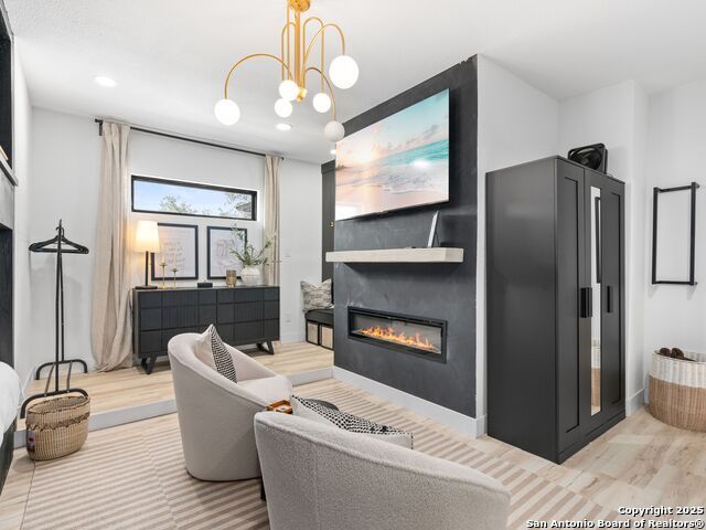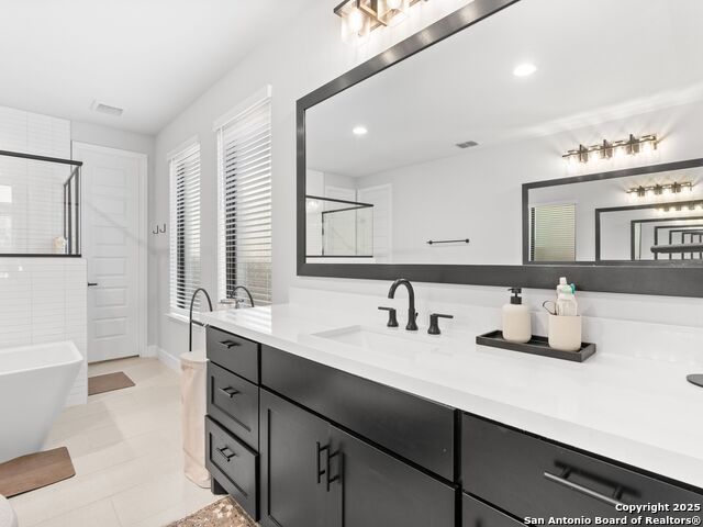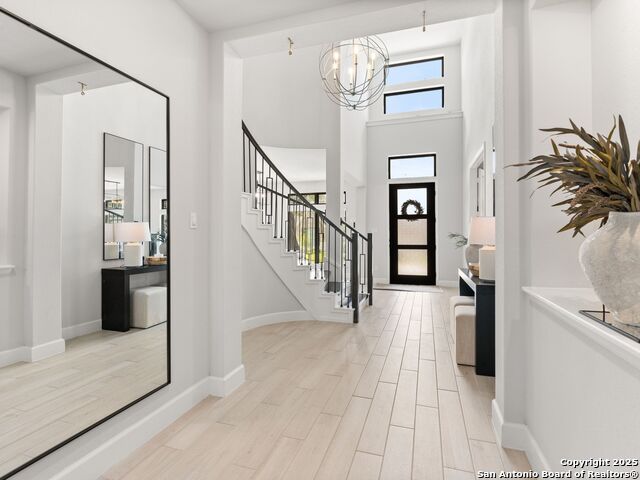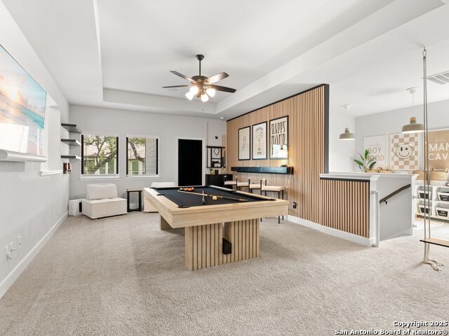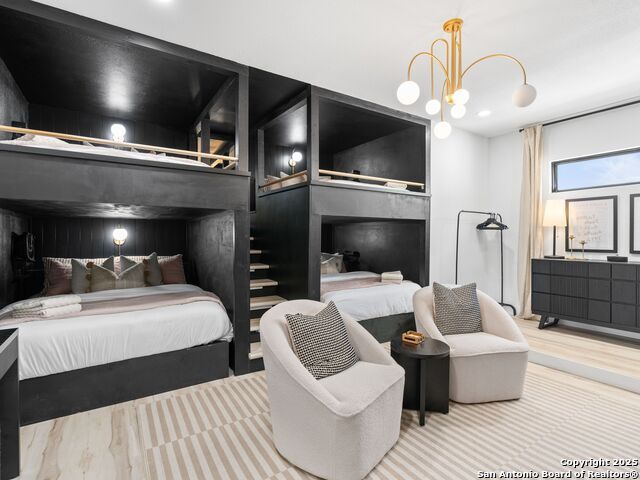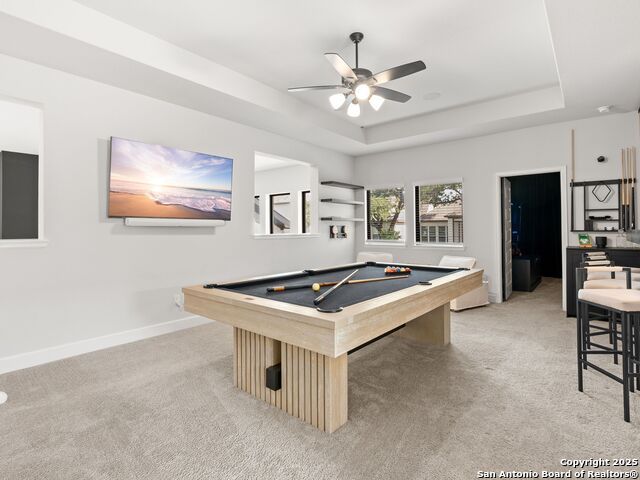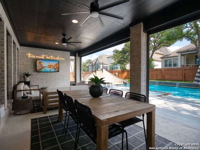 Located in the desirable community of Balcones Creek, this Perry Home offers over 5,200 square feet of thoughtfully designed living space with six bedrooms and four and a half baths. From the moment you step inside, soaring ceilings, abundant natural light, and an open floor plan set the tone for a residence that blends luxury with everyday comfort. The main level features multiple living and entertaining spaces centered around an oversized kitchen island, perfect for gatherings. Multiple bedrooms on the first floor include the primary suite with a spa-inspired bath and a private guest suite, allowing for flexibility and convenience. A formal dining area and dedicated home office enhance the functionality of the layout, offering both elegance and practicality. Upstairs, four additional bedrooms are complemented by two full baths, a spacious game room, and a media room. A custom-designed bunk room with fireplace adds a unique touch, creating a welcoming retreat for family and guests. Outdoors, a covered lounge overlooks the Keith Zars pool with water slide, providing the ultimate setting for summer enjoyment. The patio is plumbed and ready for a future outdoor kitchen, extending the entertaining space year-round. Mature landscaping, a three-car garage, and ample storage further elevate the property. With controlled neighborhood access, top-rated Boerne schools, and proximity to Lemon Creek H-E-B and upcoming retail development, this residence combines an ideal location with a lifestyle designed for both relaxation and entertaining.