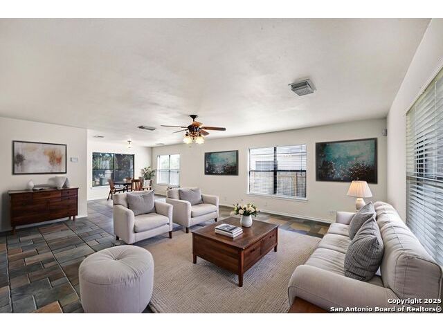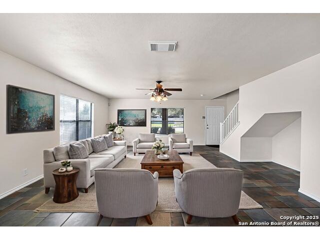 Freshly updated with big-ticket improvements, a greenbelt backdrop, and priced to leave room for your vision. This 2,334-sq-ft home in Stanton Run offers four bedrooms, two and a half baths, and a two-car garage on a generous lot that backs to a greenbelt for added privacy. Inside, the updates shine: every ceiling has been refreshed, all popcorn removed, and the interior and exterior have been freshly painted. A brand-new roof with transferable warranty and a new outdoor AC unit mean peace of mind on major systems, while the open layout gives you flexibility to design the interior to your style. The large backyard offers both space and seclusion, perfect for entertaining, play, or future projects. Stanton Run puts you near everything: Old Town Helotes is just minutes away, and Government Canyon State Natural Area offers hiking and fresh air close by. Approximate drive times include 16 minutes to The Rim and La Cantera, 16 minutes to USAA, 12 minutes to Valero and UTSA, 10 minutes to Alamo Ranch, 12 minutes to Bandera Pointe, about 25 minutes to the airport, and roughly 25 minutes to downtown San Antonio. With its updates already in place, a private greenbelt setting, and pricing that leaves room for more improvements, this home delivers flexibility, value, and a location that connects you to both nature and city life.