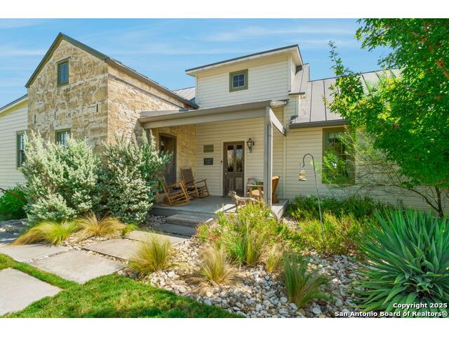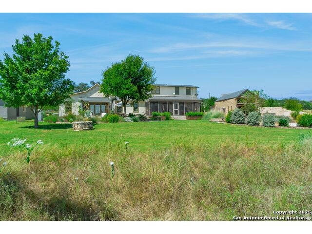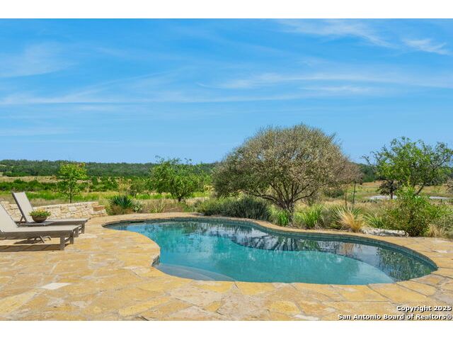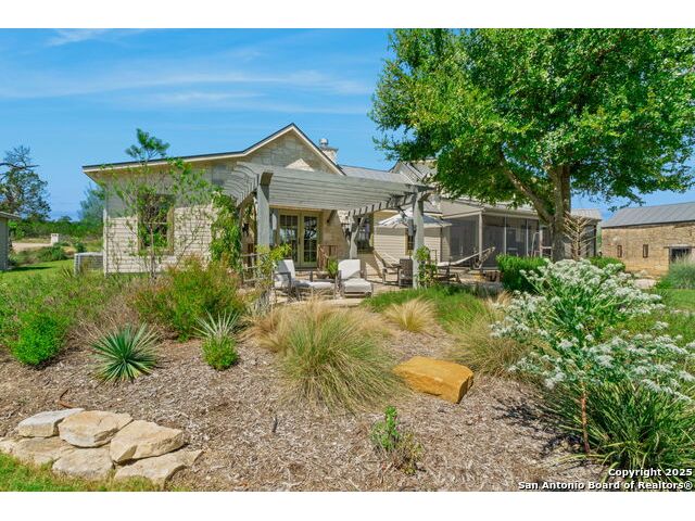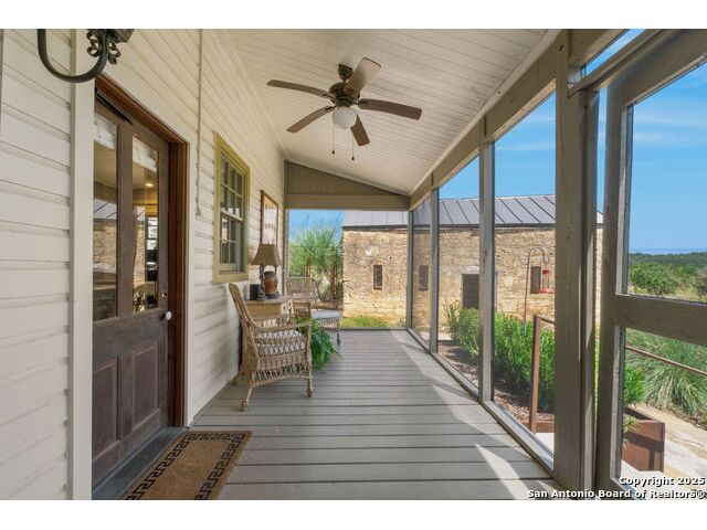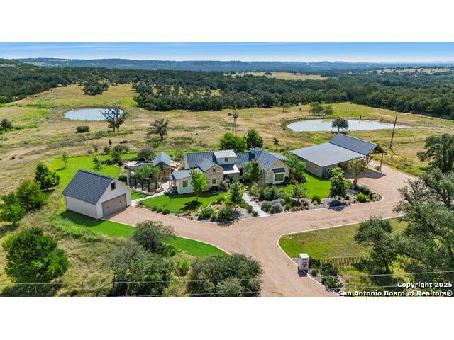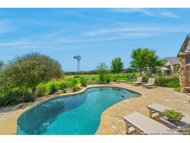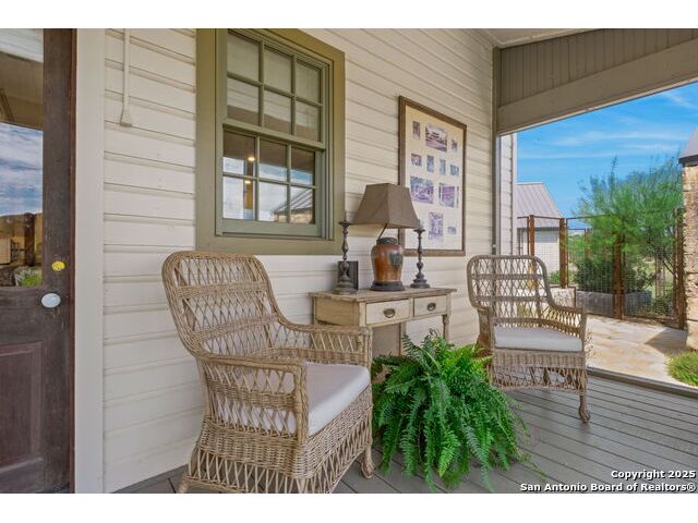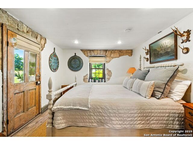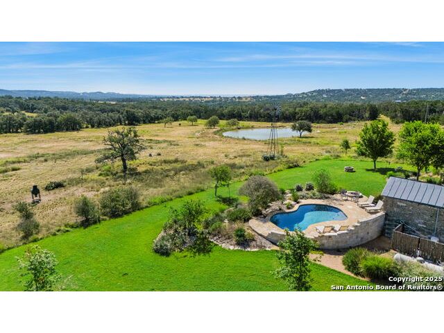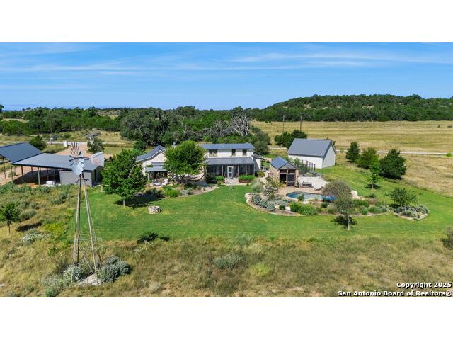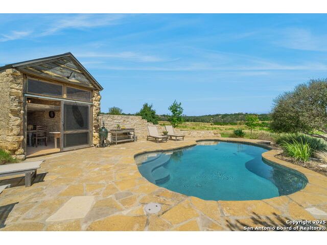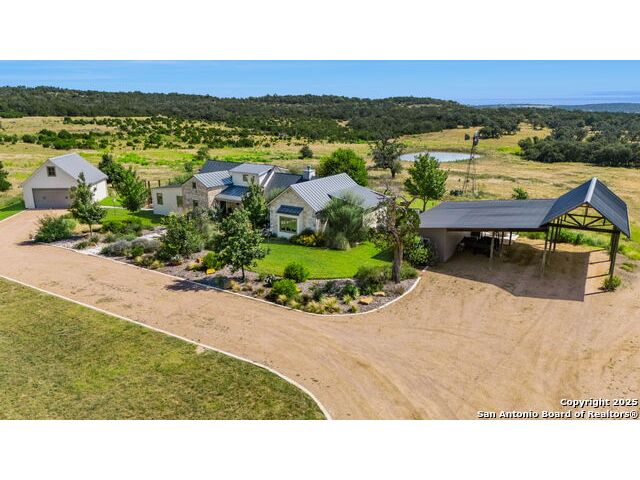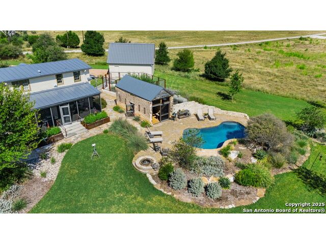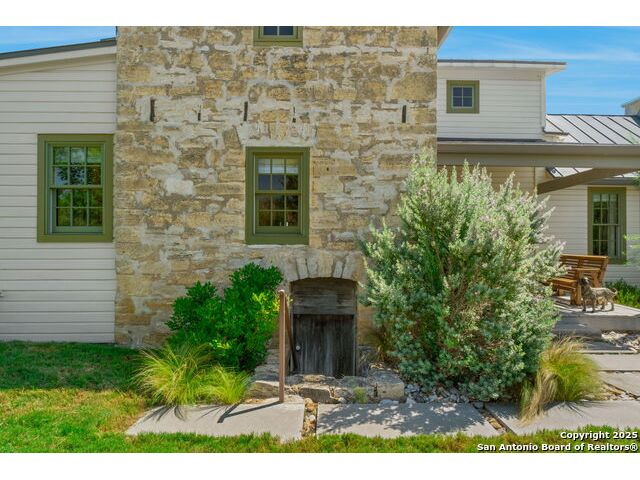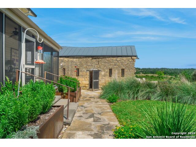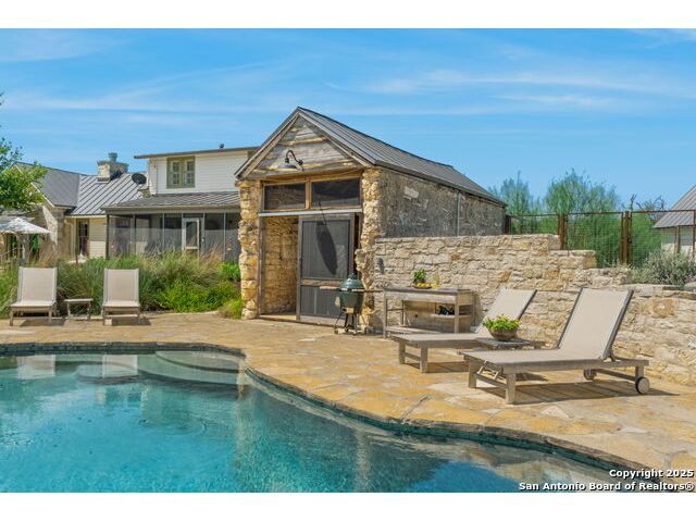 Step into a rare piece of Fredericksburg history, thoughtfully reimagined for modern living. Originally built in the 1890s by German settlers, this pioneer homestead at 716 Arbor Ridge showcases timeless masonry and authentic craftsmanship that honor its roots. The original stone barn still stands, now transformed into a screened garden room overlooking the sparkling pool, while the main limestone and wood-frame home has been meticulously expanded within the last three years by Eric Mustard Architects of Fredericksburg and M-Interiors of San Antonio. Today, it offers four bedrooms, three baths, and approximately 2,500 square feet of refined interiors, with original wood floors and stone walls beautifully preserved-adding warmth, character, and a tangible connection to the artisanship of a bygone era. Interior highlights include a modern chef's kitchen with custom cabinetry, stainless appliances, a gas range, and solid countertops. The vaulted primary suite retreat features a spa-like marble shower, whirlpool bath, and custom California Closet walk-in, complemented by a rich mahogany-paneled office. Authentic farmhouse living and dining areas with a fireplace and shiplap walls provide inviting gathering spaces, while an old root cellar has been converted into an extraordinary wine room. From hand-hewn stone walls to soaring ceilings and screened porches, every corner of the home seamlessly balances old-world character with modern luxury. Set on 25 rolling acres in the heart of Texas Hill Country, this retreat is as much about lifestyle as it is about architecture. Outdoor amenities include a sparkling pool, expansive flagstone patios, a rock fire pit, multiple screened porches, and a deer-proof garden with raised beds-all enhanced by landscape design from Oro Design Group of Austin. The grounds are further distinguished by two lined and aerated ponds stocked with bait fish, two water wells (including the original hand-dug limestone well), wildlife feeders, and an iconic windmill. A detached two-car garage with additional storage pairs with an oversized carport designed to house a Prevost bus, RV, or ranch vehicles, while concrete bunkers with a workshop area and a Generac generator provide added security. With its blend of historic integrity, thoughtful design, and rare acreage just minutes from Fredericksburg, this estate offers an extraordinary opportunity to own a piece of Texas heritage while enjoying the finest comforts of today.