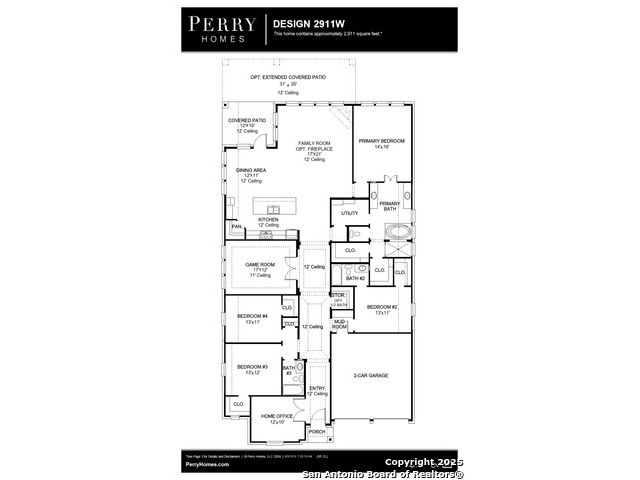 The front porch invites you into an extended entryway. French doors open into the private home office located at the front of the home. As you move through the main hallway, you'll be greeted by 12-foot coffered ceilings. The secondary bedrooms, complete with walk-in closets and bathrooms, frame the entrance. French doors open into the game room, boasting three large windows. As you continue, you'll be welcomed by the spacious kitchen, featuring a corner pantry and an island with built-in seating. Adjacent to the kitchen, the dining area connects seamlessly to the family room, adorned with a wall of windows. The primary bedroom offers ample natural light. Double doors open into the primary bathroom, complete with dual vanities, a garden tub, a separate glass-enclosed shower, two walk-in closets, and access to the utility room. Covered backyard patio. Completing the home is an extra storage closet and mud room, placed just off the two-car garage.