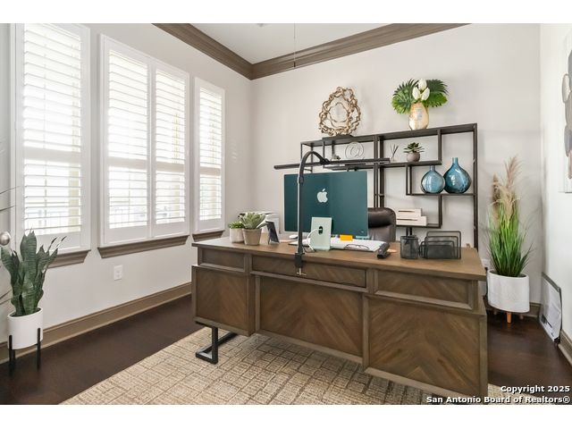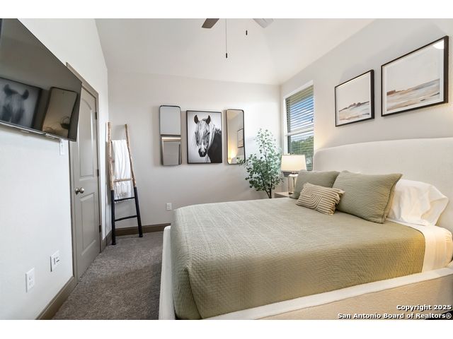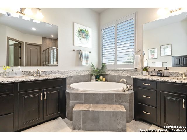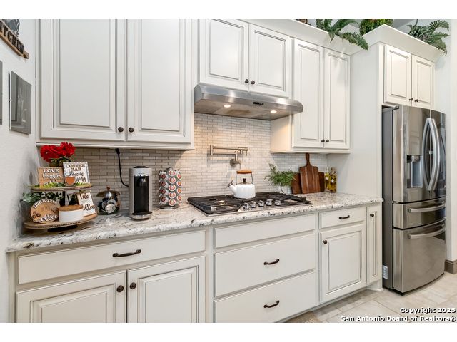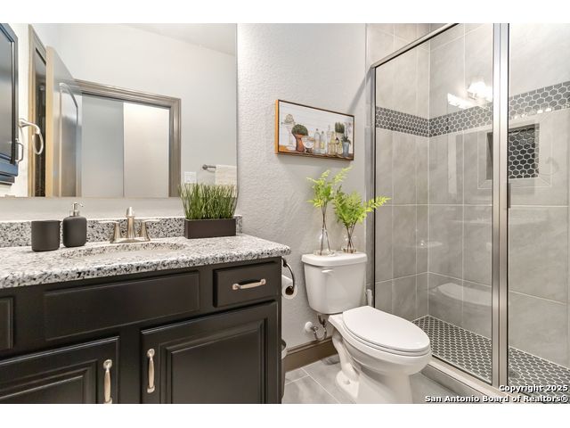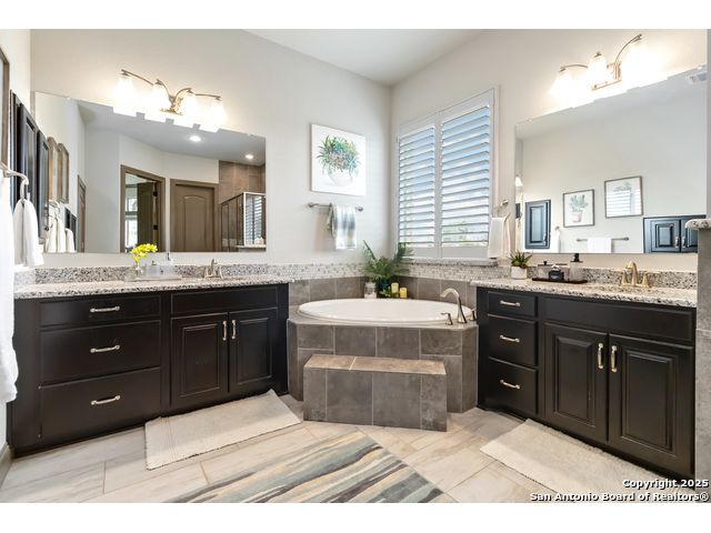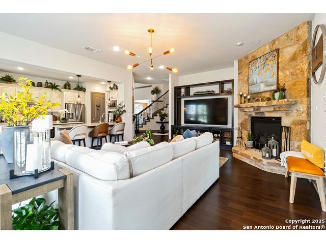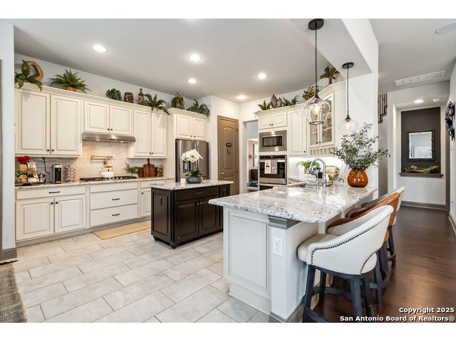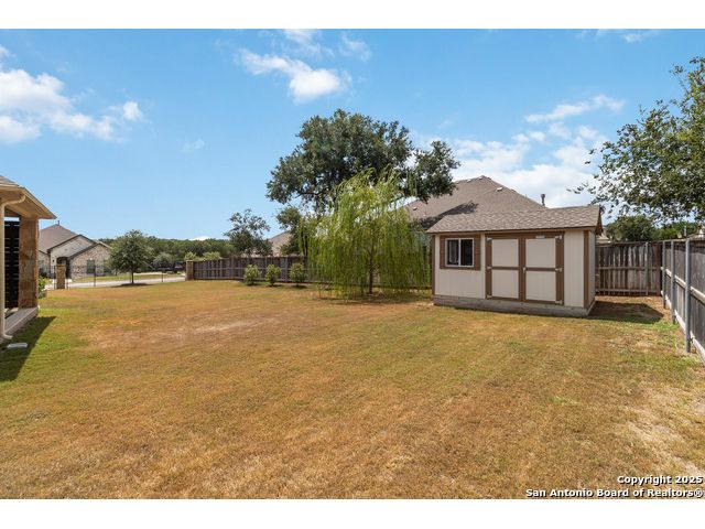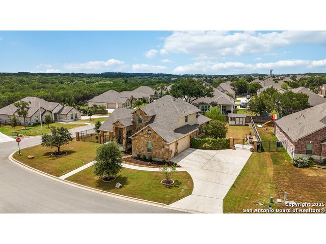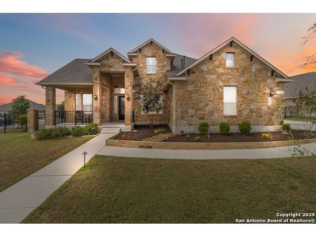 Discover the perfect blend of comfort and Hill Country living in this gently lived in 5-bedroom, 4-bathroom home with 3,542 sq. ft., built in 2021 and set on a 0.42-acre corner lot in the sought-after Manor Creek community. Designed for both everyday living and entertaining, the home features engineered hardwood floors throughout, plantation shutters, and art niches that add style and character. Downstairs master bedroom offers a huge space with a spa like bathroom with split vanities, walk-in shower, deep walk-in closet with custom cabinets. The chef's kitchen is a highlight, offering gas cooking, pot filler, granite countertops, a rough cut granite island, and stainless steel appliances, all complemented by a reverse osmosis water system. Flexible spaces include a downstairs mother-in-law suite w/ walk-in shower, private office and a media room, while the 3-car side entry garage with epoxy floors, custom sink corner and a backyard 10x14 Tuff Shed provide excellent storage options. The driveway has also been extended for flexibility. Outdoors, enjoy beautifully landscaped yards with custom stone planters that create a peaceful setting. Beautiful trees compliment the corner lot with wrought iron fencing, stone complements and Malibu Lighting package that lights up the stone exterior at night. The patio has privacy panels, ceiling fan and water/gas outlets for an outdoor kitchen. Manor Creek offers a relaxing lifestyle with an Olympic-size pool, playground, and walking trail, all within a gated community known for its wide lots and Hill Country feel. With a 1.7 tax rate and easy access to New Braunfels shopping, dining, and recreation, this property combines tranquility with convenience. Wonderful granite counters with rough cut granite island, whole house vacuum, sound systems, iQPanel for the connected house, 2 hot water heaters, built-ins for storage, custom cabinets/counter in laundry room, contemporary updated lighting throughout and Builders warranty. The list of upgrades to this home is long and valued at approximately $100k per seller. Just minutes to schools, shopping and restaurants! Just minutes to downtown New Braunfels and 14 minutes to Gruene Historic area. Great location between San Antonio and Austin!