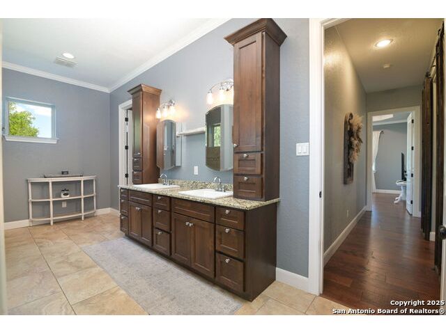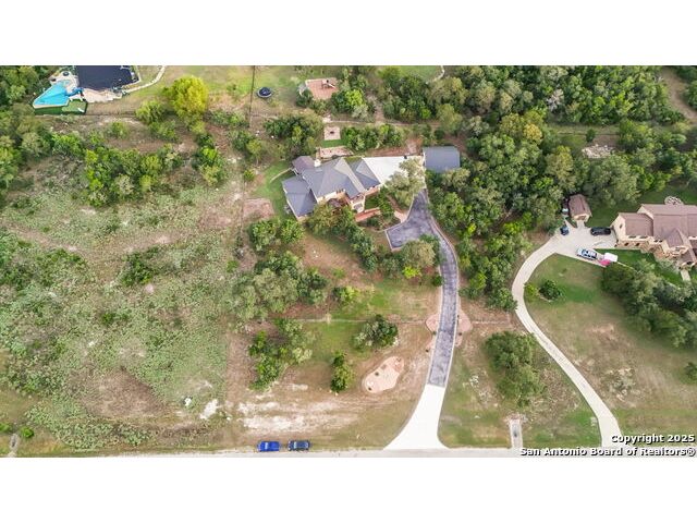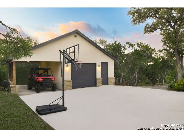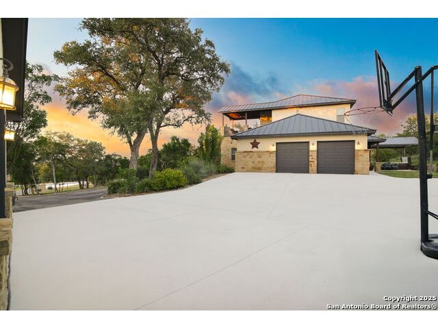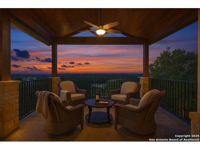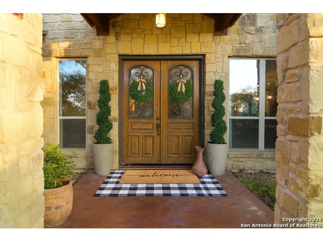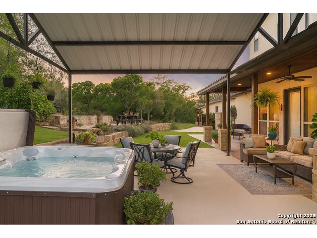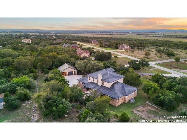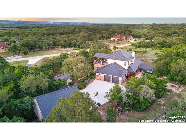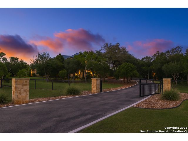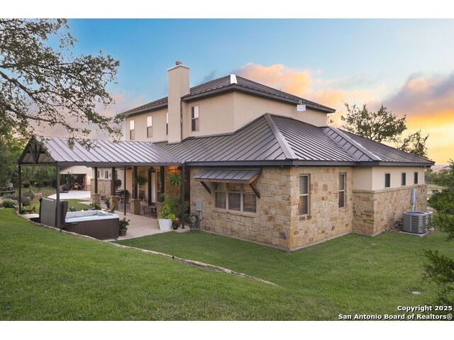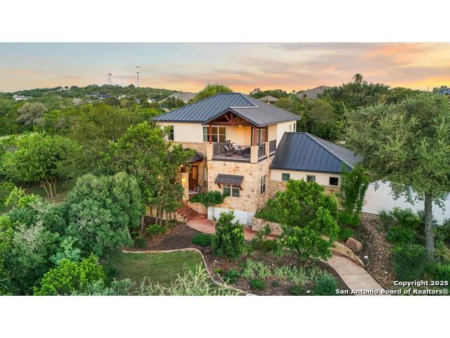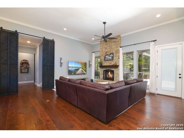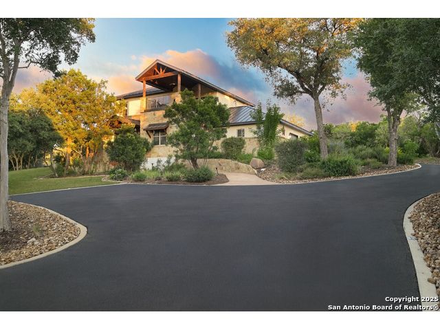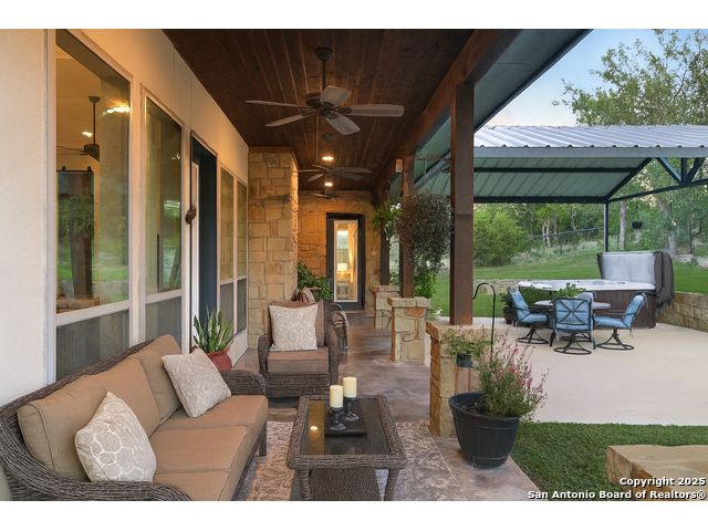 Assumable 4.375 VA loan! San Antonio luxury meets Hill Country charm in this immaculate custom home on 1.5 acres in gated Ridgeview Ranch. The stone & stucco exterior, standing seam roof, and private electric gate set the stage for elegance and privacy. Inside, hardwood floors, crown molding, and soaring ceilings frame an open layout with a dramatic floor-to-ceiling stone fireplace and walls of windows. The chef's kitchen features granite counters, custom cabinetry, subway tile backsplash, pendant lighting, breakfast bar seating, and a double butler's pantry. The downstairs primary suite offers patio access, tray ceiling, a spa bath with clawfoot tub, oversized tiled shower, dual vanities, and a walk-in closet with hidden safe. A private study with custom shelving doubles as a secondary guest suite, flex space, or gym downstairs. Upstairs includes 2 bedrooms, a full bath with dual sinks, and a spacious game room opening to a covered balcony with cedar beams and sweeping Hill Country views. Outdoor living includes a covered patio, hot tub pavilion, stone firepit lounge, and tiered gardens under mature oaks. Plenty of parking & storage with an attached side-entry 2-car garage, detached finished garage/workshop with plumbing & oversized covered carport. Fully fenced with professionally landscaping & irrigation. No city taxes, mins to Lackland AFB!