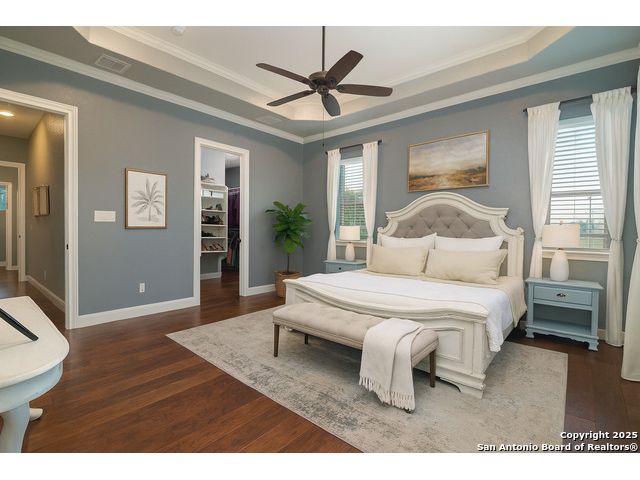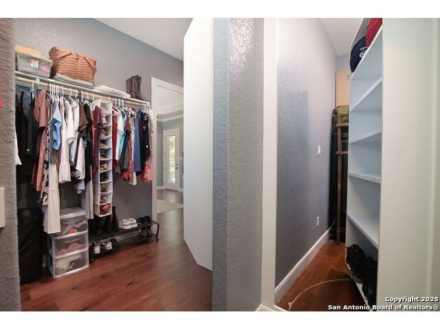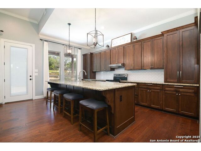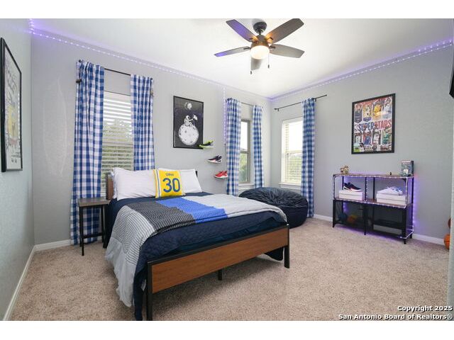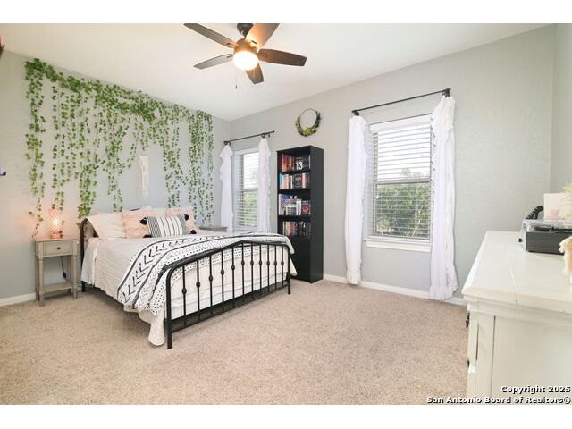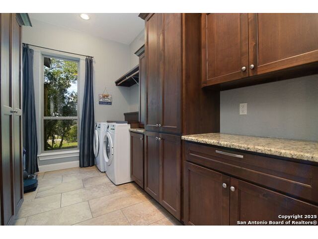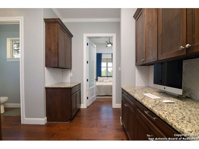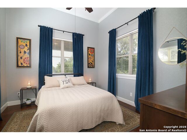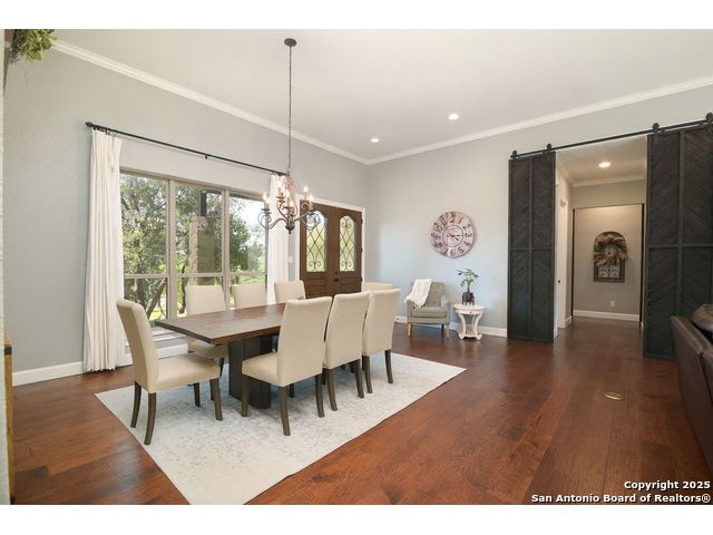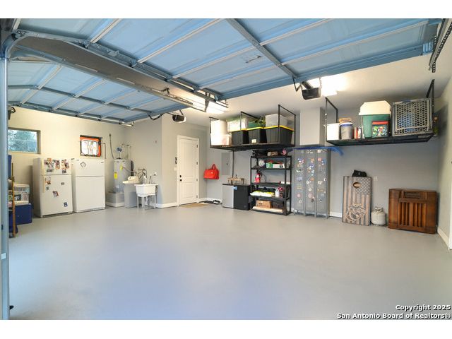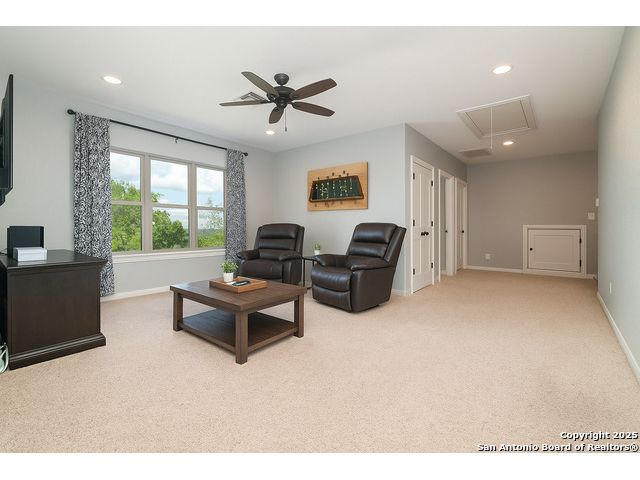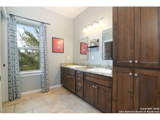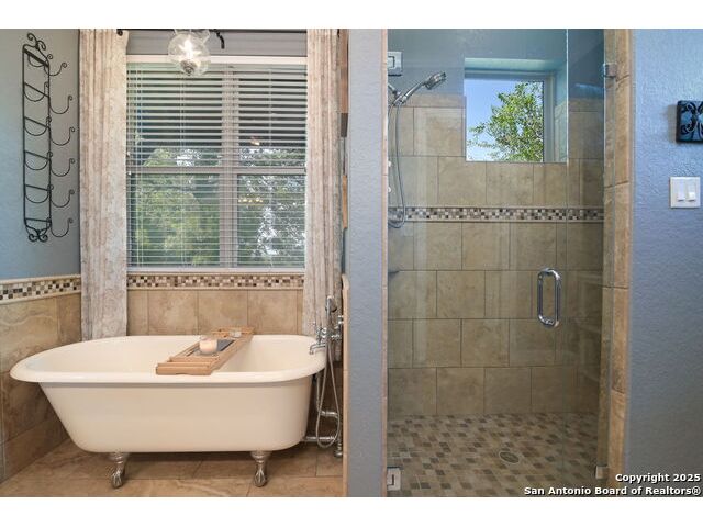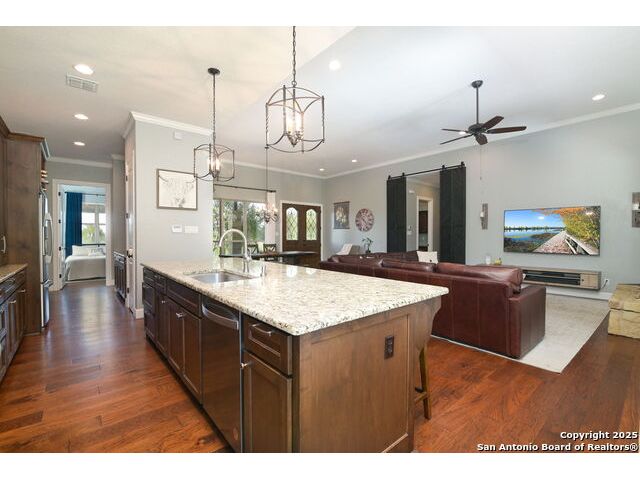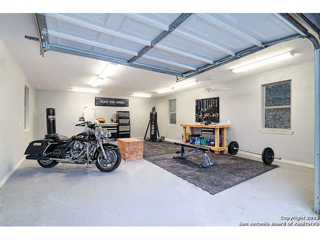 Assumable 4.375 VA loan! San Antonio luxury meets Hill Country charm in this immaculate custom home on 1.5 acres in gated Ridgeview Ranch. The stone & stucco exterior, standing seam roof, and private electric gate set the stage for elegance and privacy. Inside, hardwood floors, crown molding, and soaring ceilings frame an open layout with a dramatic floor-to-ceiling stone fireplace and walls of windows. The chef's kitchen features granite counters, custom cabinetry, subway tile backsplash, pendant lighting, breakfast bar seating, and a double butler's pantry. The downstairs primary suite offers patio access, tray ceiling, a spa bath with clawfoot tub, oversized tiled shower, dual vanities, and a walk-in closet with hidden safe. A private study with custom shelving doubles as a secondary guest suite, flex space, or gym downstairs. Upstairs includes 2 bedrooms, a full bath with dual sinks, and a spacious game room opening to a covered balcony with cedar beams and sweeping Hill Country views. Outdoor living includes a covered patio, hot tub pavilion, stone firepit lounge, and tiered gardens under mature oaks. Plenty of parking & storage with an attached side-entry 2-car garage, detached finished garage/workshop with plumbing & oversized covered carport. Fully fenced with professionally landscaping & irrigation. No city taxes, mins to Lackland AFB!