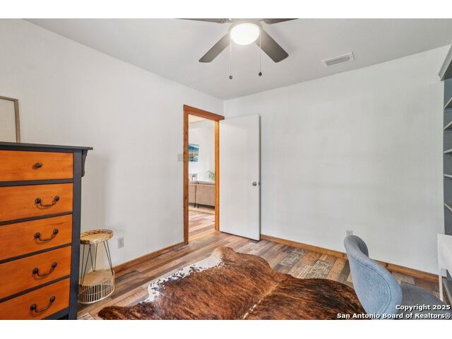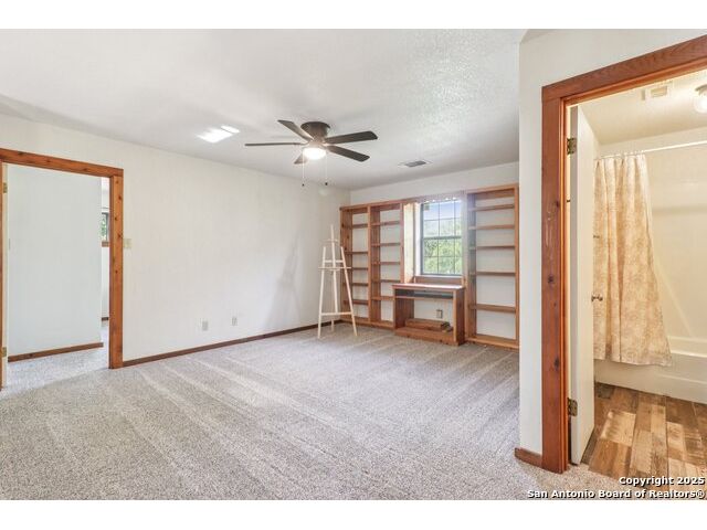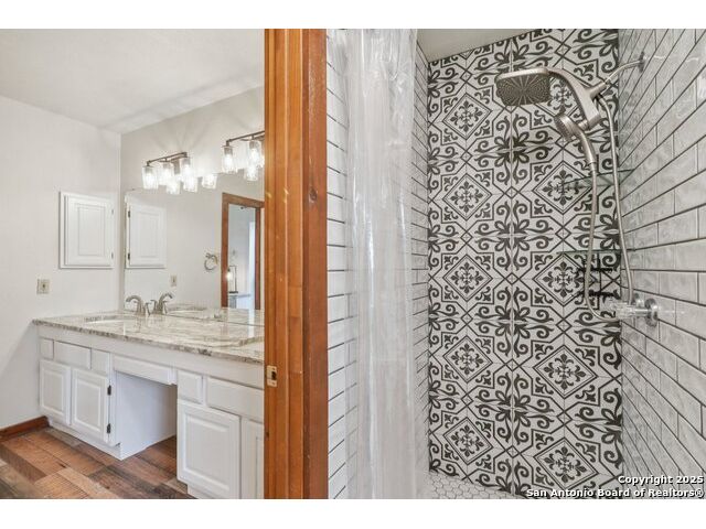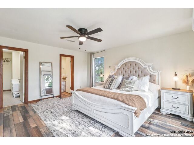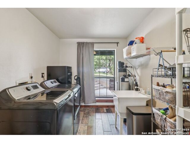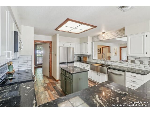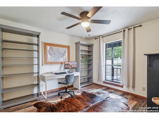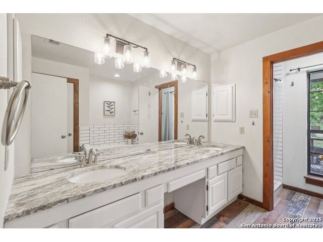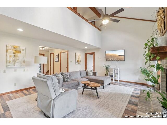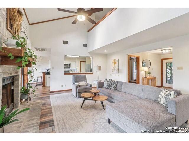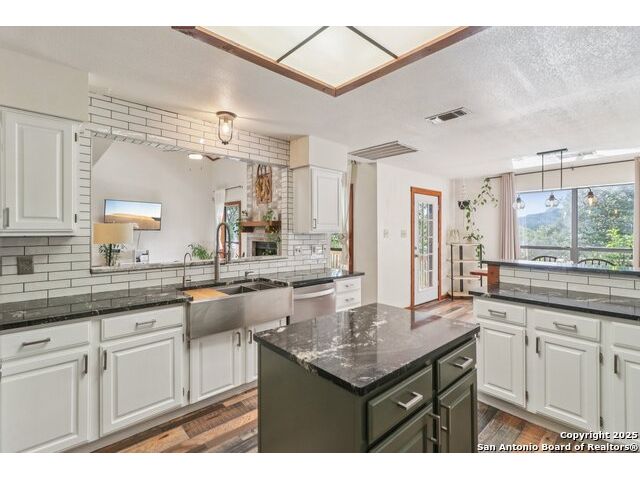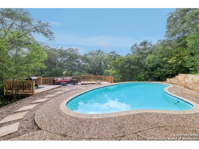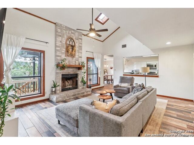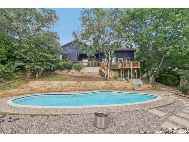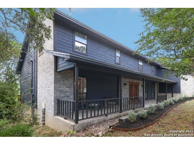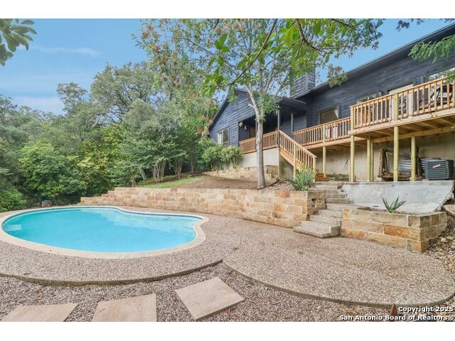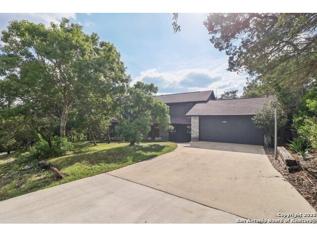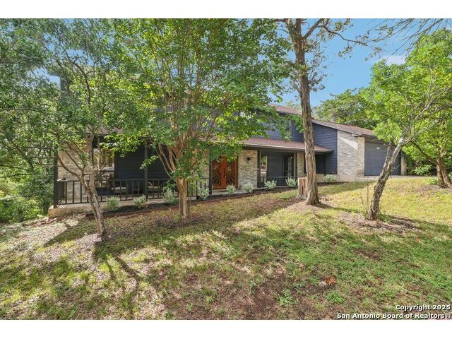 Hill Country Haven in Helotes! Nestled on over an acre of serene Hill Country landscape, this remarkable property offers the best of both worlds: peaceful country living with a quick commute to the conveniences of San Antonio. For equine enthusiasts, the property even allows horses, making it a true haven for those who crave space and serenity. A long, inviting driveway framed by mature trees sets the tone, guiding you to a home that radiates curb appeal. The navy siding and gray brick exterior give the home a timeless, polished look, while the elongated covered front porch offers the perfect spot to savor your morning coffee. Modern exterior lighting and a stunning decorative front door hint at the balance you'll find inside: modern touches thoughtfully married with rustic charm. Step inside to find a spacious foyer, where wood-look ceramic tile stretches across the first floor. Immediately to your right, a dedicated office offers views of the front yard, ideal for remote work but versatile enough to serve as a playroom, workout space, or homework station. Continue into the heart of the home: a light-filled living space with vaulted ceilings, skylights, and expansive windows framing stunning Hill Country views. A dramatic floor-to-ceiling brick fireplace anchors the room, seamlessly connecting it to the kitchen and dining areas. The kitchen is both beautiful and functional, with modern fixtures, solid countertops, decorative subway tile backsplash, stainless steel appliances, and a large island with a double-basin sink. Ample counter and cabinet space make meal prep and hosting a breeze, and a stylish cut-out behind the sink allows you to stay connected to the living room while entertaining. Just off the kitchen, you'll find a spacious laundry room complete with a utility sink and extra storage! The first-floor primary suite feels like its own retreat, featuring private access to the back deck and more sweeping Hill Country views. The spa-like, ensuite bathroom offers a dual sink vanity with granite countertops, a garden tub, and a walk-in shower with decorative tile. With a custom walk-in closet system, the space is designed to keep everything organized while still feeling luxurious. Upstairs, a versatile second living area with built-in shelving awaits, along with two secondary bedrooms and another full bathroom with a granite-topped vanity. The real showstopper lies just beyond the back doors. Step out onto your covered patio and expansive deck overlooking an in-ground pool and additional outdoor living space, an entertainer's dream. Lounge poolside or retreat further back to the elevated deck for unobstructed, breathtaking views of the Hill Country. Surrounded by mature trees and tucked away from the hustle and bustle, this property feels worlds away yet keeps you close to all that San Antonio has to offer. With room for horses, space to roam, and endless views to enjoy, this is more than a home; it's your own Hill Country haven.