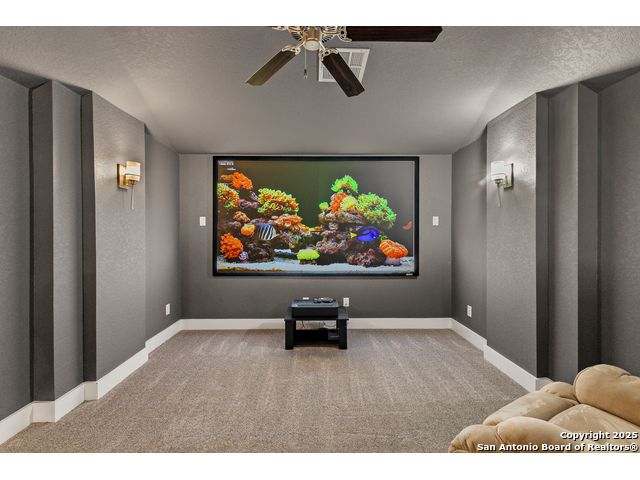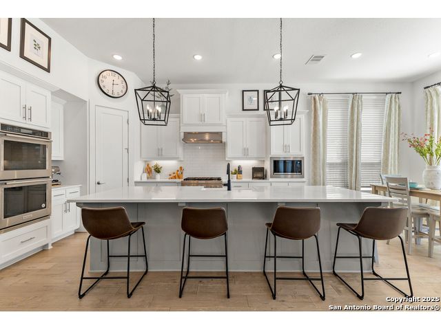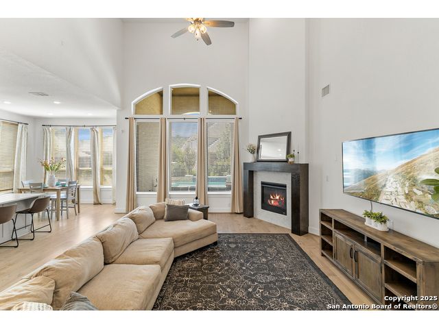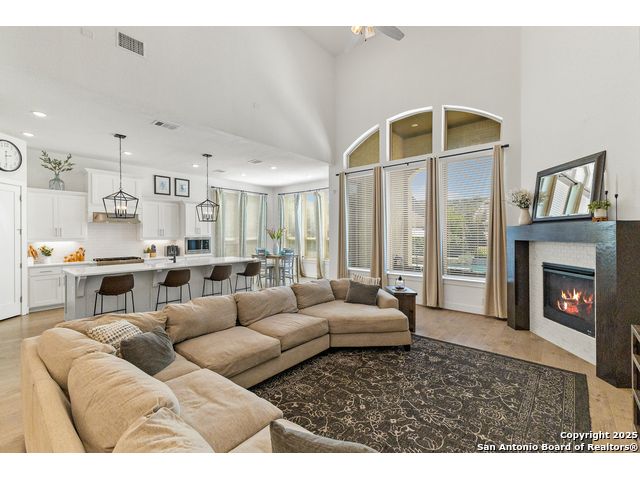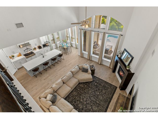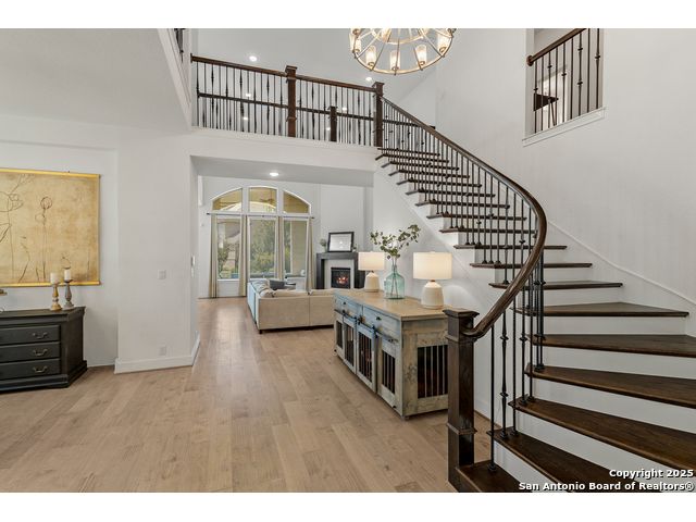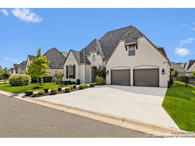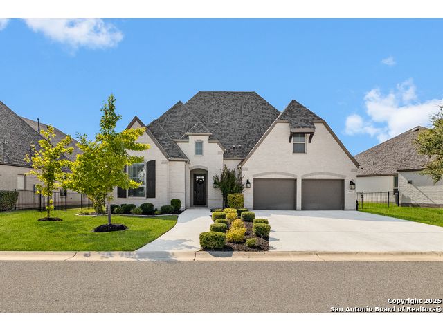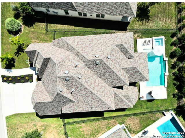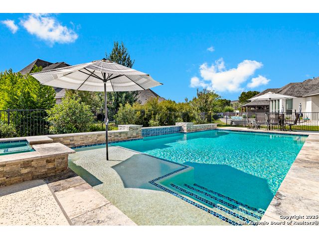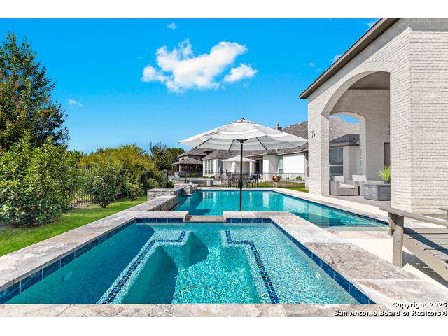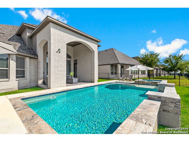 This breathtaking 5 bedroom, 4.5 bath residence is perfectly positioned on a low-maintenance garden lot. With soaring ceilings, abundant natural light, and a spacious open floor plan, this home seamlessly blends elegance with everyday comfort. Inside, multiple living areas provide flexibility for every lifestyle including a grand living room, game room, media room, office/weight room, loft, and an oversized fifth bedroom. The gourmet kitchen features a striking quartz-topped island and opens to a warm family room with a cozy fireplace. Step outside to your private retreat with a heated swimming pool and spa, designed for year-round enjoyment. The luxurious primary suite includes a spa-like bath with soaking tub, floating glass shower, dual quartz vanities, and a walk-in closet. A secondary downstairs ensuite is ideal for guests or multigenerational living. Upstairs, you'll find a loft, game room, media room, secondary bedrooms connected by a Jack and Jill bathroom, and a private bath for the fifth bedroom. Located just minutes from IH-10, Loop 1604, The Rim, La Cantera, the Medical Center, USAA, and major business campuses this home offers unmatched luxury and convenience in one of San Antonio's most desirable locations.
