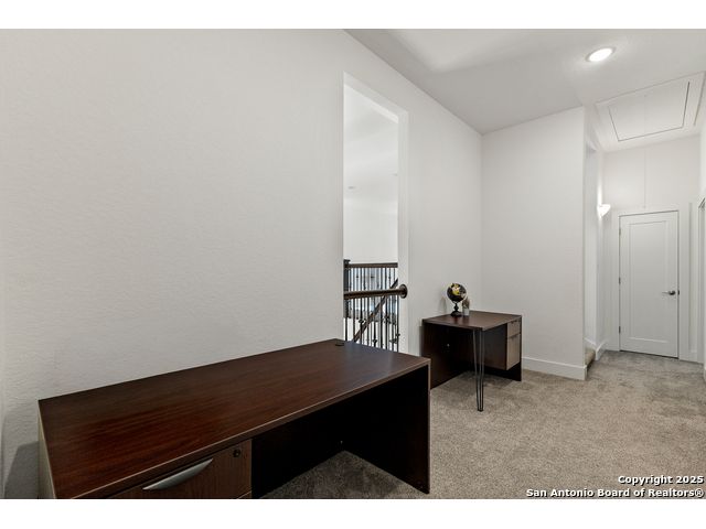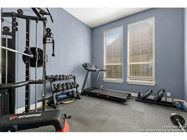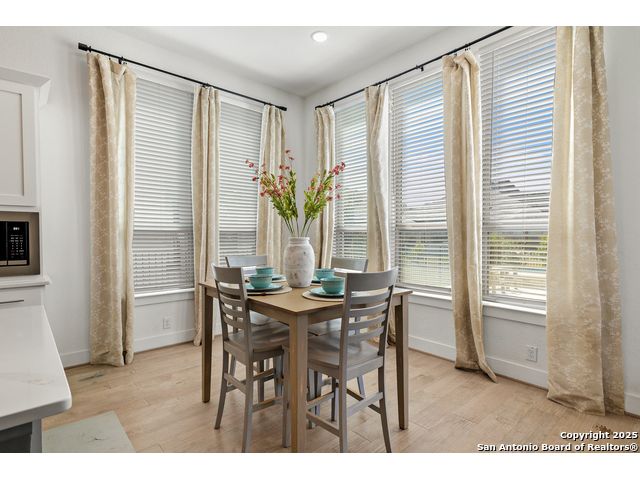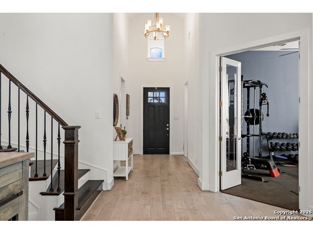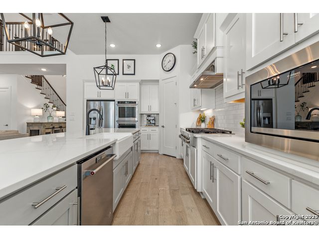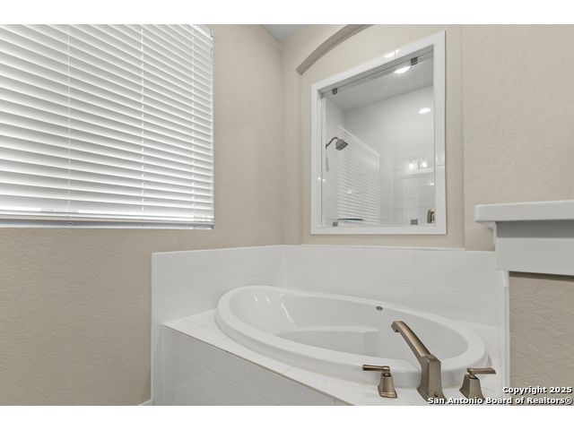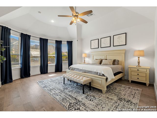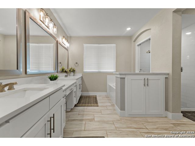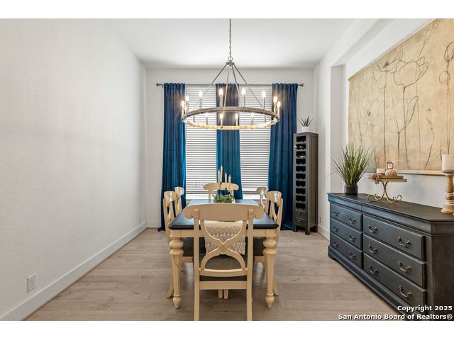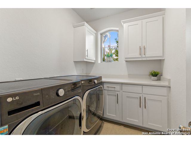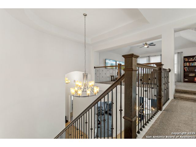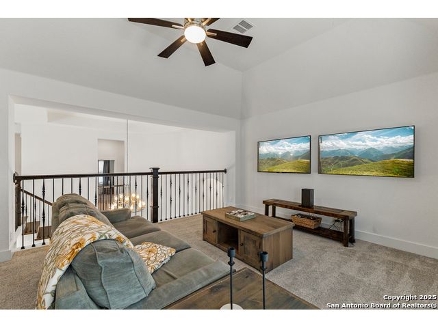 This breathtaking 5 bedroom, 4.5 bath residence is perfectly positioned on a low-maintenance garden lot. With soaring ceilings, abundant natural light, and a spacious open floor plan, this home seamlessly blends elegance with everyday comfort. Inside, multiple living areas provide flexibility for every lifestyle including a grand living room, game room, media room, office/weight room, loft, and an oversized fifth bedroom. The gourmet kitchen features a striking quartz-topped island and opens to a warm family room with a cozy fireplace. Step outside to your private retreat with a heated swimming pool and spa, designed for year-round enjoyment. The luxurious primary suite includes a spa-like bath with soaking tub, floating glass shower, dual quartz vanities, and a walk-in closet. A secondary downstairs ensuite is ideal for guests or multigenerational living. Upstairs, you'll find a loft, game room, media room, secondary bedrooms connected by a Jack and Jill bathroom, and a private bath for the fifth bedroom. Located just minutes from IH-10, Loop 1604, The Rim, La Cantera, the Medical Center, USAA, and major business campuses this home offers unmatched luxury and convenience in one of San Antonio's most desirable locations.