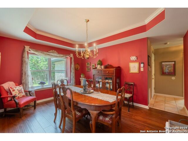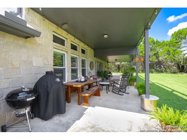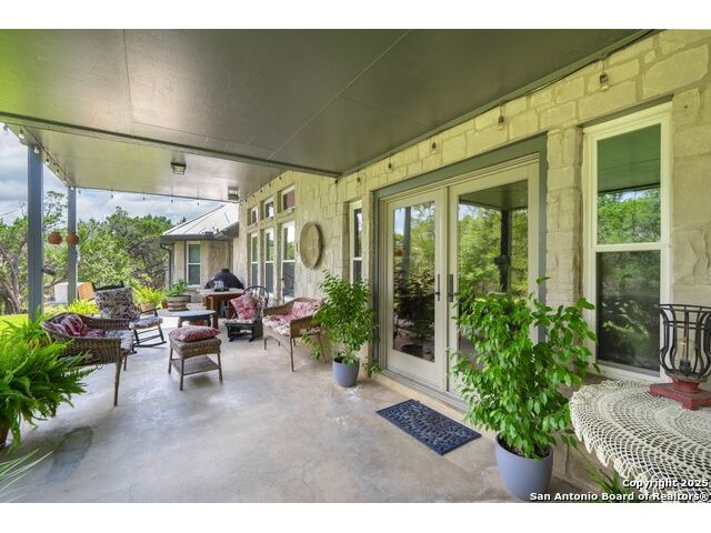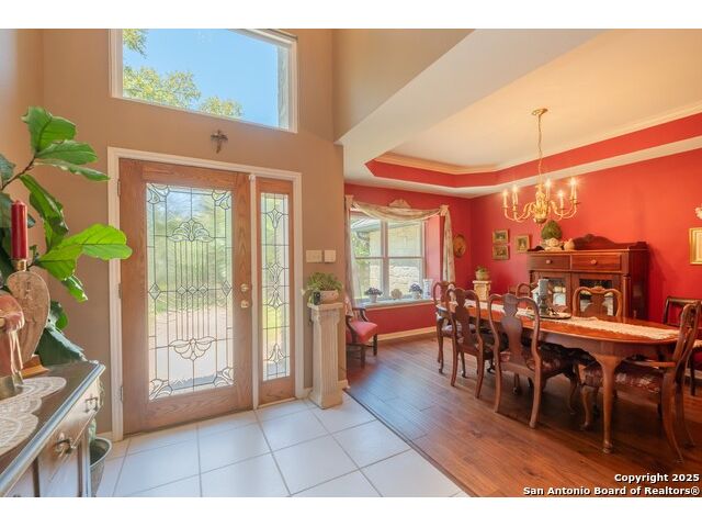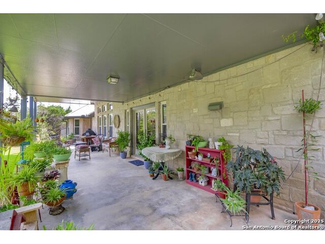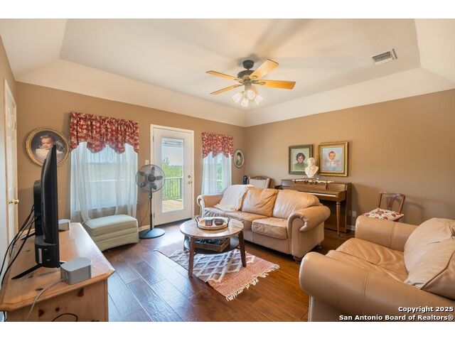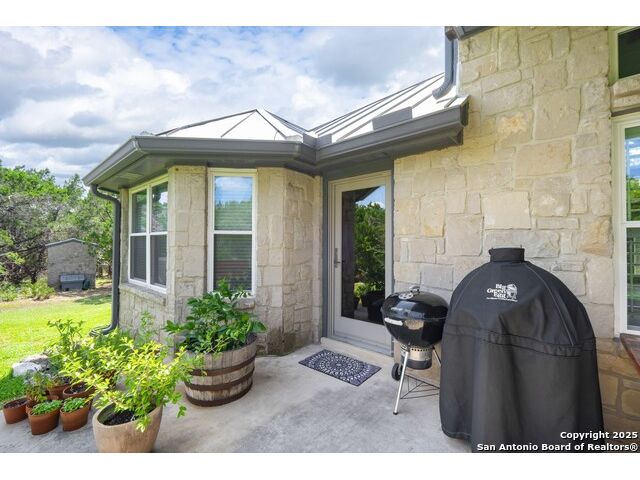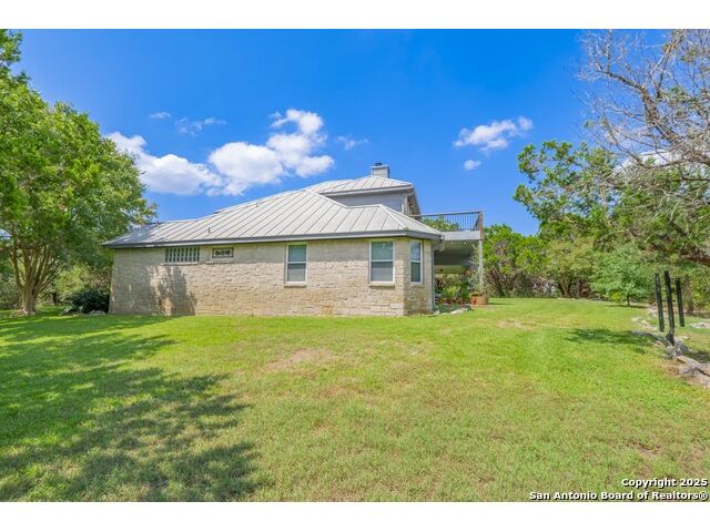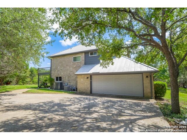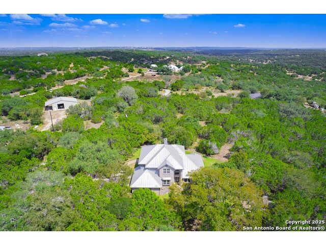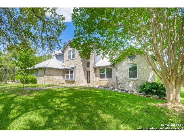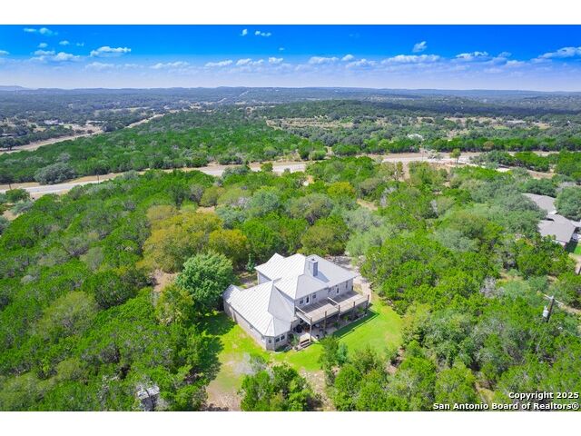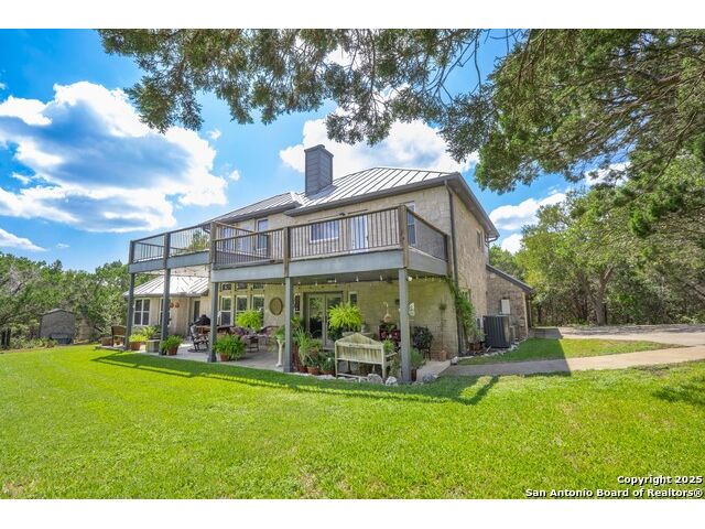 Set on 5.04 acres in the heart of Comal County, this spacious 3,095 sq. ft. home blends Hill Country charm with modern comfort. The property offers both privacy and convenience, just a short drive from New Braunfels, San Antonio, and Canyon Lake. Inside, the 2-story layout features 4 bedrooms plus an office, 3.5 baths, and a thoughtful design filled with natural light. The foyer boasts soaring ceilings and flows into the dining room with an elegant tray ceiling. The spacious open-concept kitchen is equipped with a breakfast bar and ample cabinetry, seamlessly connecting to the breakfast nook and living room, divided by a cozy fireplace. The breakfast nook opens to the back patio, creating the perfect space for indoor-outdoor living. The primary suite is a true retreat with a tray ceiling, private patio access, and an expansive ensuite bath with dual vanities, a garden tub, separate shower, and a generous walk-in closet. Upstairs, the loft also features a tray ceiling and access to a balcony. One secondary bedroom includes its own balcony and shares a Jack-and-Jill bath, perfect for family or guests. The exterior showcases a durable metal roof, stone veneer, and a covered patio overlooking the wide-open acreage, perfect for enjoying Hill Country sunsets. Additional highlights include a 2-car side-entry garage. The land provides endless opportunities, whether you envision gardening, outdoor recreation, or simply room to roam. Located within the Durst Ranch community, this property combines the serenity of country living with close proximity to top-rated schools, shopping, dining, and entertainment.