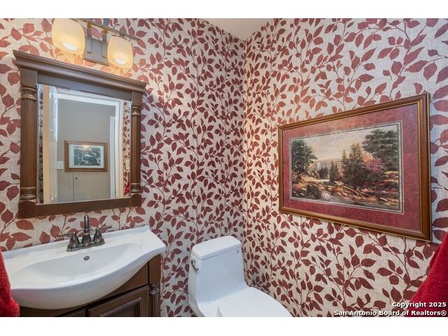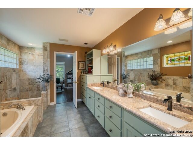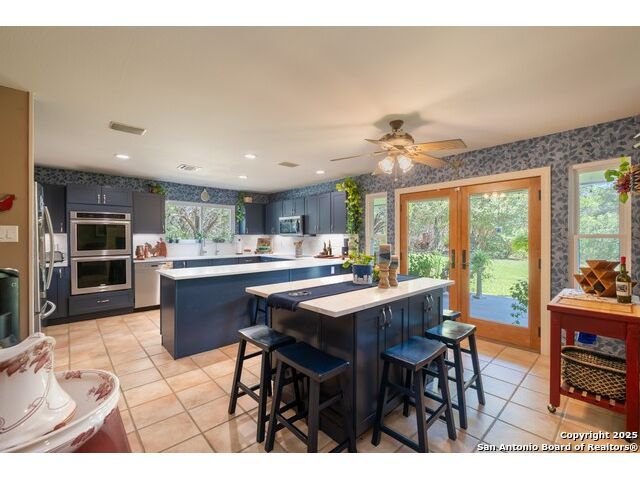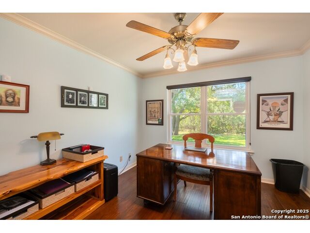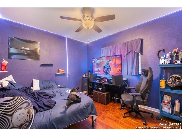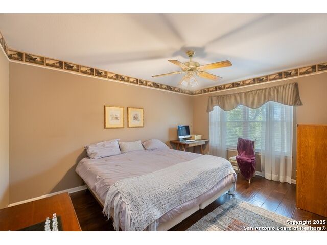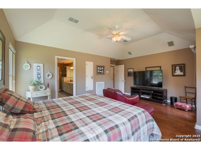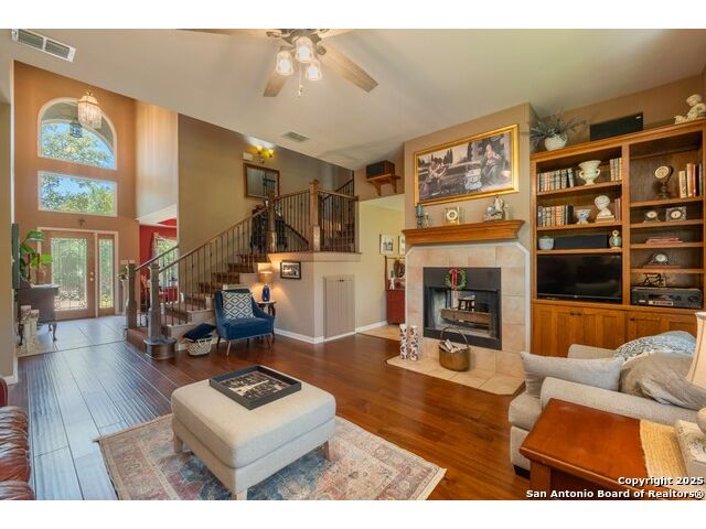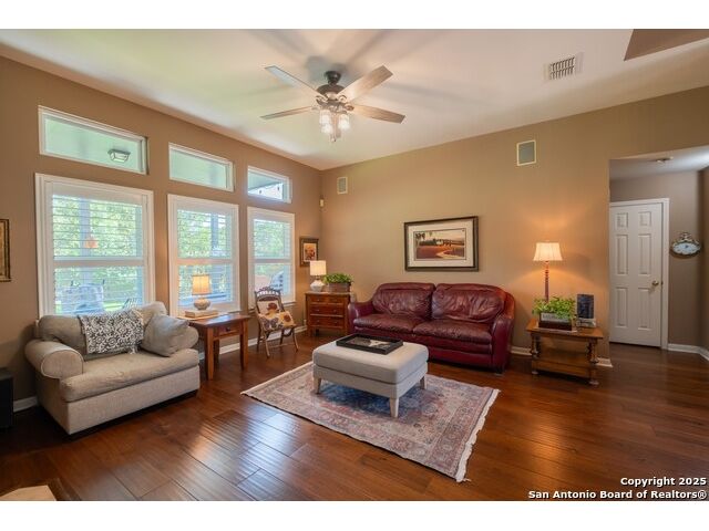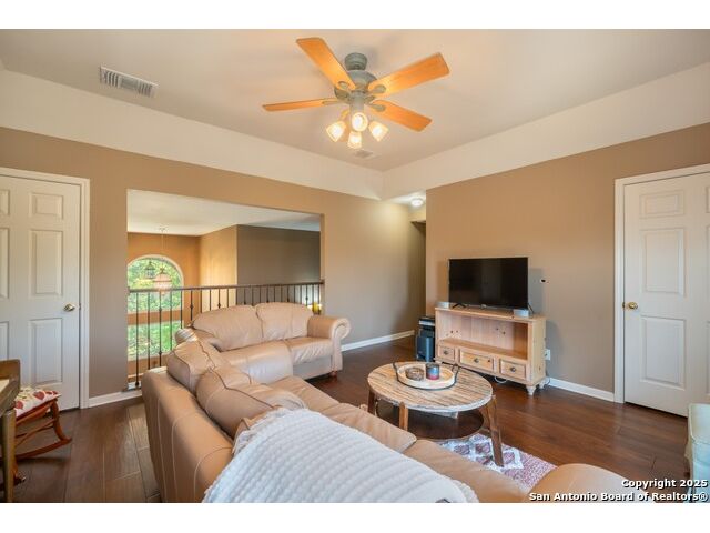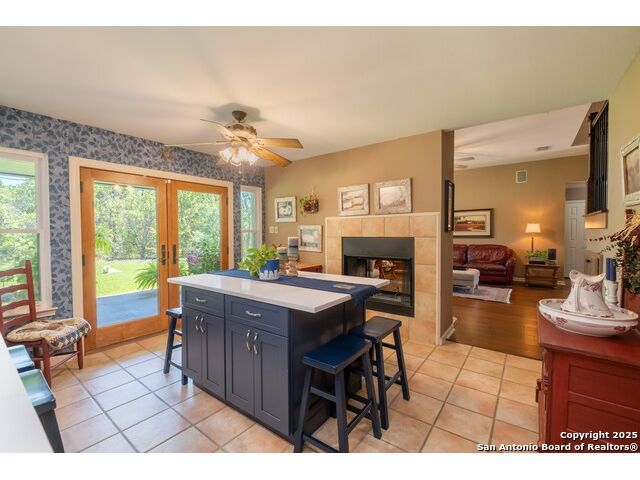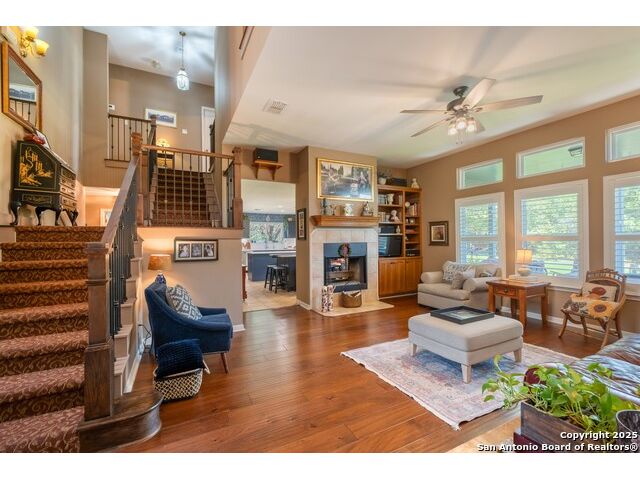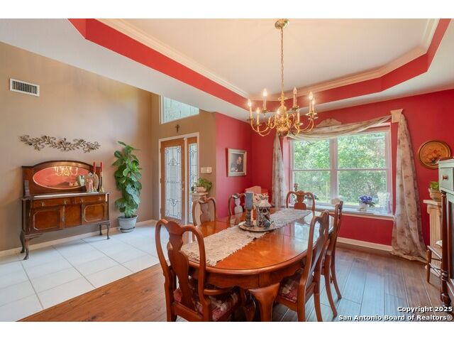 Set on 5.04 acres in the heart of Comal County, this spacious 3,095 sq. ft. home blends Hill Country charm with modern comfort. The property offers both privacy and convenience, just a short drive from New Braunfels, San Antonio, and Canyon Lake. Inside, the 2-story layout features 4 bedrooms plus an office, 3.5 baths, and a thoughtful design filled with natural light. The foyer boasts soaring ceilings and flows into the dining room with an elegant tray ceiling. The spacious open-concept kitchen is equipped with a breakfast bar and ample cabinetry, seamlessly connecting to the breakfast nook and living room, divided by a cozy fireplace. The breakfast nook opens to the back patio, creating the perfect space for indoor-outdoor living. The primary suite is a true retreat with a tray ceiling, private patio access, and an expansive ensuite bath with dual vanities, a garden tub, separate shower, and a generous walk-in closet. Upstairs, the loft also features a tray ceiling and access to a balcony. One secondary bedroom includes its own balcony and shares a Jack-and-Jill bath, perfect for family or guests. The exterior showcases a durable metal roof, stone veneer, and a covered patio overlooking the wide-open acreage, perfect for enjoying Hill Country sunsets. Additional highlights include a 2-car side-entry garage. The land provides endless opportunities, whether you envision gardening, outdoor recreation, or simply room to roam. Located within the Durst Ranch community, this property combines the serenity of country living with close proximity to top-rated schools, shopping, dining, and entertainment.