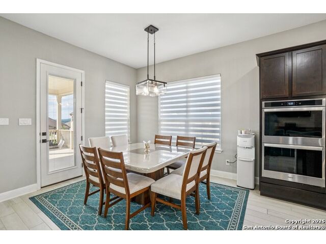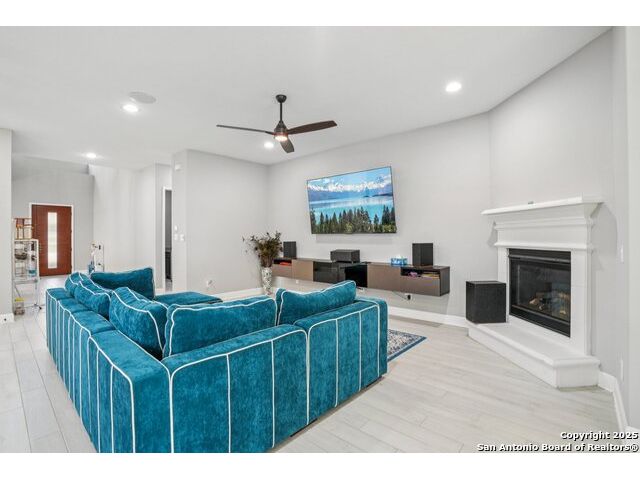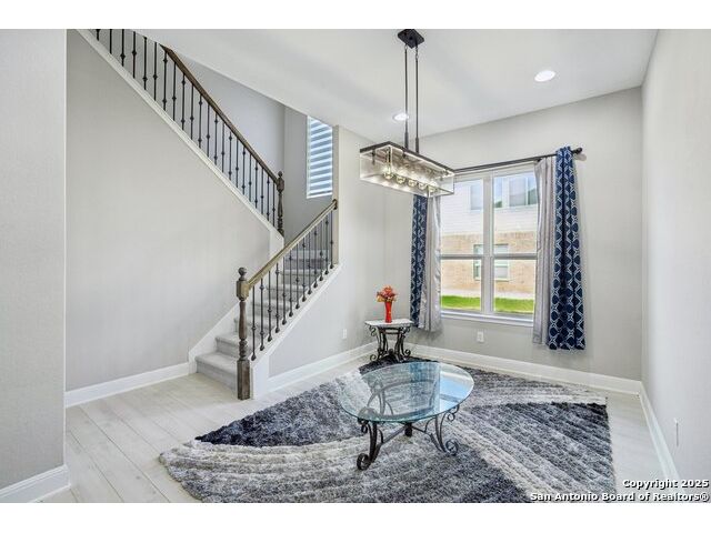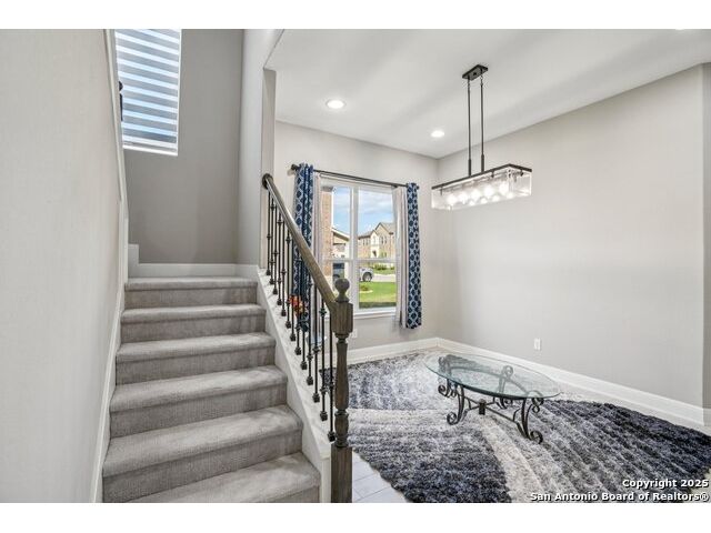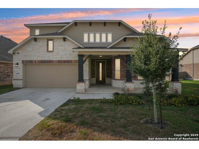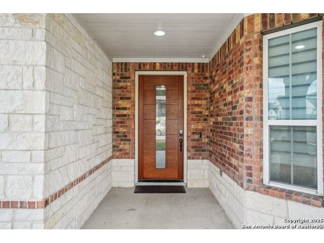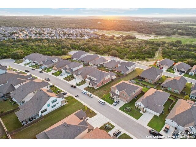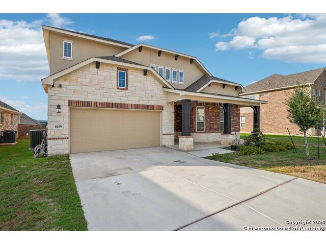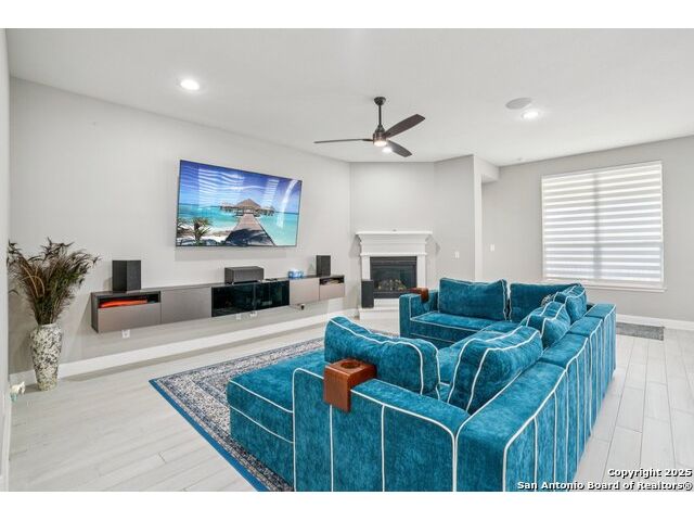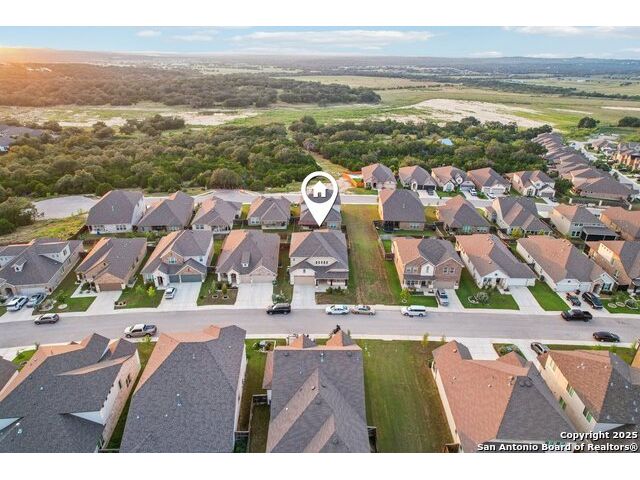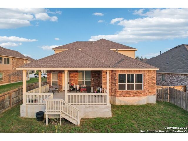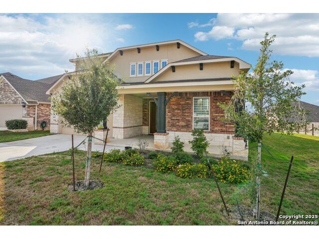 Welcome to this stunning two-story home in the highly sought-after Kinder Ranch community, feeding into top-rated Comal ISD schools. Thoughtfully designed with both comfort and style in mind, this residence offers 4 spacious bedrooms, 3 full bathrooms, a private office, game room, and a dedicated media room with added sound attenuation-perfect for movie nights or entertaining guests. The open-concept floor plan features a chef-inspired kitchen ideal for hosting gatherings, while the oversized back patio extends your living space outdoors and comes pre-plumbed for an outdoor kitchen. A grand 42-inch front entry door sets the tone for the home's modern elegance, while the garage is equipped with custom cabinetry and durable epoxy flooring for ultimate functionality. Blending convenience, upgrades, and timeless design, this home is move-in ready and waiting for its next chapter with you.