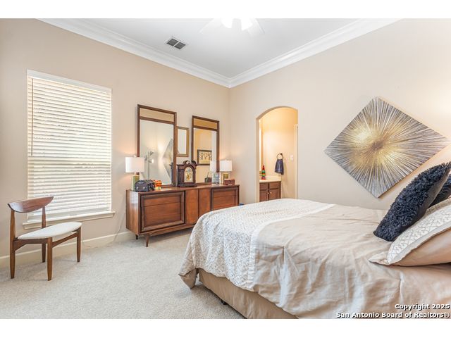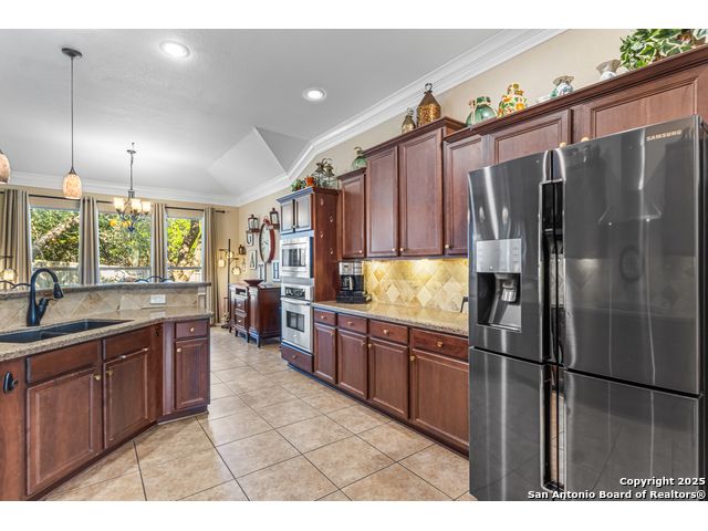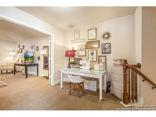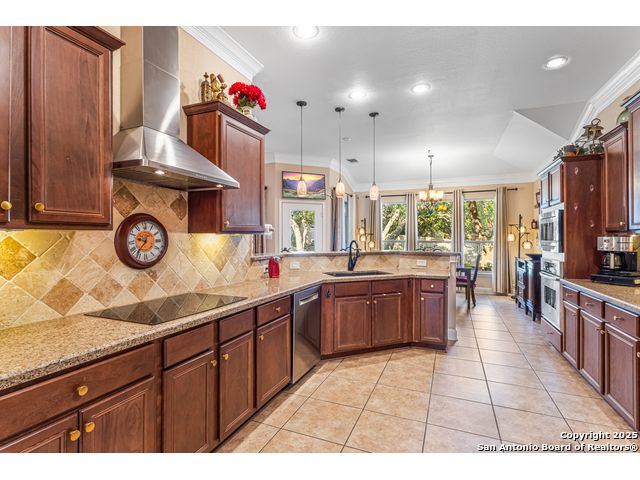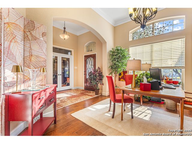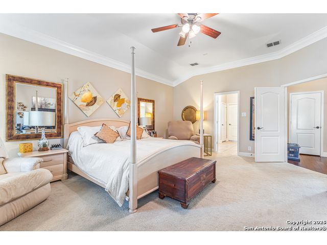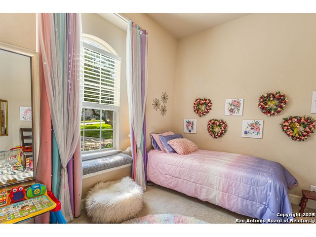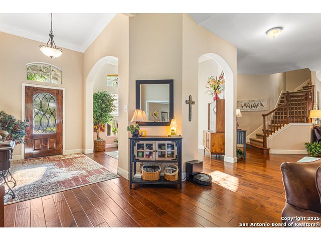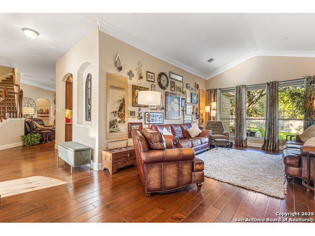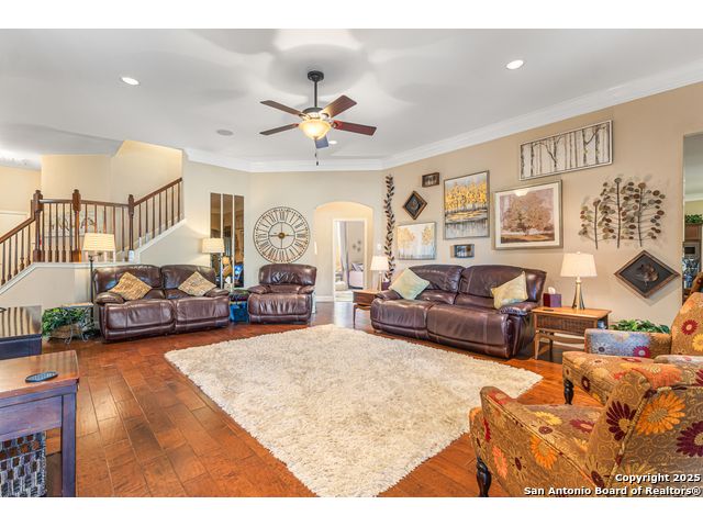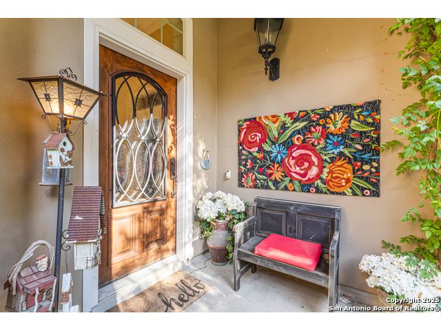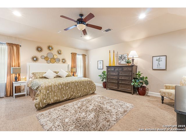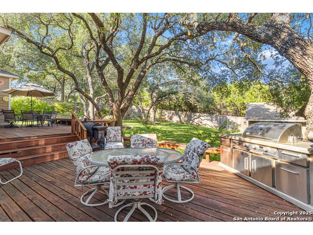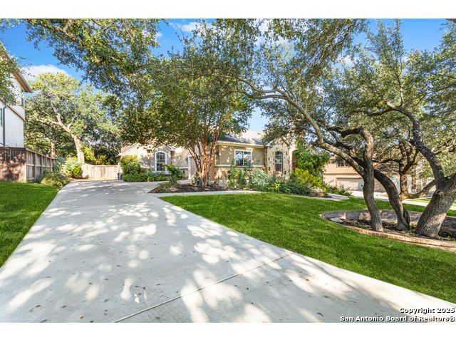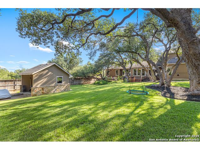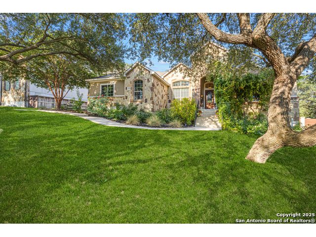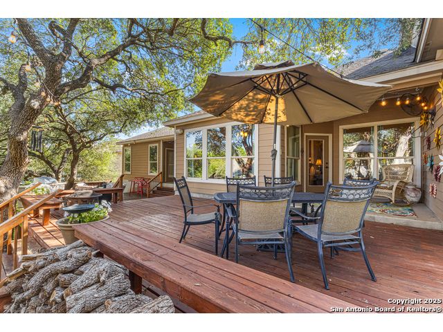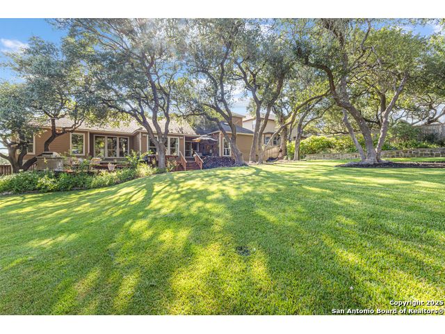 Beautiful 2-story stone and stucco Texas Hill Country home on a spacious 0.56-acre lot in the gated community of Canyon Ranch Estates! Located within highly sought-after Comal ISD, with zoning to Pieper Middle School and Pieper High School. Designed for multigenerational living, this home offers 5 bedrooms (4 downstairs), 4 full bathrooms, and a versatile upstairs flex space that can serve as a second primary suite, game room, or media room. The inviting interior features high ceilings, warm wood flooring, and an open floor plan with 3 living areas and 2 dining areas all on the main level-perfect for gatherings and entertaining. A private study with doors provides a quiet space for working from home. Step outside to enjoy the mature shade trees and a multi-level deck ideal for barbecues, relaxing, or entertaining guests. Extra storage is easy with the included backyard shed. Additional features include a sprinkler system, water softener plumbing and 1 year prepaid American Home Shield Residential Home Warranty. Make this home yours today!