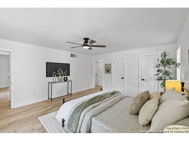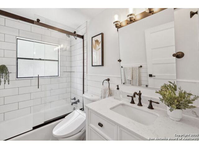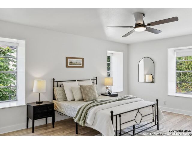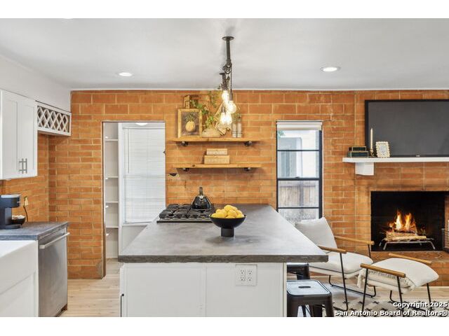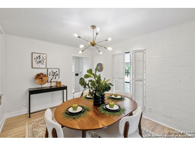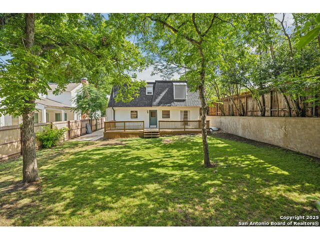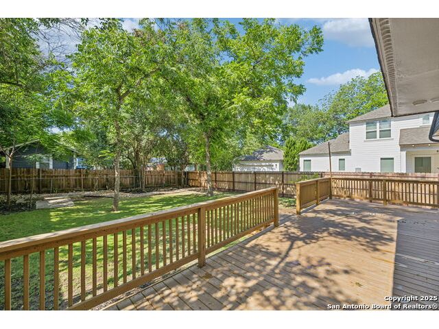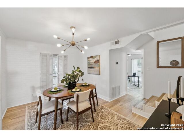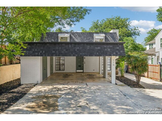 Welcome to this inviting, two-story, 3-bedroom, 2-bath home on College Boulevard in Alamo Heights. Sitting on 0.16 acre, this +\- 1,725 square foot brick contemporary features an open and bright floor plan re-imagined with today's living in mind. Downstairs there's a welcoming living room that opens to an updated galley kitchen w breakfast bar, separate dining room and bedroom - perfect as a study or home office - with full bath just around the corner. Upstairs, you'll find a well-appointed primary suite with a spa-like bath featuring a large walk-in shower, separate toilet closet and other nice appointments. There's an ample-sized second bedroom upstairs that shares entrance into the bathroom as well as to the upstairs laundry room adjacent. Bright white paint sits in contrast to a cohesive wood-colored, rustic laminate flooring and original brick wall accents throughout the home. Bathrooms have attractive tile flooring and with smooth countertop surfaces used in both the baths and kitchen. Just off the kitchen, there's a large deck and well-manicured backyard perfect for outdoor living, relaxing and entertaining. Don't miss the two generous storage closets under the home's two-car-covered carport and its freshly painted exterior. Come see this Alamo Heights charmer today.