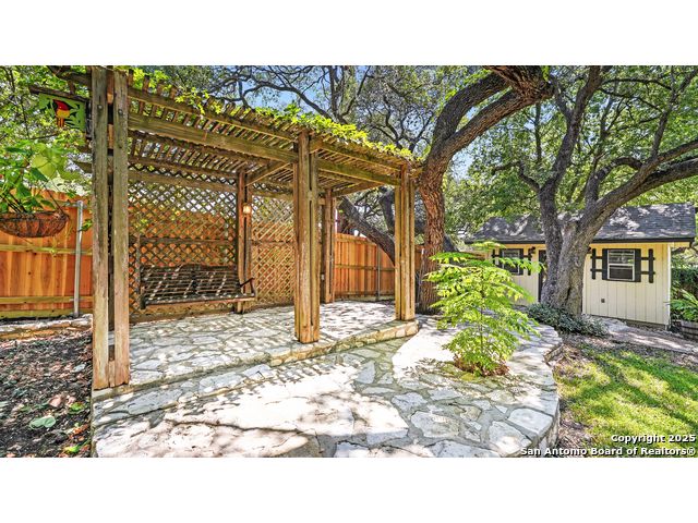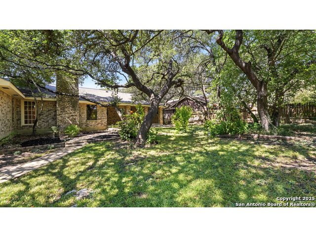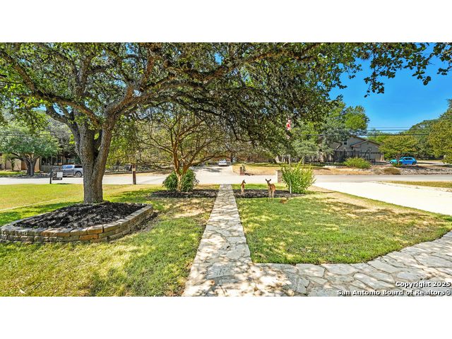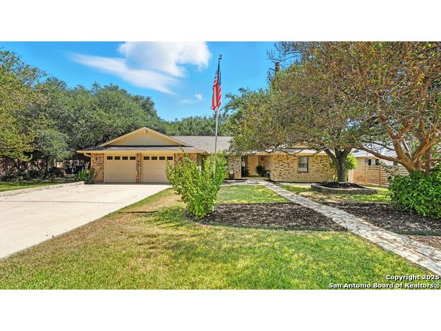 Welcome to this charming 3-bedroom, 2-bath, all-brick one-story home located in the highly desirable Oakwood Estates community on "the hill." Surrounded by manicured landscaping and mature shade trees in both the front and backyard, this property offers the perfect blend of comfort, thoughtful updates, and outdoor living. Inside, you'll find a large open living and dining room centered around a stunning rock fireplace, ideal for entertaining with seamless access to the covered patio and lush backyard. The newly renovated kitchen is a true highlight with quartz countertops, freshly painted cabinets, new light fixtures, a walk-in pantry, and premium appliances including a KitchenAid gas convection range, built-in electric oven, convection microwave, and Samsung counter-depth refrigerator. An inviting eat-in area with backyard views completes this well-designed space. The primary suite features a spacious walk-in closet and a bathroom with double sinks and granite countertops, while the secondary bath also offers dual vanities with granite along with a new toilet. The oversized 600-square-foot two-car garage provides abundant space, attic storage, and convenient side-yard access. A private "she shed" with air conditioning, electricity, Saltillo tile flooring, and additional attic storage creates the perfect retreat, hobby space, or office. The laundry room includes floor-to-ceiling built-in shelving for excellent storage or pantry overflow. Outdoor living is equally impressive with a large covered patio, a gazebo with lights on a stone patio, and a privacy fence surrounding the shady backyard. Recent updates include a new air conditioning unit and water heater, both just two years old, as well as fresh interior paint throughout the home, including the garage. All appliances convey with the sale, including the washer, dryer, and refrigerator. This home has been lovingly maintained and thoughtfully updated, offering timeless charm with modern conveniences. Nestled in one of New Braunfels' most desirable neighborhoods, it is truly a rare opportunity to enjoy peaceful living on the hill in Oakwood Estates.