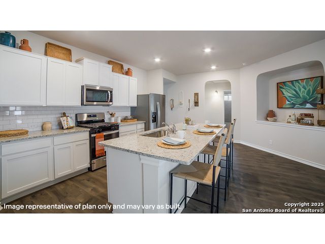 The Bryant is a stunning single-story home featured at Stonehill in San Antonio, TX. The Bryant is sure to impress with its selection of 3 front exteriors, 4 bedrooms, 2 bathrooms and 2-car garage. Welcome guests as they walk through the elongated foyer with a decorative nook wall feature to the spacious eat-in kitchen. Facing the blended dining area and living room, the kitchen includes an oversized island, corner pantry with shelving, plenty of cabinet storage, quartz countertops, stylish subway tile backsplash, stainless steel appliances, and a gas cooking range. The private main bedroom is located at the back of the house and features a relaxing ensuite bathroom complete with double vanities, a garden tub, walk-in shower, and a spacious walk-in closet. If privacy is your top priority, this bathroom comes standard with a separate water closet. Two secondary bedrooms are located off the entry and the other is centrally located off the kitchen. All have quality carpet, spacious closets and windows for plenty of natural lighting. Whether these rooms become bedrooms or other bonus spaces, there is sure to be comfort and functionality. Additional features include tall 9-foot ceilings, 2-inch faux wood blinds throughout the home, luxury vinyl plank flooring in the entry, family room, kitchen, and dining area, ceramic tile in the bathrooms and utility room, and pre-plumb for water softener loop. Relax outside on a covered patio (per plan) located off the family room and enjoy full yard landscaping and full yard irrigation. You'll enjoy added security in your new home with our Home is Connected features. Using one central hub that talks to all the devices in your home, you can control the lights, thermostat and locks, all from your cellular device.