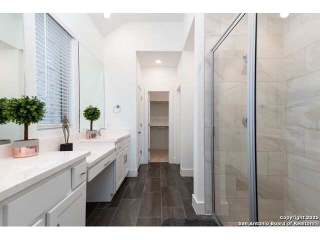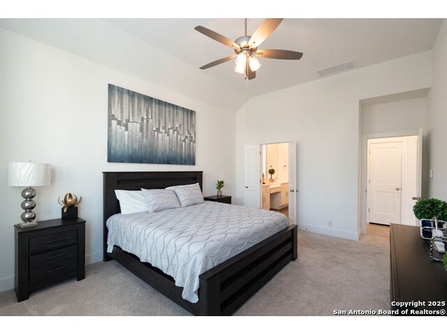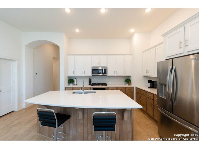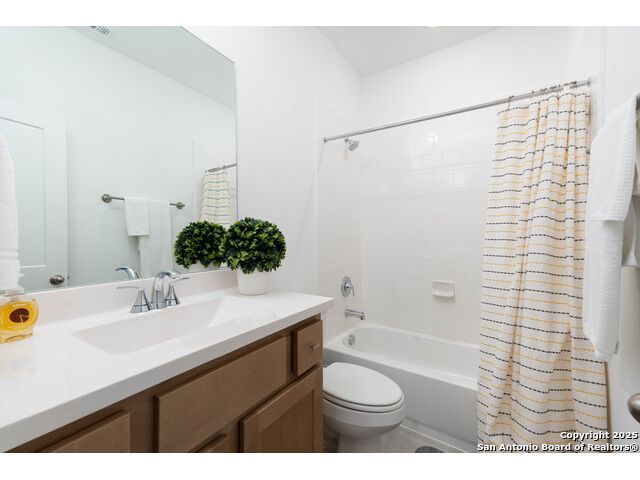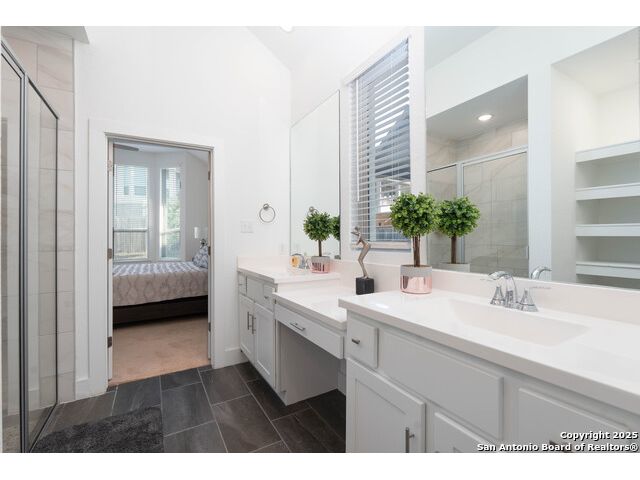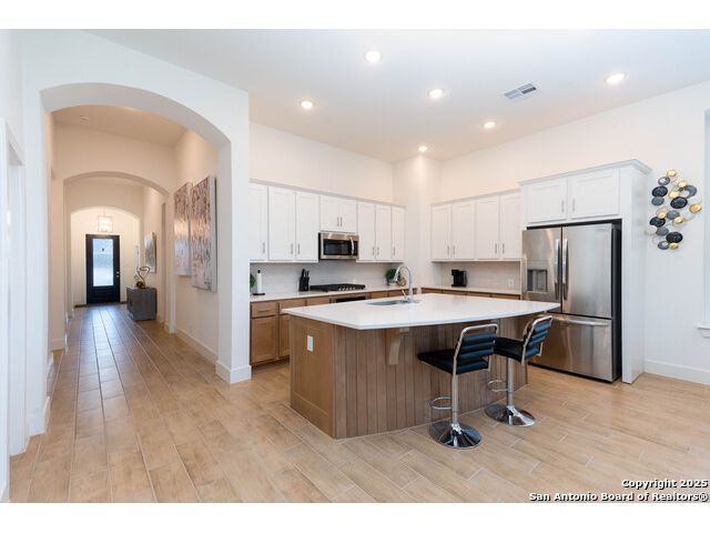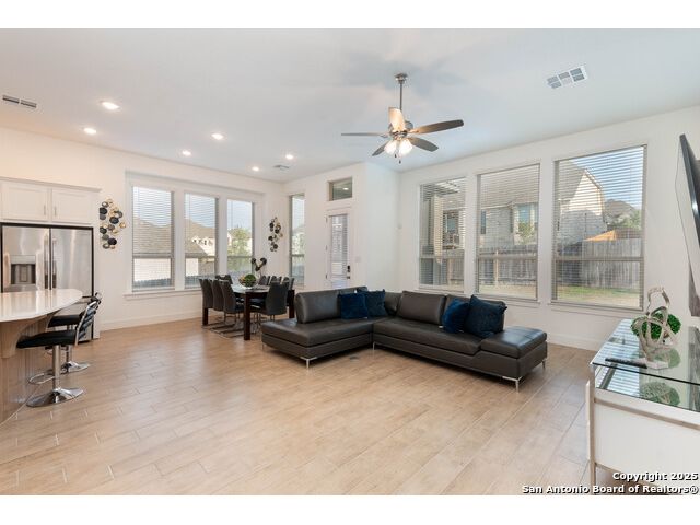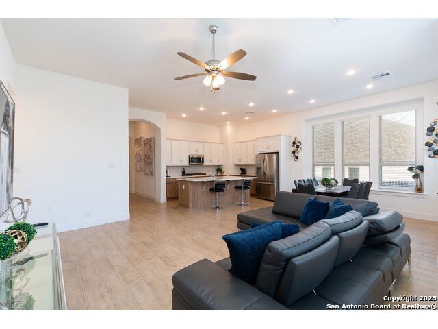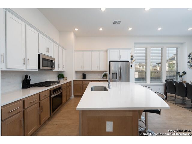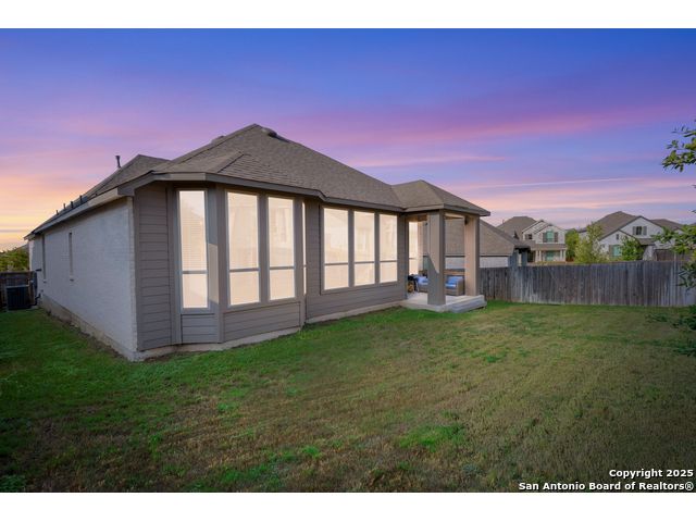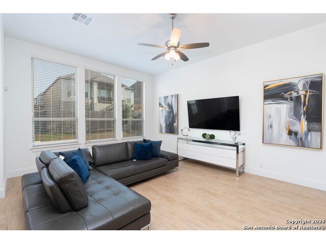 Welcome to this beautifully designed single-story home in the sought-after Weston Oaks community, where modern style meets everyday functionality. From the inviting brick exterior to the thoughtfully crafted interior, this home offers comfort and elegance at every turn. Step into an open floor plan filled with natural light, featuring a spacious living room with large windows overlooking the backyard. The front flex room adds versatility and can easily serve as a private office, study, or media room. The gourmet kitchen is a true centerpiece, complete with an oversized island, sleek counters, stainless steel appliances, and abundant cabinetry-perfect for both entertaining and casual family meals. The private primary suite boasts a bay window, generous walk-in closet, and spa-like bath with dual vanities and a large walk-in shower. Secondary bedrooms provide versatility for guests, family, or hobbies. Outdoors, enjoy a covered patio that flows into a sizable backyard, ideal for summer barbecues, kids' play, or simply relaxing under the Texas sky. Located near major highways, Lackland AFB, and shopping, this home delivers the best of convenience and community living.