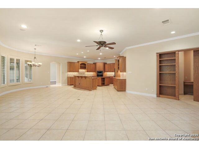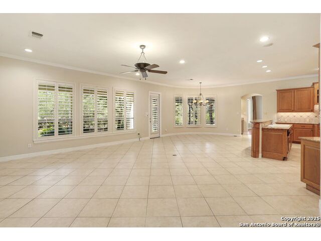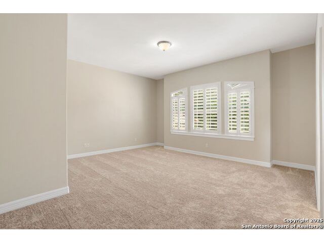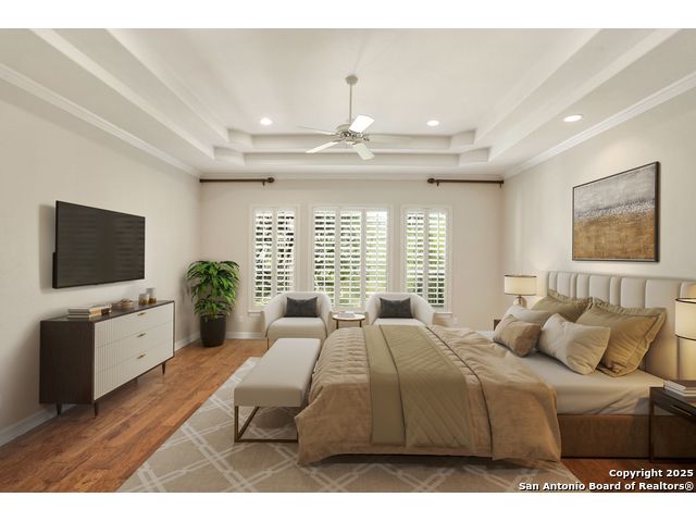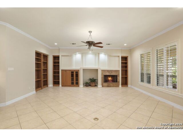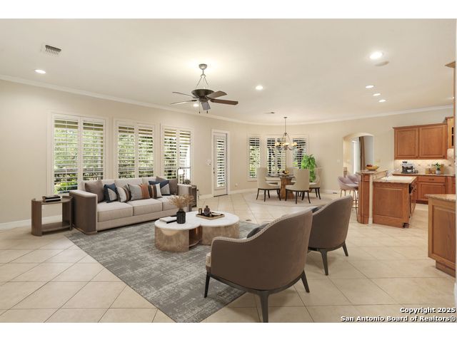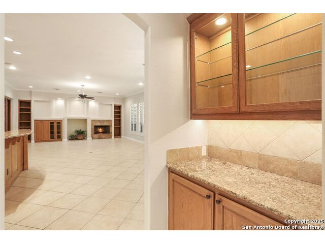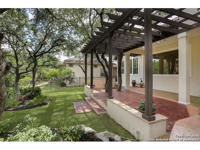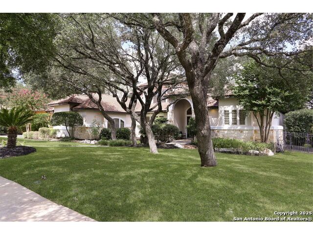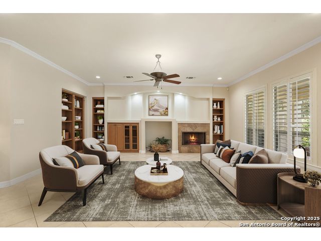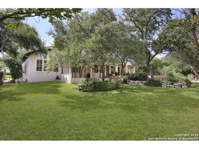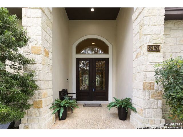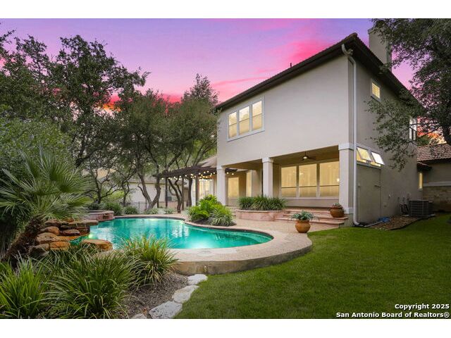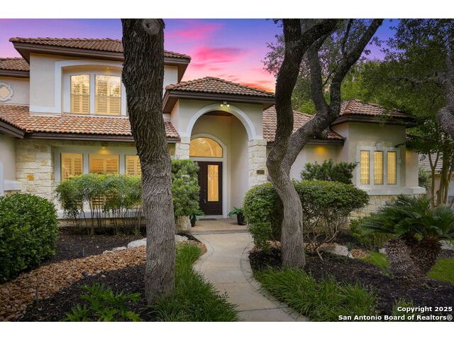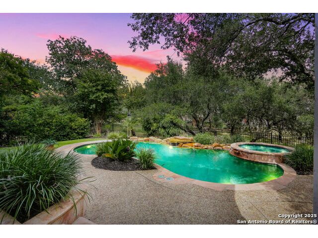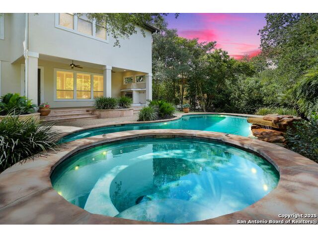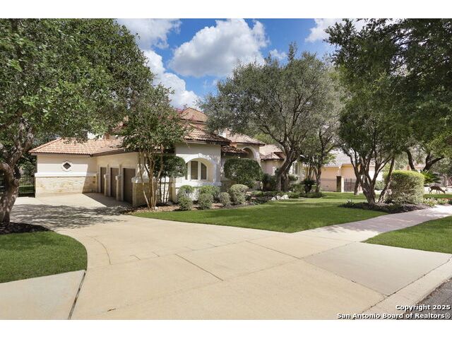 Location. Luxury. Lifestyle. Looking for the perfect blend of luxury living, unbeatable location and top-tier security? Welcome to The Estates of Canyon Springs- a prestigious guard-gated golf course community just north of Stone Oak. This exquisite one-owner Burdick Custom Home, set on a private greenbelt lot, is the ultimate expression of refined Hill Country living. Step inside and be captivated by the grand entry, flanked by a formal living and/or dining area-ideal for elegant entertaining or intimate family gatherings. The chef's kitchen is a culinary masterpiece, featuring abundant white oak custom cabinetry, a large center island, gas cooking, double ovens, a built-in refrigerator and thoughtful finishes that make cooking a joy. The open-concept great room impresses with a decorative TV wall and custom built-ins, including a hidden bookcase that leads to a secret study-a unique touch that adds both charm and function. Designed with privacy in mind, the primary suite is its own secluded retreat, complete with two generous walk-in closets, built-in drawer storage and a spa-like bath featuring a soaking tub and walk-in shower for the ultimate relaxation. A private guest suite is also located on the main level-perfect for multigenerational living or overnight visitors. Upstairs, you'll find three spacious secondary bedrooms (all with walk-in closets), two full baths (including an ensuite and a Jack-and-Jill), and an oversized game room-ideal for movie nights, gaming or homework zones. Step outside to your private backyard paradise. Lush landscaping surrounds a sparkling Keith Zars pool with a tranquil waterfall, attached hot tub and an expansive covered patio with a cozy outdoor fireplace. The extended pavilion is already outfitted with a gas hook-up-ready for your dream outdoor kitchen. Architectural details abound-from crown molding and plantation shutters to a water softener and more-this home is built for comfort, style and enduring quality. Luxury, Privacy and Timeless Elegance. Highly rated NEISD schools. Don't miss your chance to own a home that truly has it all.